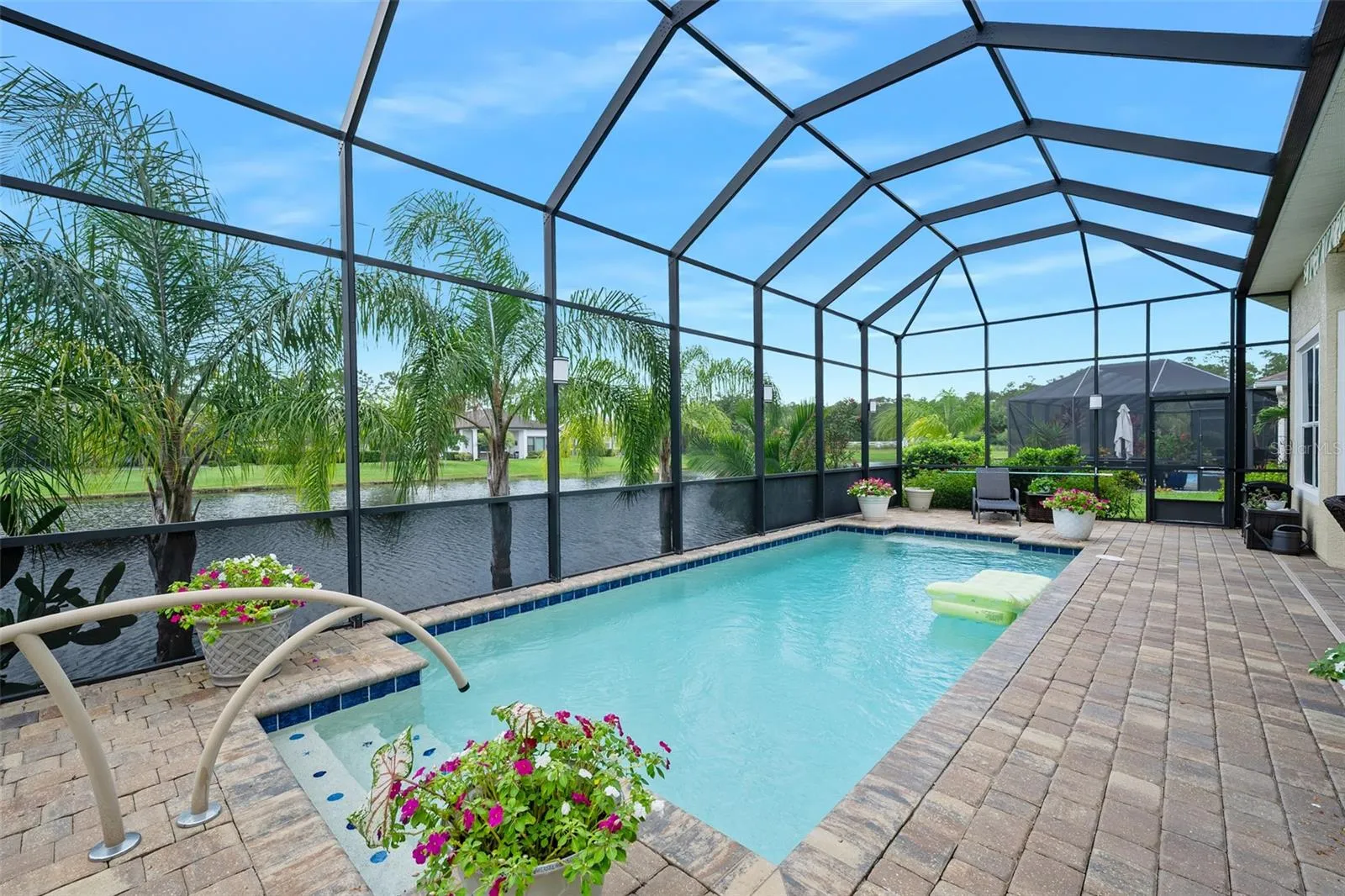 The beautiful kitchen is a chef’s dream with granite countertops, tile backsplash, stainless steel appliances, wood cabinetry, oversized lighted pantry, and a counter-height island that opens to the spacious great room. A charming breakfast nook provides peaceful views of the pool and lake. Triple sliders lead to a generous screened lanai complete with a well-equipped outdoor kitchen, remote control awning, and a sparkling pool, creating the ideal space for entertaining or relaxing. The private owner’s suite is a true retreat, offering his-and-her walk-in closets, dual split vanities, a soaking tub, and a walk-in tile shower. Additional highlights include plantation shutters, electric blinds, recessed lighting, well irrigation, and more. Plantation Bay is a premier Golf & Country Club community offering optional membership packages with access to 45 holes of championship golf, a world-class tennis facility with 10 clay courts, two clubhouses, fitness center and spa, pickleball courts, resort-style pool, two restaurants, and an active social calendar.