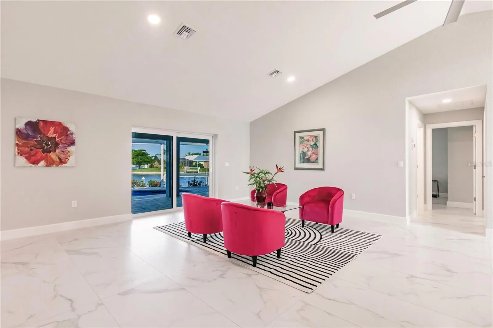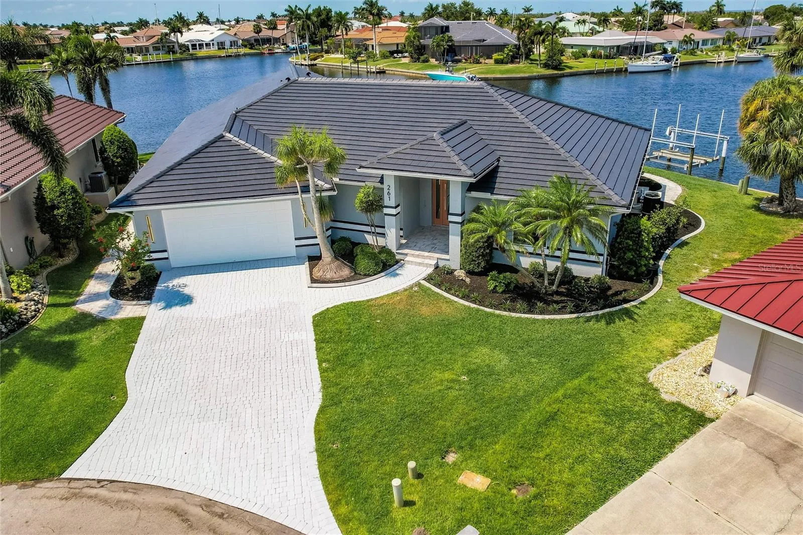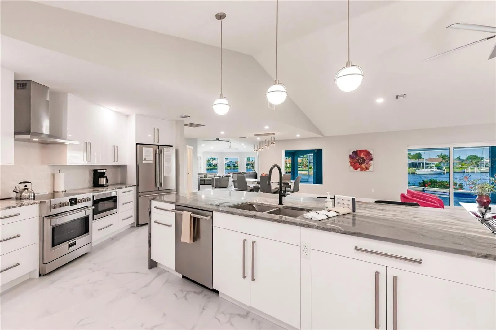Under contract-accepting backup offers. Welcome to your turn-key 2024 Renovated Waterfront Oasis, where every detail whispers of luxury and relaxation. Nestled just 5 MINUTES away from the bustling harbor, this haven boasts 175 feet of serene SAILBOAT waterfront, offering a front-row seat to a paradise that is exclusively yours to enjoy. Venezia makes for the perfect ready Airbnb. IMPACT WINDOWS AND DOORS offer peace of mind year-round. Lasting up to 50 years, the newly installed CONCRETE ROOF offers additional protection for a homeowner! Stepping inside this NEWLY PAINTED & RE-STUCCOED sanctuary, you are greeted by 2,911 square feet of meticulously crafted living space. With 3 large bedrooms and 2 full baths, along with 2 half baths, there’s room for everyone to unwind in comfort. Porcelain tile floors gleam throughout the home, leading you to a gorgeous living area adorned with large picture windows and sliding glass doors that frame the breathtaking views of your waterfront property. Entertaining is effortless and enjoyable for all. The gourmet kitchen is adorned with high gloss, solid wood European cabinets that softly close, brushed nickel cabinet pulls, a spacious walk-in pantry with cabinetry, and sleek Fulgor Milano Sophia appliances, including an induction range that beckons the inner chef within you. Admire the beautiful water view from the heated poolside oasis, where a resurfaced heated swimming pool with spa awaits, enclosed by a pool cage with no see um screen for uninterrupted enjoyment! As we retreat to the master suite, a deck invites you to sip your morning coffee while soaking in the surroundings. With a view that relaxes, further pamper yourself in the large ensuite bath, featuring Ratel toilets, Kohler sinks, and a Halo water filtration system. A concrete dock with an 18,000 lb. lift awaits the avid boater, ensuring total access to the water below. This property also has a front-row seat to the yearly festive Christmas Boat Parade that has become a staple in this community. Indulge in the finer things in life at this turn-key waterfront retreat, where every amenity has been thoughtfully curated for your utmost enjoyment. Welcome home to luxury living, where every day feels like a vacation.