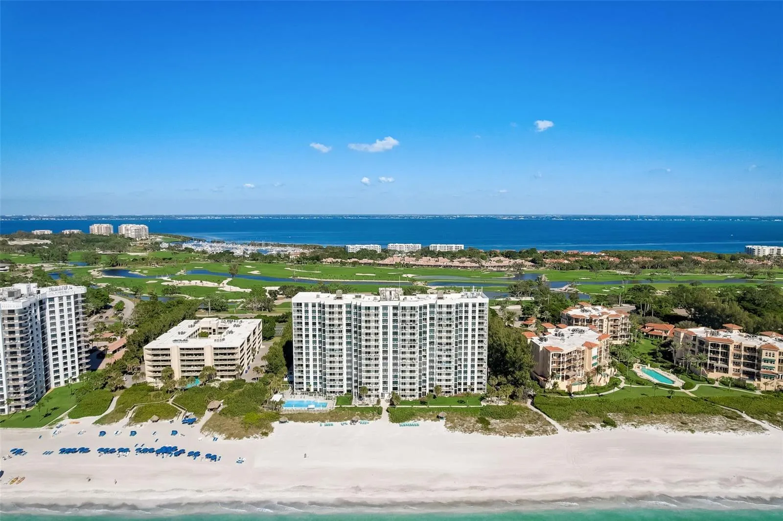 BREATHTAKING WATER VIEWS FROM EVERY ROOM! Enjoy nightly sunsets from your private balcony in this beautifully updated 14th-floor condominium. This highly sought-after two-bedroom, two-bath split floorplan offers the perfect blend of privacy and open living. Each bedroom is positioned on opposite sides of the unit, creating an ideal layout for guests or remote work. Recent upgrades include Hurricane Impact Windows (2021), new flooring in both bedrooms (2021), updated bathrooms, fresh paint (2021), and an A/C system replaced in 2015. The convenience of an in-unit washer and dryer, a dedicated parking space, and ample guest parking add to the comfort of this coastal retreat. The beach and heated pool are just steps from your building, creating a true resort-style experience. Enjoy premium amenities such as a tennis court, air-conditioned bike room, kayak/paddleboard storage, clubhouse with kitchen, library/meeting space, and a fully equipped fitness center. Located within walking distance to Publix, CVS, places of worship, banks, the public library, and Town Hall. Just minutes to St. Armands Circle, where you’ll find world-class dining and shopping. Immerse yourself in Sarasota’s rich cultural scene with easy access to the Sarasota Opera, Ballet, Ringling Museum, Selby Gardens, and numerous art galleries and theaters.