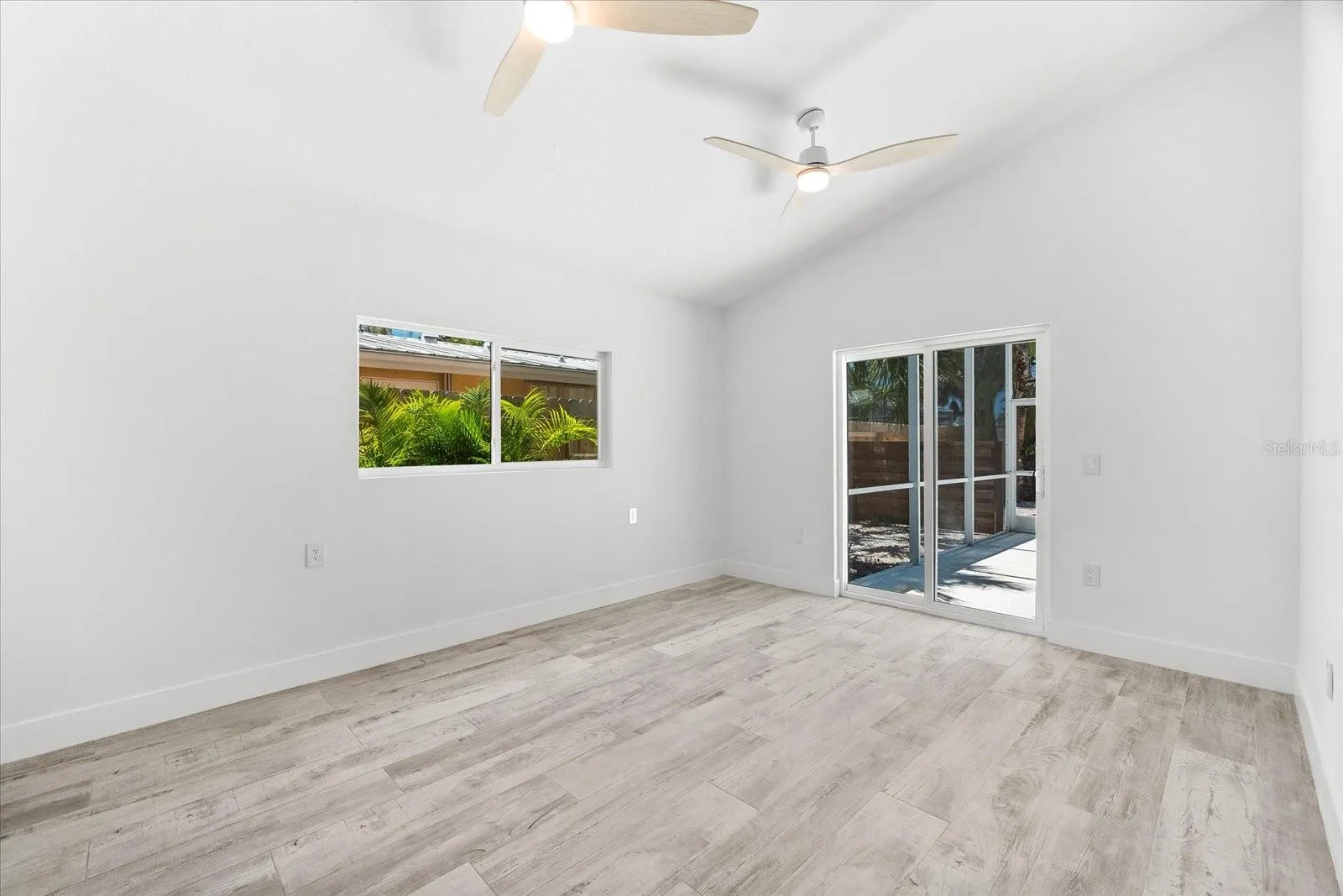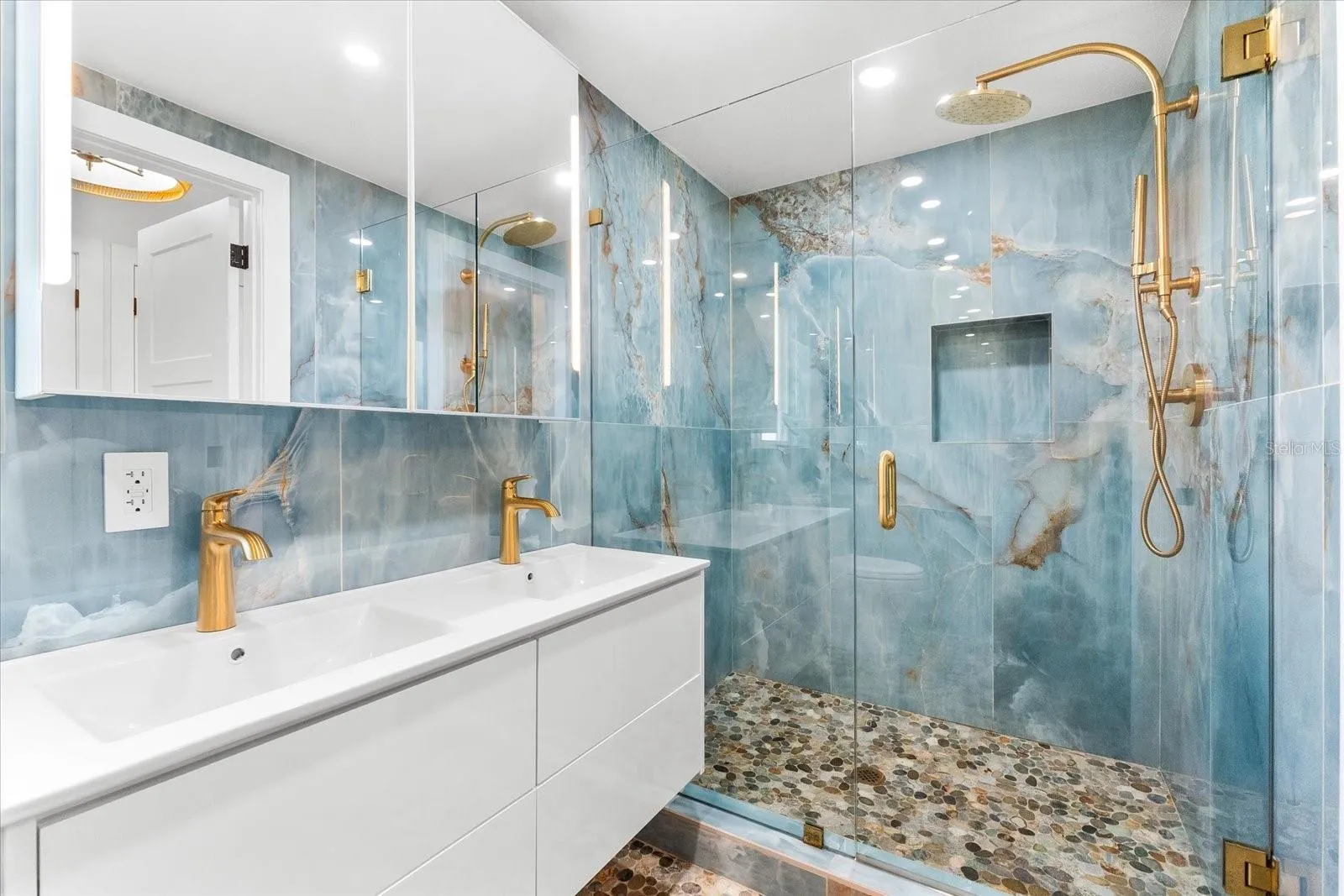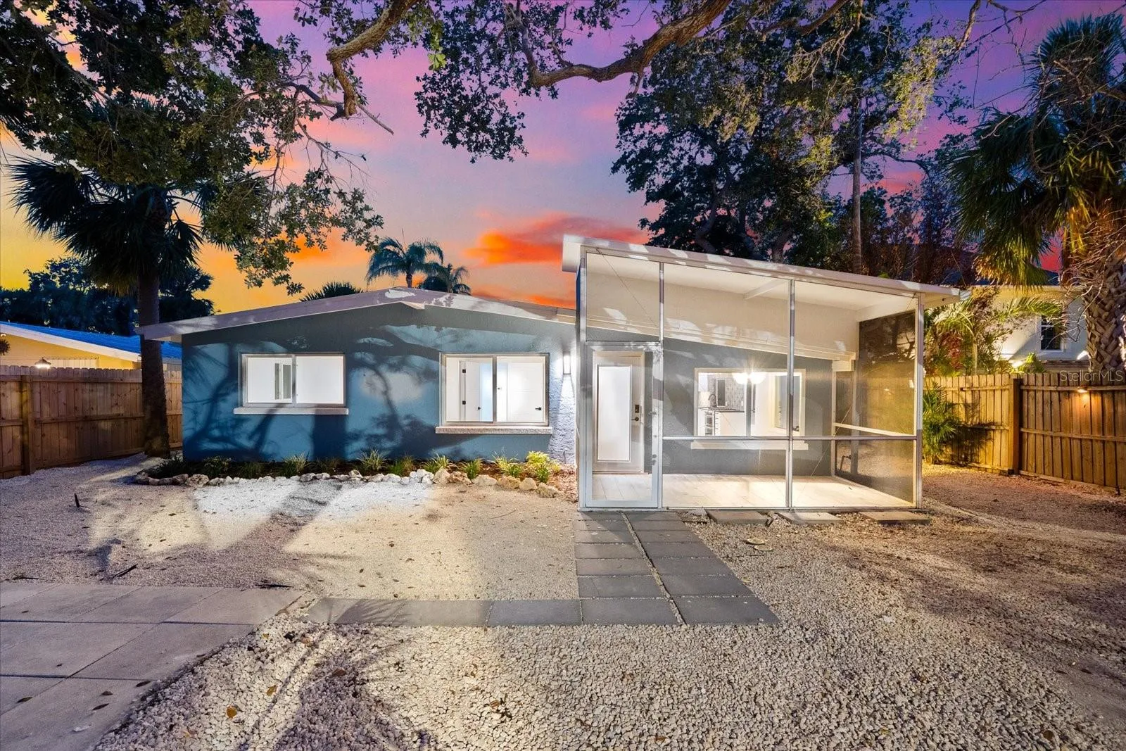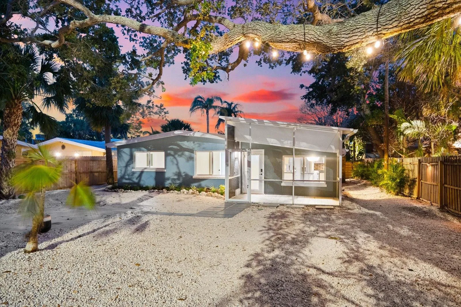 One or more photo(s) has been virtually staged. Incredible Value! Don’t miss this one! Buy now and enjoy for season. Welcome to The Blue Lagoon… when you walk in it feels like new construction! A private modern coastal retreat perfectly positioned on Siesta Key’s tranquil Heron Lagoon… the ultimate vacation home or investment property. This exceptional, gated quarter-acre compound offers the rare combination of serenity, design, and functionality, ideally located between Turtle Beach and Crescent Beach, just moments from the iconic Point of Rocks. Enter through a secure electric gate framed by custom wood fencing and arrive under a majestic live oak canopy that sets the tone for the natural beauty and privacy within. Designed to maximize indoor-outdoor living, the home features two expansive screened lanais, a sparkling private pool, an extensive wood deck, lush tropical landscaping, and a private dock where you can launch a paddleboard, kayak, or canoe directly into the peaceful lagoon. The single-level custom residence offers a thoughtfully designed 3-bedroom, 2-bath layout with wide-plank wood-look tile flooring in soft white and gray tones, crisp white walls, black metal hardware, and premium wood and metal ceiling fans throughout. Soaring ceilings are clad in hand-cut cypress wood shiplap, adding both natural warmth and acoustic insulation. The gourmet kitchen is a chef’s dream, featuring high-gloss European cabinetry, quartz countertops, a striking wood-grain tile backsplash, and Café Series stainless steel appliances including a six-burner gas range with a double oven and a counter-depth French door refrigerator with filtered and instant hot water. A whole-home water filtration system ensures pure water at every tap. The spacious master suite is a true sanctuary with a double-closet hallway, soaring ceilings, and a large window and sliding glass door that open to the lanai. The spa-inspired en suite bath features floating dual white European vanities, a luxurious rainwater shower with Kohler gold fixtures, floor-to-ceiling “blue skies” tile, and organic gray cobbled stone flooring. The peaceful sound of rainfall on the metal roof at the rear of the home enhances the retreat-like experience. The guest bath offers equally sophisticated design, with iridescent honeycomb tile behind a deep soaking tub and rich gray tilework throughout.