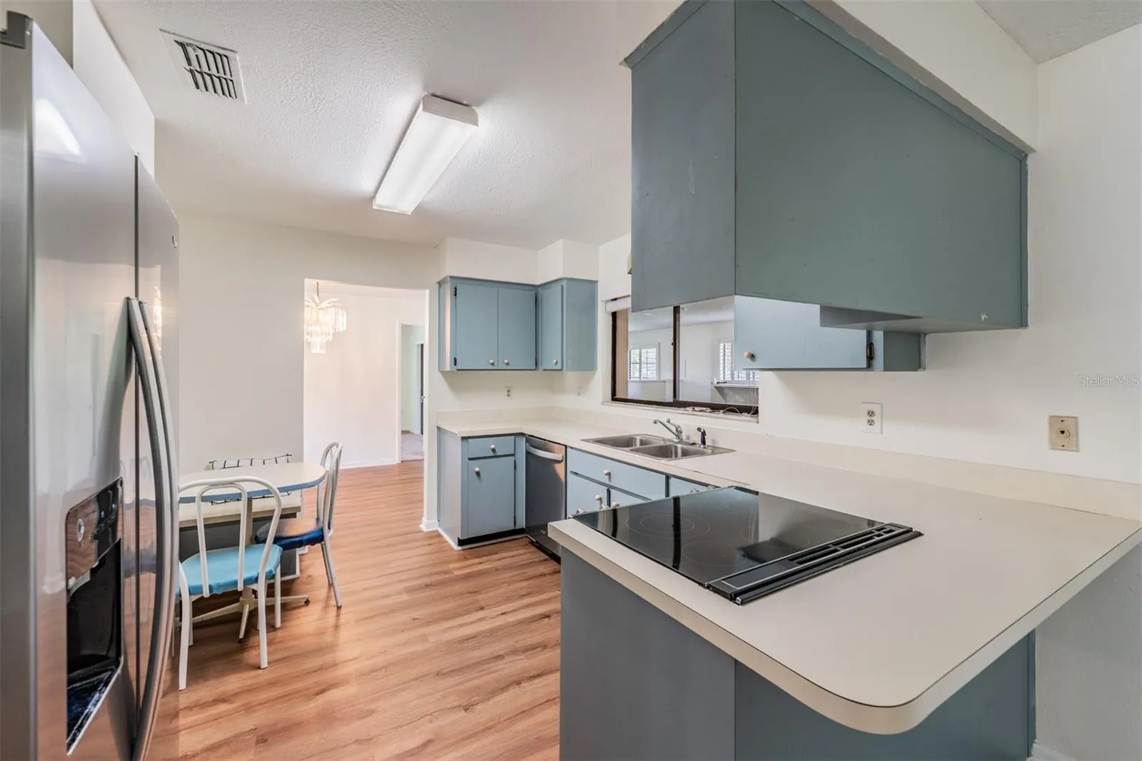 Inside, durable wood-look flooring carries through most spaces. An L-shaped living/dining room welcomes guests, while the central kitchen anchors the home with a built-in bench breakfast nook, pass-through, and direct access to the great room. The private primary suite features a deep walk-in closet and updated ensuite (shower). On the opposite side, an expansive great room offers space for movie nights or a casual dining nook beside the kitchen. Two secondary bedrooms share a convenient hall bath.