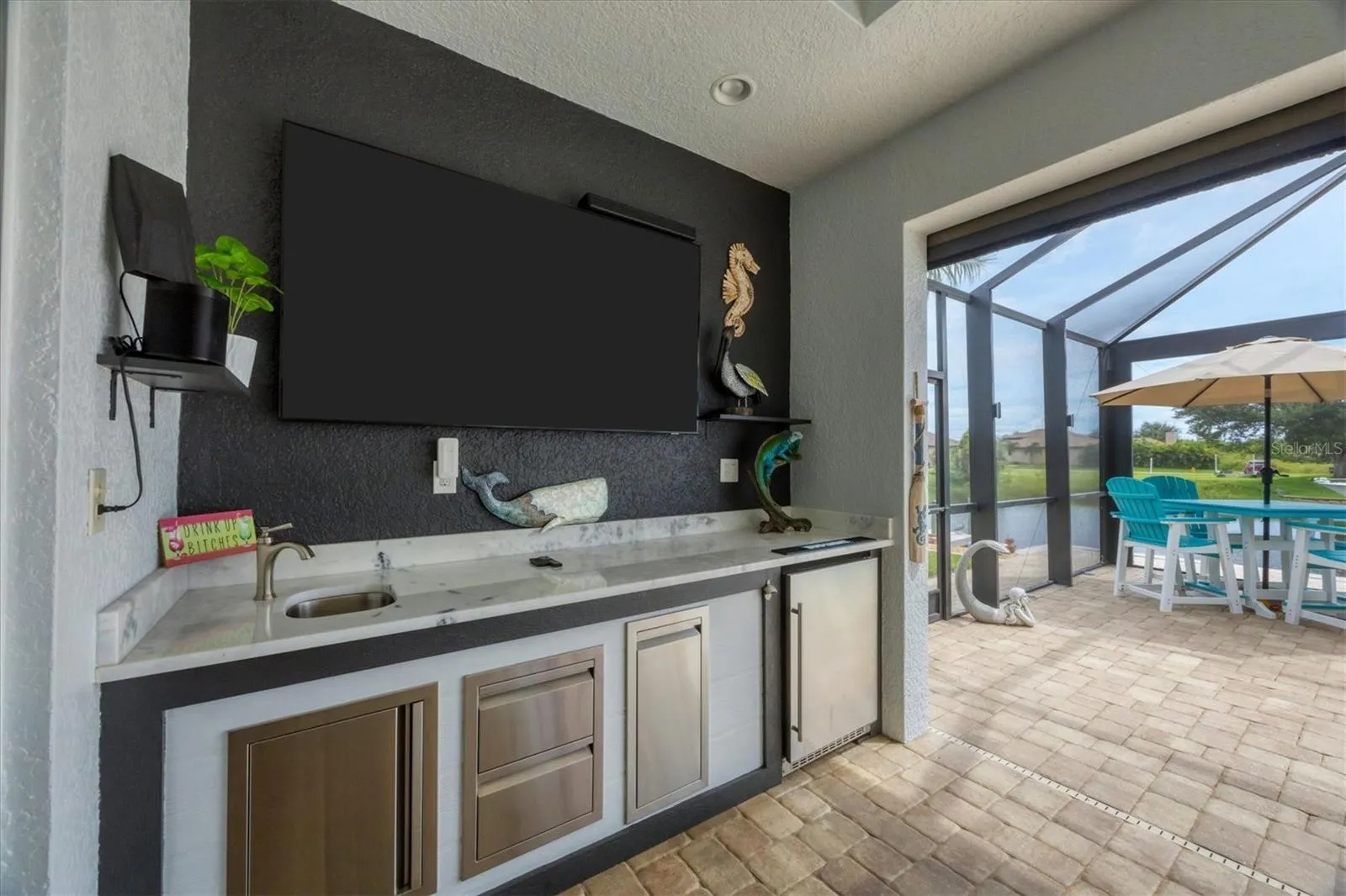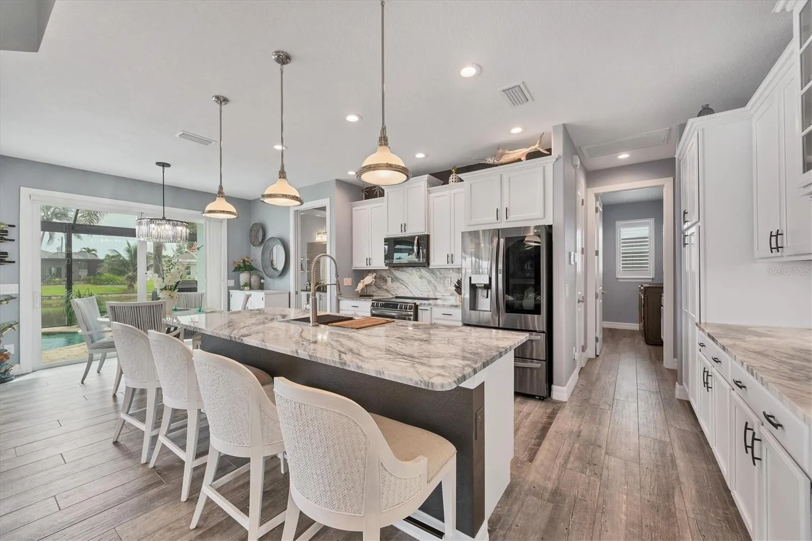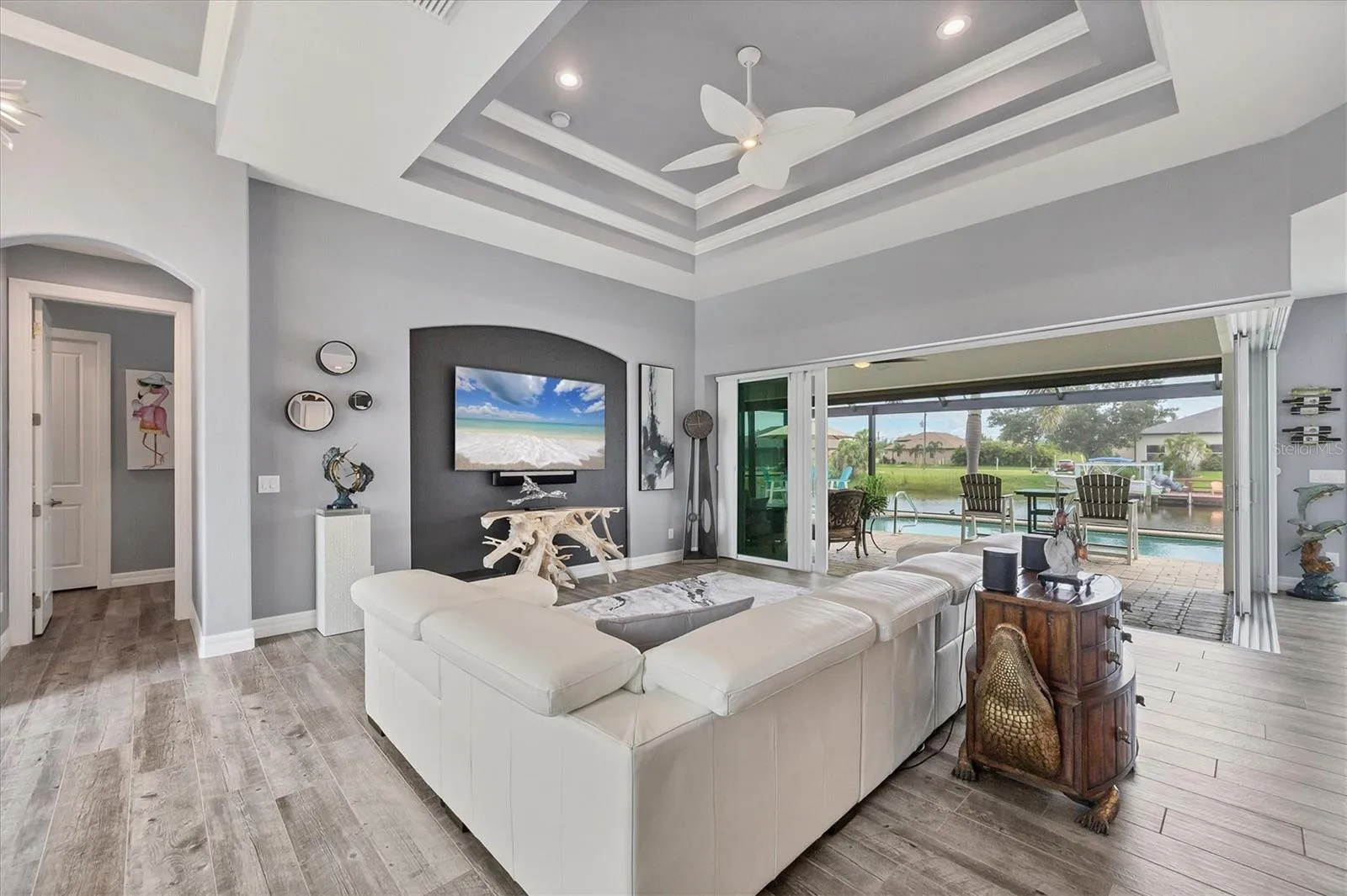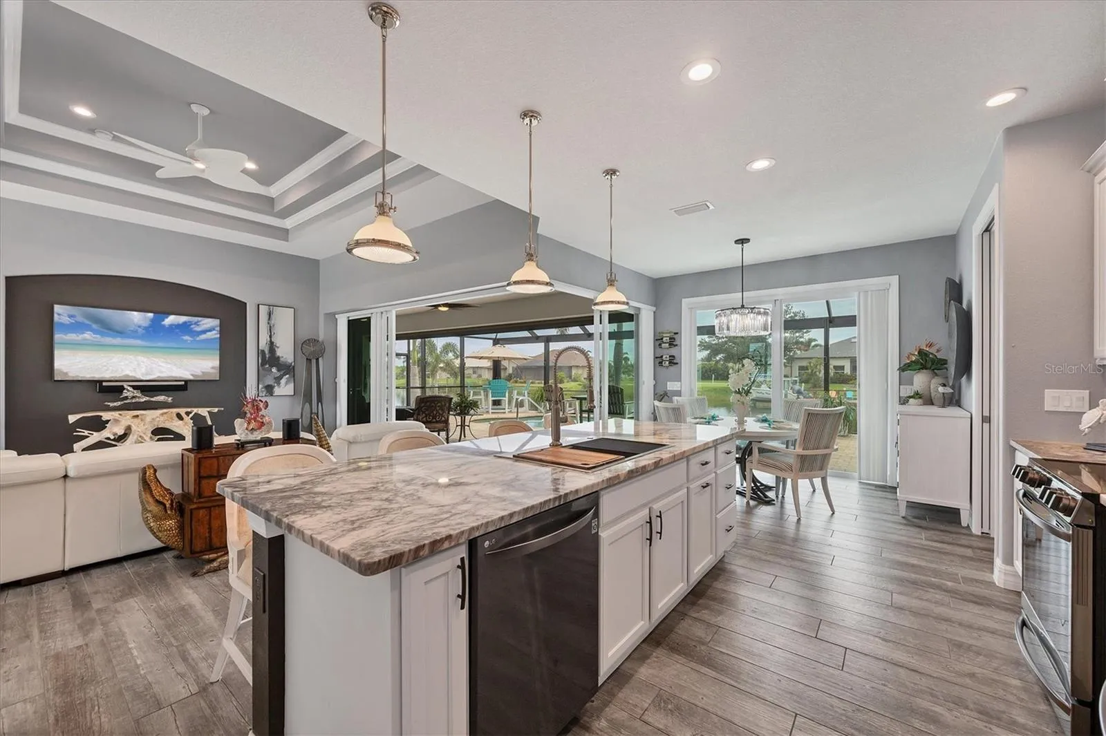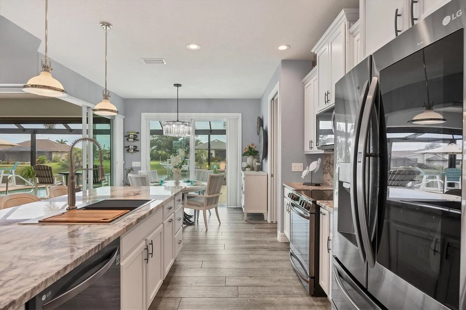 Welcome to coastal perfection in this exceptional custom-built waterfront home, nestled in the coveted South Gulf Cove community. This magnificent residence sits gracefully on a rare double lot, boasting an impressive 213 feet of waterfront, complete with two private docks, a 10,000 lb boat lift, and easy access to open water — your gateway to Boca Grande, Gulf beaches, and world-class fishing. Step into elegance through custom hurricane-rated double doors, where a grand open floor plan unfolds before you. Designed for both everyday living and sophisticated entertaining, this home is filled with natural light, highlighted by zero-degree corner sliders that completely disappear — seamlessly blending indoor and outdoor living. Imagine sunset cocktails on the expansive lanai, dips in the heated saltwater pool, and gatherings under the stars. The pavered driveway wraps gracefully around the home all the way to the docks, creating a stunning entrance and effortless functionality. For the culinary enthusiast, the gourmet kitchen is a dream: a center island, upscale stainless steel appliances, rich granite countertops, and cabinetry that’s as beautiful as it is functional. The great room features soaring 14-foot tray ceilings — adding to the drama and spaciousness of this thoughtfully designed floor plan. The master suite is your private retreat, with hurricane-rated sliders that open to the pool and water views. Indulge in a spa-like en suite bathroom with dual vanities and generous walk-in closets. Two additional guest bedrooms, positioned on the opposite wing of the home, offer peaceful privacy for family or visitors. Need space for the toys? You’ll love the 15×48 RV garage, built to accommodate your biggest adventures — boats, campers, or collector vehicles — with plenty of room to spare. Top it all off with peace-of-mind upgrades: hurricane-impact windows and doors, reinforced garage doors, and a brand new roof (2025). Every detail of this home has been meticulously crafted for luxury, safety, and comfort. Paradise is calling. Schedule your private tour of this one-of-a-kind waterfront estate and experience what it feels like to live the Florida dream — in true million-dollar style.