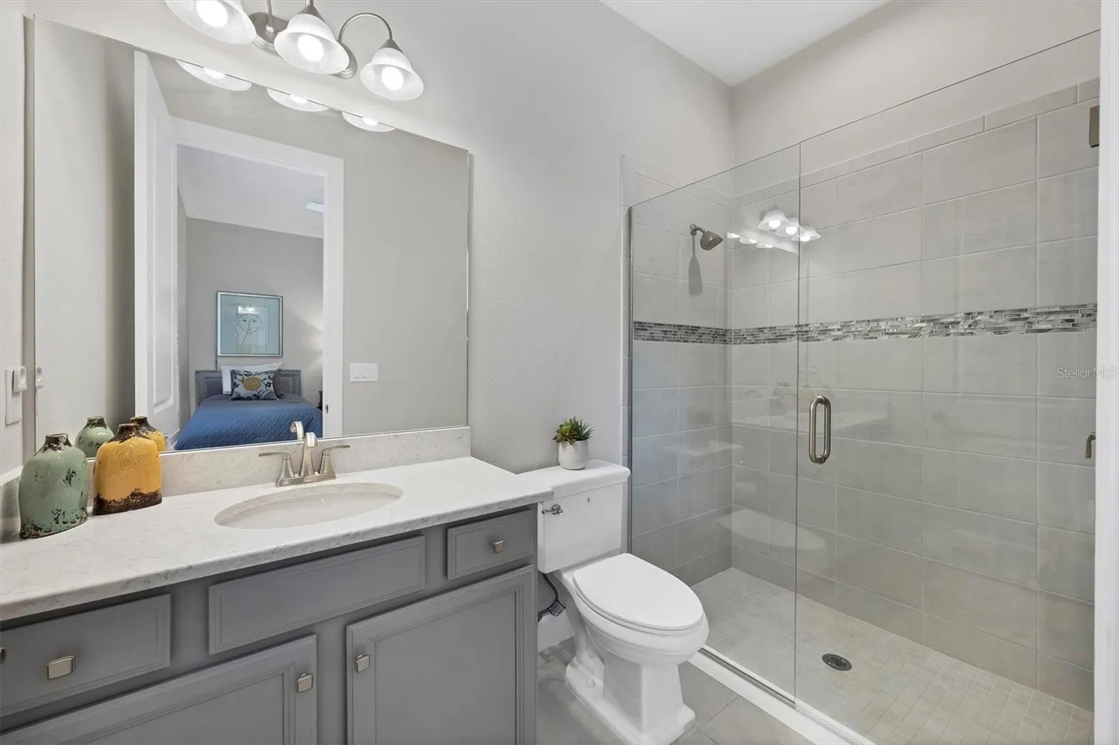 The private owner’s wing delivers a restful retreat with a spa-style frameless walk in shower, dual vanities, and an expansive custom fitted closet. Thoughtful upgrades continue throughout: every closet features custom built-ins for organized living; custom blinds add a polished finish; and a HOA-compliant gutter system supports low-maintenance ownership.