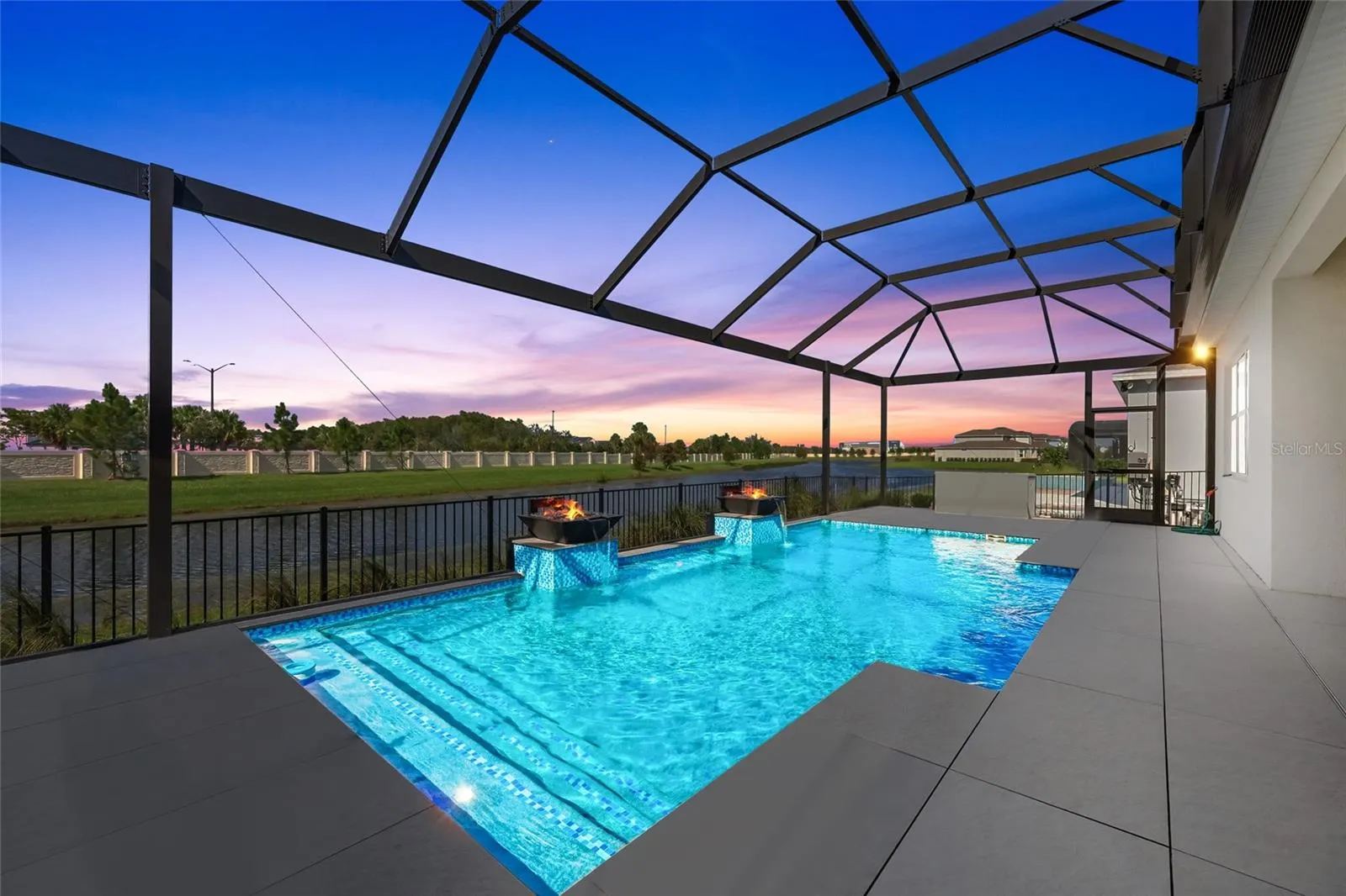 The outdoor upgrades create a private resort experience — a stunning pool with heating and chilling system, cascading fountains, gas fire features, and a fully equipped outdoor kitchen perfect for entertaining.