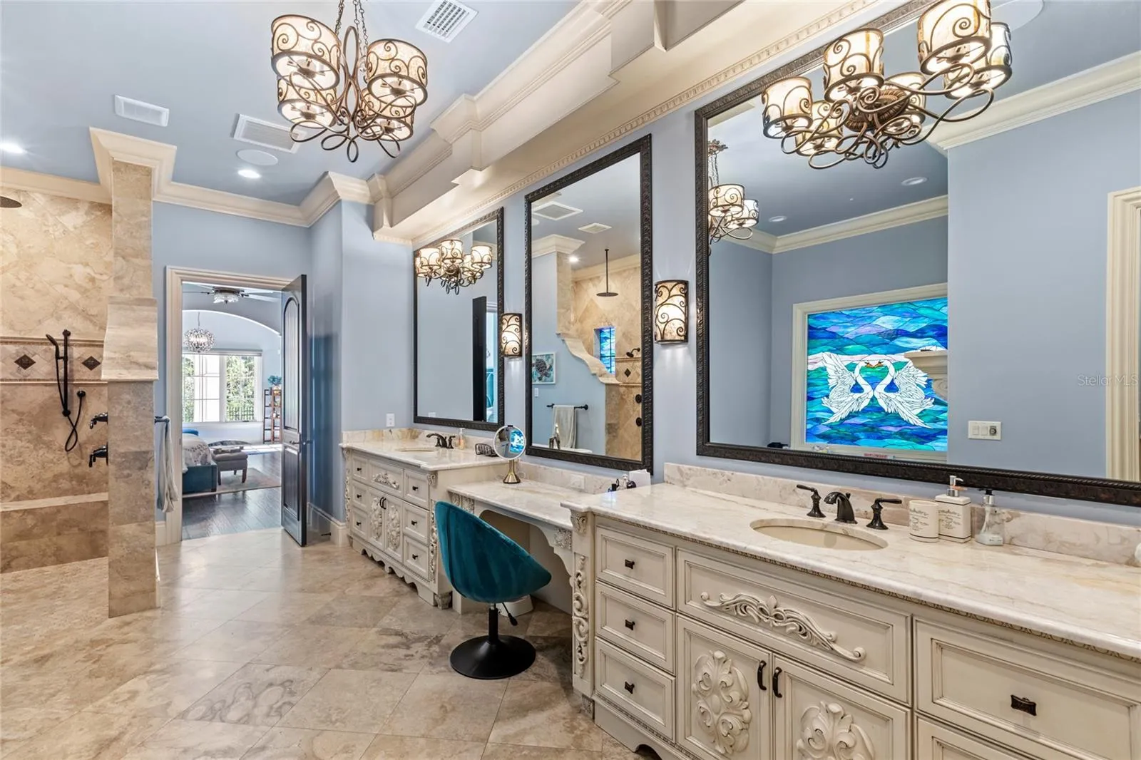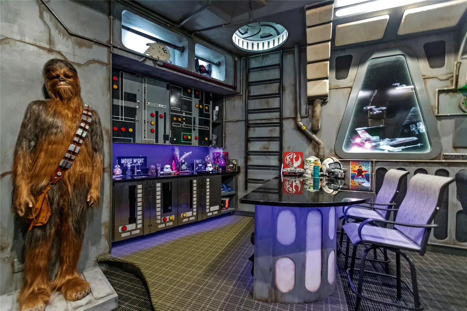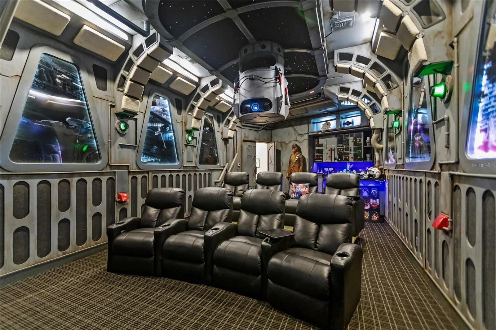 Nestled deep inside the coveted Carolwood neighborhood of Golden Oak at Walt Disney World® Resort, this nearly 11,000 sqft Mediterranean estate offers a rare combination of scale and one-of-a-kind details. Situated on a .79-acre lot, siding and backing to conservation, the home also enjoys serene pond views and ultimate privacy. Inside, soaring ceilings and a sweeping staircase set the tone, anchored by a custom crystal chandelier. A row of Disney-themed stained-glass windows adds a whimsical touch, overlooking the courtyard and sparkling resort-style pool. The chef’s kitchen overlooks a two-story great room and is designed for both function and beauty, featuring top-of-the-line appliances and extensive storage inside custom cabinetry. With 7 bedrooms and 7.2 baths, including a fully detached apartment over the garage, the layout is ideal for family or guests alike. The first-floor master suite is a private retreat, complete with two gas fireplaces, a sitting area overlooking the pool, and a spa bath with soaking tub and walk-in shower. Additional highlights include a Millennium Falcon–inspired theater, temperature-controlled wine room, Toothless pizza oven, an exact replica of the marble fireplace from Cinderella’s Castle apartment, and a massive game room perfect for entertaining, gaming, and/or homeschooling. Outside, the true resort-style setting is unmatched. A pool with grotto, spa, slide, and rock waterfall is complemented by multiple fire pits, expansive covered courtyards, and a summer kitchen for indoor/outdoor living. Car enthusiasts will appreciate the four separate garages, three outfitted with lifts to accommodate up to seven cars. Located just a short drive from Summerhouse and the Four Seasons Resort, this estate offers a rare opportunity to own one of Golden Oak’s most remarkable residences.