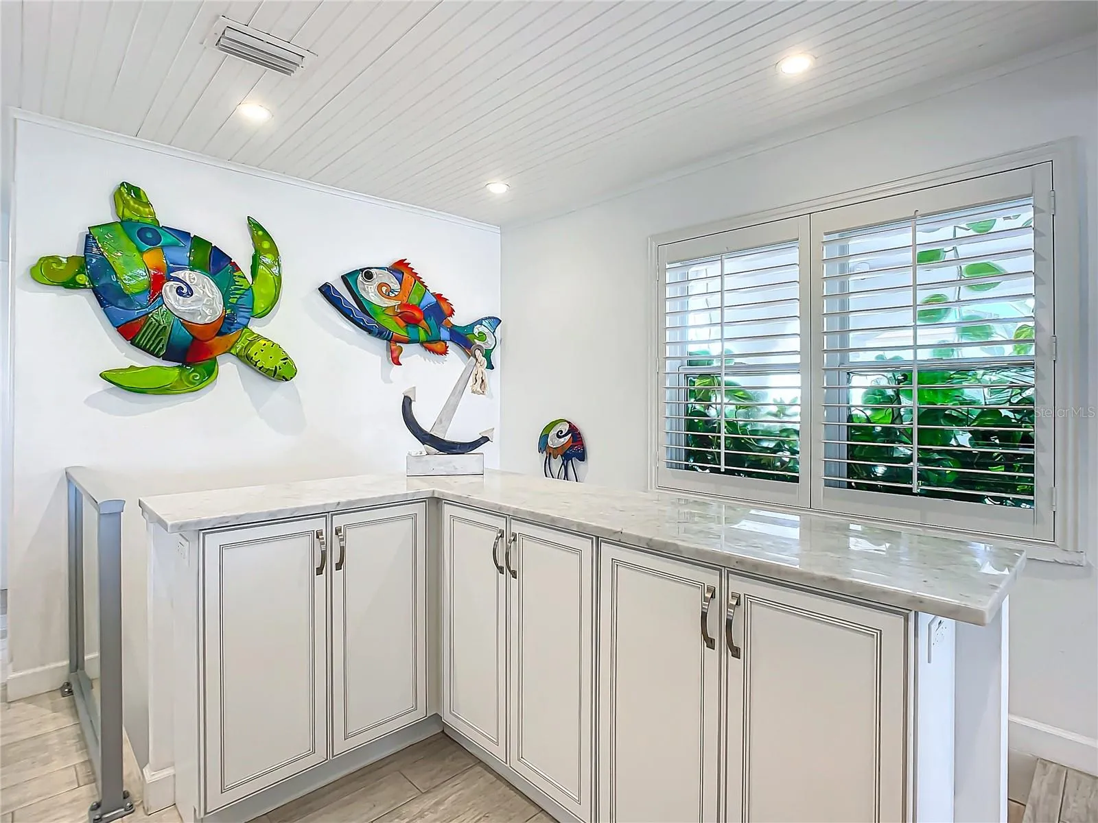 : Ceiling Fans(s), Thermostat, Split Bedroom, Walk-In Closet(s), Crown Molding, Solid Surface Counters, High Ceilings, Eat-in Kitchen, Solid Wood Cabinets, Stone Counters, Accessibility Features, Coffered Ceiling(s)