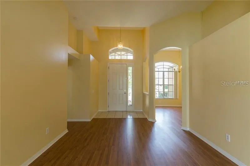Step inside to find a spacious split floor plan with soaring 10–12 ft ceilings, abundant natural light, and fresh new interior paint throughout. The open-concept living and dining areas flow seamlessly, featuring new light fixtures, Pergo and ceramic tile flooring (no carpet), and ceiling fans in most rooms.