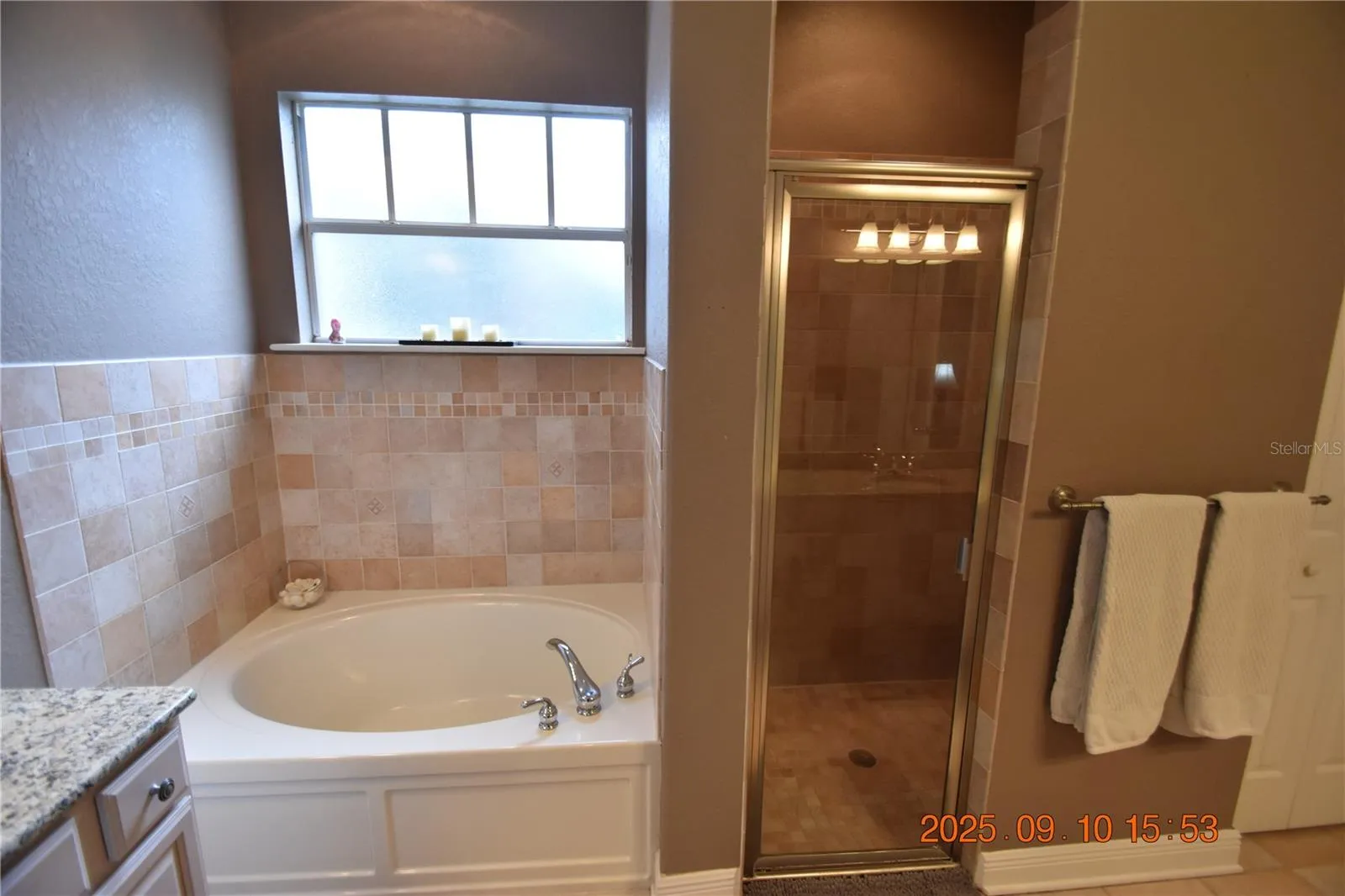 Luxurious master bath with large soaker tub, step in shower, dual vanities, and water closet for the toilet.