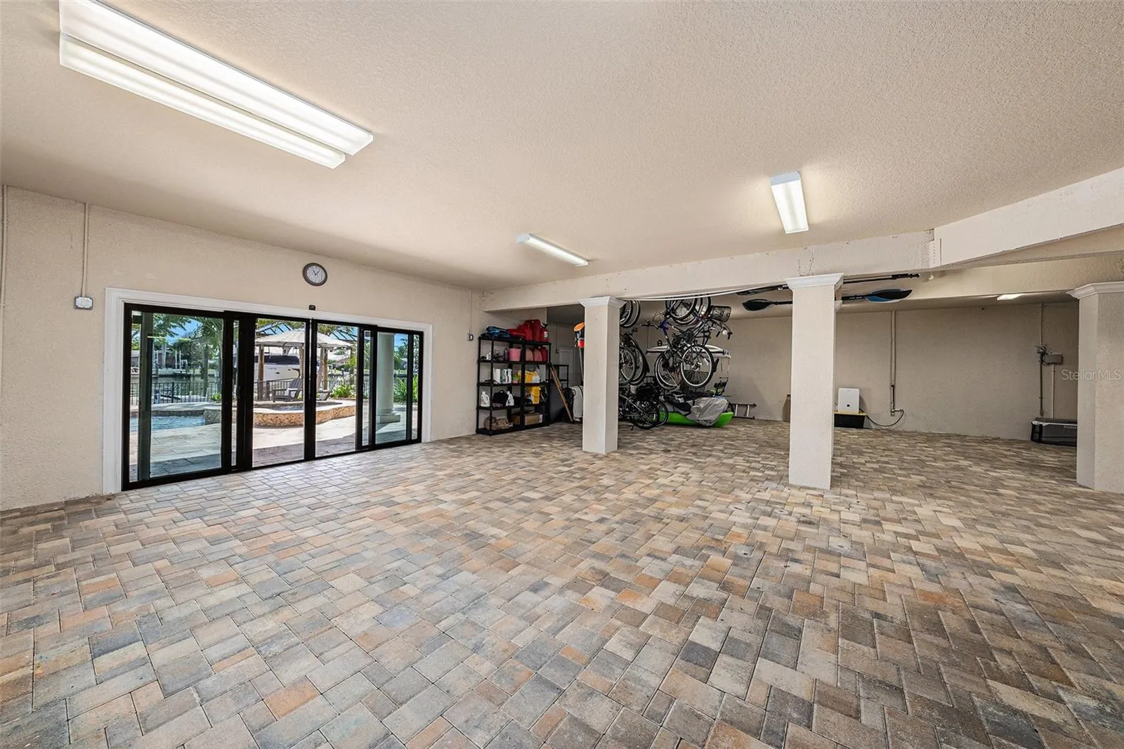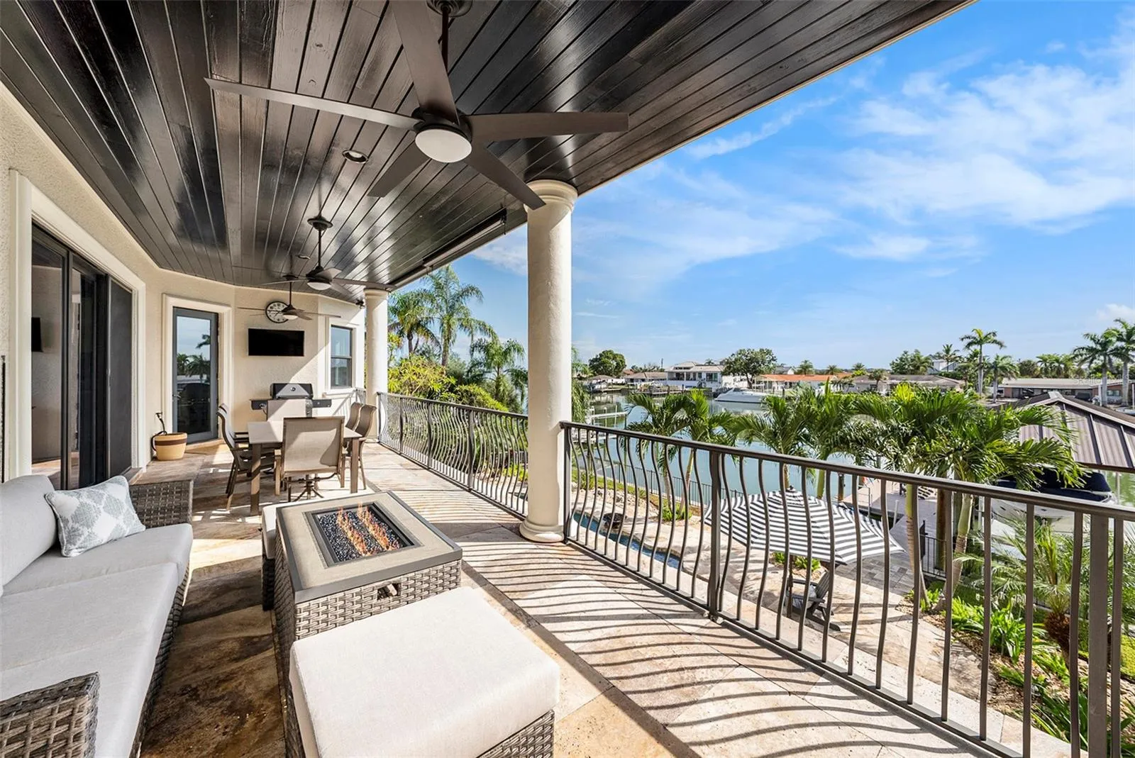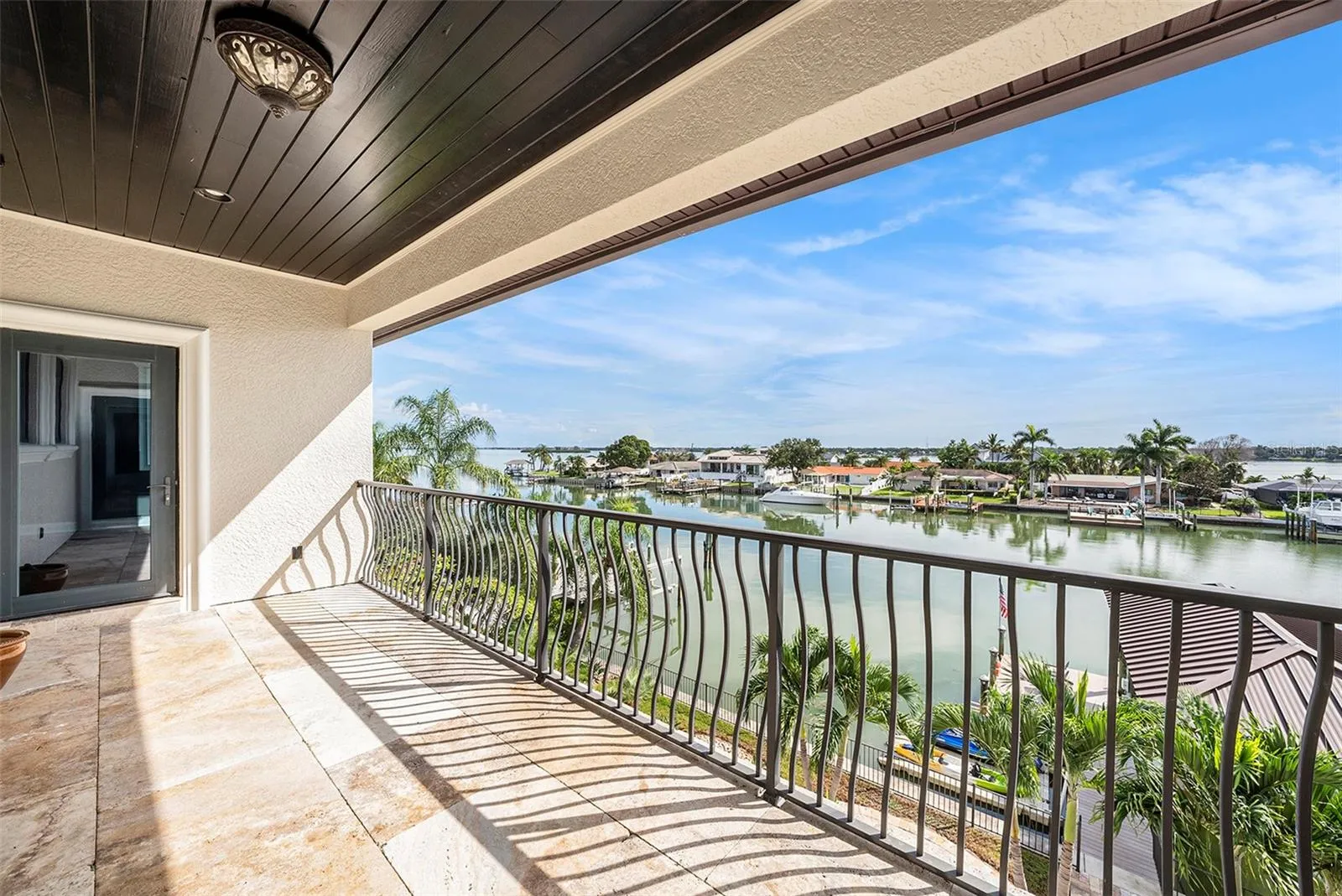 Outdoor living shines, starting when you are greeted by the travertine driveway and a dual staircase leading to a stunning double door entrance, and continues with three expansive travertine terraces overlooking a sparkling saltwater pool and spillover spa. The pool area features two fire pits with cascading waterfalls and accent lighting, creating a dramatic evening ambience. Lush tropical landscaping and a fenced backyard create a private oasis for al fresco dining, quiet reading, or sunset gatherings. Boaters will appreciate the composite deep water dock with full water and electrical service, a 16-ton boat lift, and dual floating jet ski docks. The finished 4-car garage features paver flooring and a large finished flex area currently used as a gym, complete with a closet and half bath, ideal as a fourth bedroom, cabana lounge, craft studio, or media room. Blending old-world Mediterranean charm with the breezy elegance of coastal Florida, this exceptional Clearwater Bay home delivers a lifestyle where every day feels like a seaside getaway and every detail reflects thoughtful design for relaxed waterfront living.