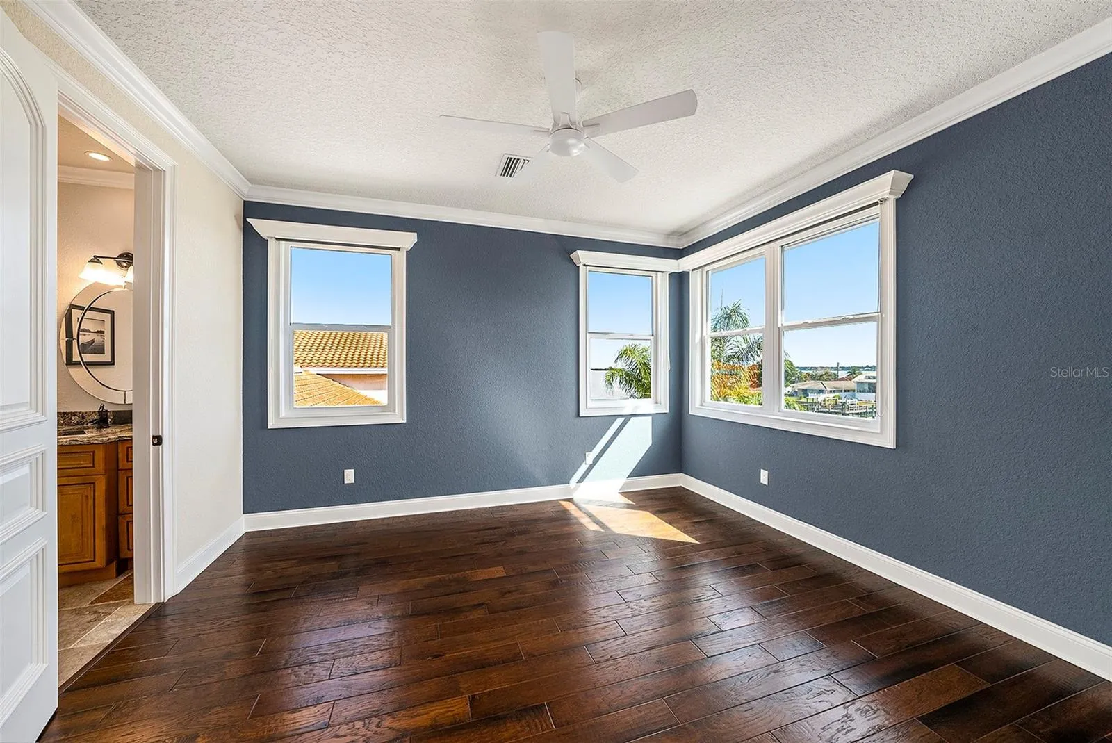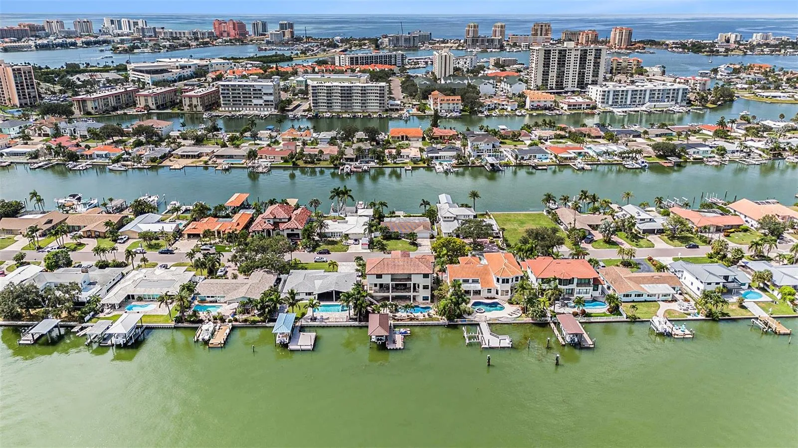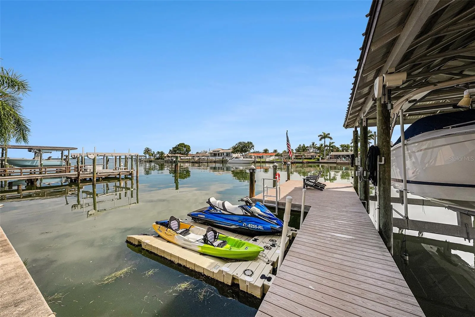 Outdoor living shines, starting when you are greeted by the travertine driveway and a dual staircase leading to a stunning double door entrance, and continues with three expansive travertine terraces overlooking a sparkling saltwater pool and spillover spa. The pool area features two fire pits with cascading waterfalls and accent lighting, creating a dramatic evening ambience. Lush tropical landscaping and a fenced backyard create a private oasis for al fresco dining, quiet reading, or sunset gatherings. Boaters will appreciate the composite deep water dock with full water and electrical service, a 16-ton boat lift, and dual floating jet ski docks. The finished 4-car garage features paver flooring and a large finished flex area currently used as a gym, complete with a closet and half bath, ideal as a fourth bedroom, cabana lounge, craft studio, or media room. Blending old-world Mediterranean charm with the breezy elegance of coastal Florida, this exceptional Clearwater Bay home delivers a lifestyle where every day feels like a seaside getaway and every detail reflects thoughtful design for relaxed waterfront living.