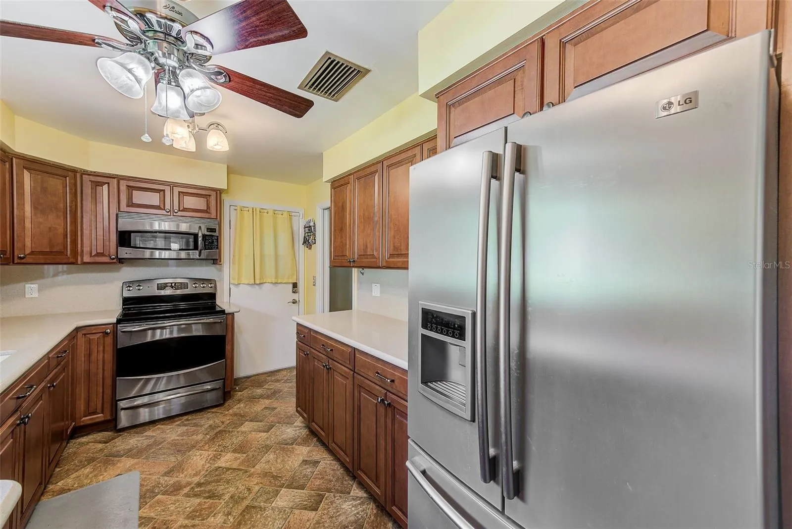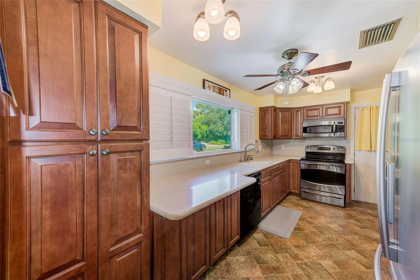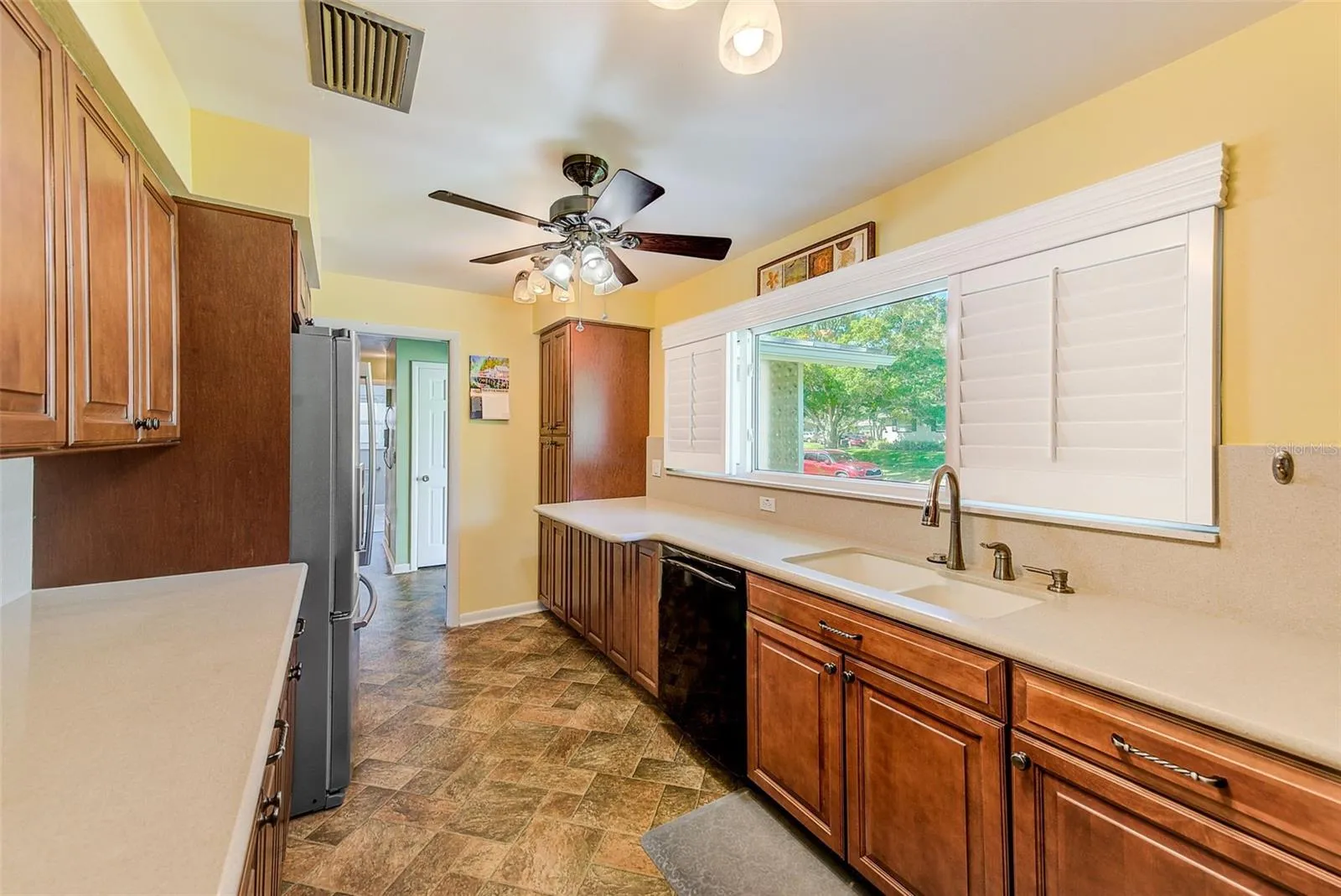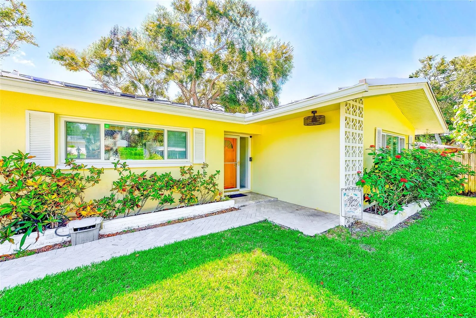 One or more photo(s) has been virtually staged. With this charming and beautifully maintained 3-bedroom, 2-bathroom block home, discover the perfect blend of style, comfort, and peace of mind. Benefit from enormously valuable and thoughtful seller upgrades including a newer metal roof, paid-off solar panels, impact-resistant Stanek windows and a tankless water heater. This home was built to last, keeping energy costs low and property protection and quality of enjoyment high. The spacious and inviting floor plan features a sunroom bathed in natural light, plantation shutters throughout, and two fully remodeled bathrooms that feel fresh, bright and modern. The kitchen features conveniently ample storage and flows seamlessly into the living and dining areas, complete with a handsome centerpiece fireplace, making this home ideal for both quiet nights in and friendly gatherings. Outside, enjoy picture-perfect landscaping, a wind-resistant Tuff Shed for extra storage, and parking made easy with a 1-car garage plus room for two extra vehicles in the driveway. Hurricane tarps for the garage and front door add even more convenience and security. Nestled in a gorgeous, established neighborhood where pride of ownership is unmistakable on every street, this property offers not just a home, but a community you’ll love experiencing every day. Listing Broker to provide a 1-year home warranty from America’s Preferred Home Warranty with fully binding contract acceptable to seller.