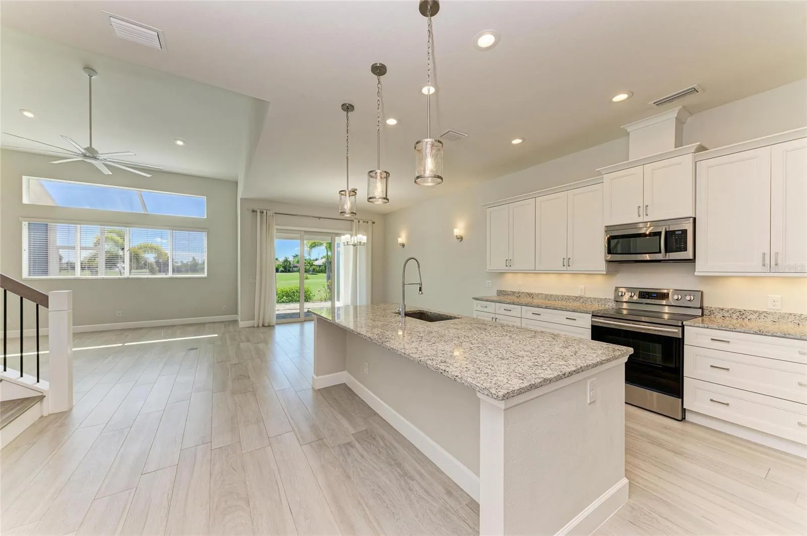 Each residence was built with quality in mind: soaring ceilings, crown molding, porcelain tile flooring, stone counters, custom cabinetry, and hurricane-impact windows and doors provide lasting durability and elegance. The main living areas seamlessly blend indoor and outdoor living, with floor-to-ceiling glass sliders opening to private screened lanais overlooking serene golf course views—a perfect setting for entertaining or enjoying tranquil sunsets.