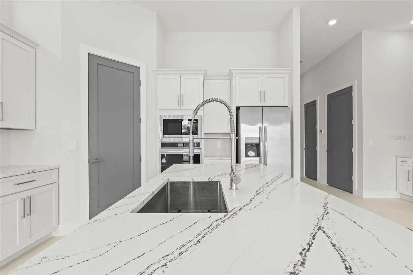 From the moment you enter, the foyer greets you with modern sophistication, setting the tone for what lies ahead. The open-concept living and dining areas are bathed in natural light, featuring sleek contemporary design, glass doors framing stunning golf views, and a custom-built bar perfect for entertaining. The chef’s dream kitchen is a masterpiece of form and function, equipped with top-of-the-line stainless steel appliances, a striking island, ovens, and bespoke light fixtures that make every gathering a celebration.