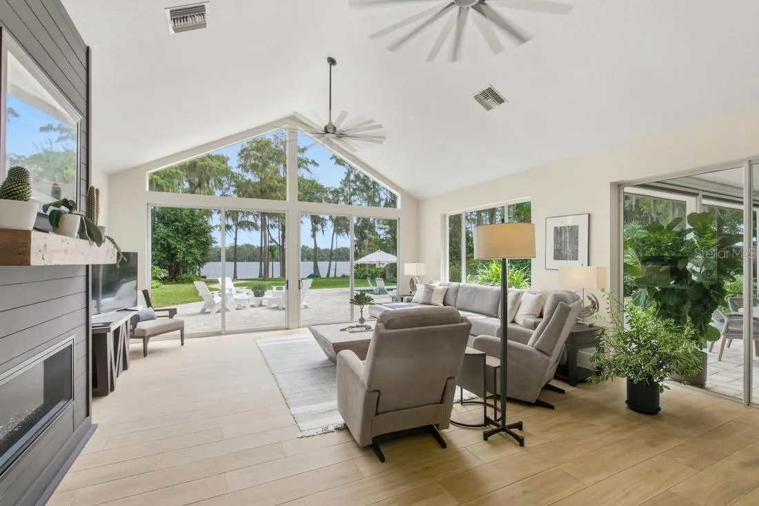 Indoor-outdoor flow shines with a heated pool (2022), pavered deck, retractable screened porch, and outdoor shower. Long water views, mature oaks, and ample cleared space make this property as beautiful as it is functional. A rare combination of land, lakefront lifestyle, storage capacity, and renovated interiors — minutes from East Orlando, 408 + 417.