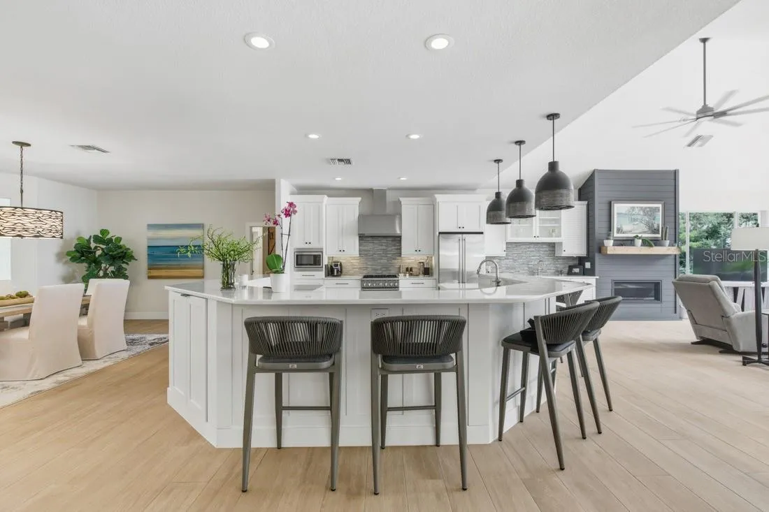 The 4,094 Sq Ft renovated home features 4 beds/4 baths, including a private upstairs retreat, a 3-way split layout for privacy, and a separate guest wing perfect for multigenerational living. The 2023 central kitchen anchors open living and dining spaces with sliders framing lake views. White-oak wood-look tile runs throughout the main floor, and the 2023 primary suite delivers a calm, modern retreat.