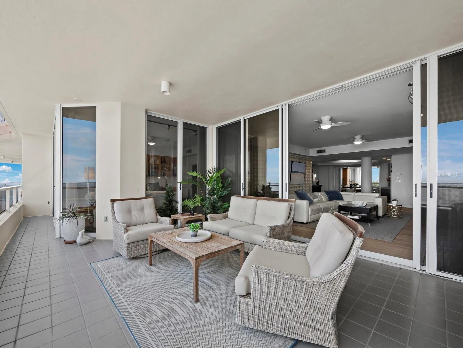Beautifully renovated and offered turnkey furnished, this 3BR/3.5BA residence is perfectly positioned on the 5th floor of Building I in Grand Bay on Longboat Key. A private elevator opens to an elegant, open layout with new wood floors, architectural details, and recessed lighting. Walls of glass frame sweeping views of Sarasota Bay and the Harbourside golf course. The updated kitchen features all-white cabinetry, stone countertops, designer backsplash, premium stainless-steel appliances, and a wine fridge. The spacious living and dining areas flow to an expansive balcony ideal for relaxing or entertaining. A flexible enclosed bonus room / bedroom offers space for an office, media room, or guests. The primary suite includes custom built-ins, balcony access, a large walk-in closet, and a luxurious updated bath with floating vanities, freestanding tub, and glass shower. Two guest suites offer private baths. Additional features include in-residence laundry and under-building parking. Grand Bay residents enjoy resort-style amenities—two pools and spas, a fitness center with saunas, tennis courts, clubhouse—and private Bay Isles Beach Club access. Optional membership to the Longboat Key Club offers golf, tennis, marina, dining, and beach resort privileges—enhancing the ultimate island lifestyle. Large dogs are welcome.