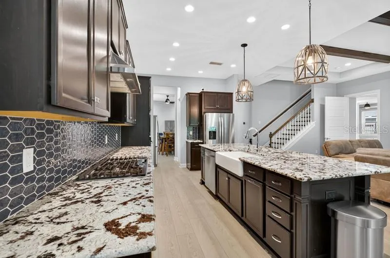 The chef’s kitchen is a dream with a custom-built island, farmhouse sink, slow-close cabinetry, walk-in pantry, and elegant tile backsplash — perfect for both everyday meals and entertaining.