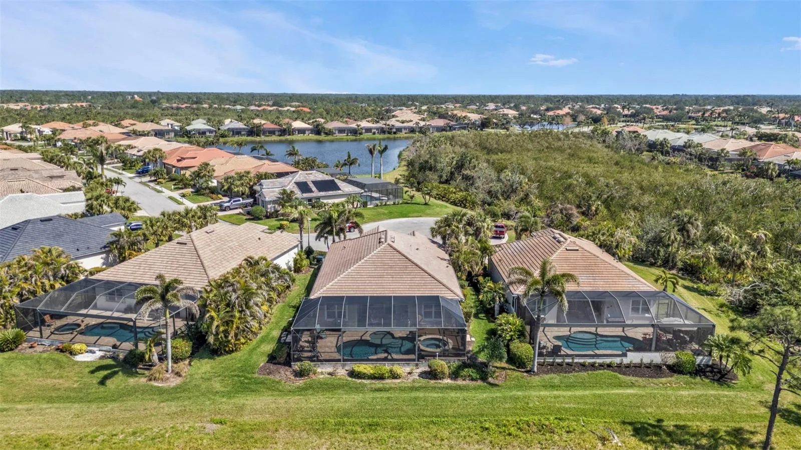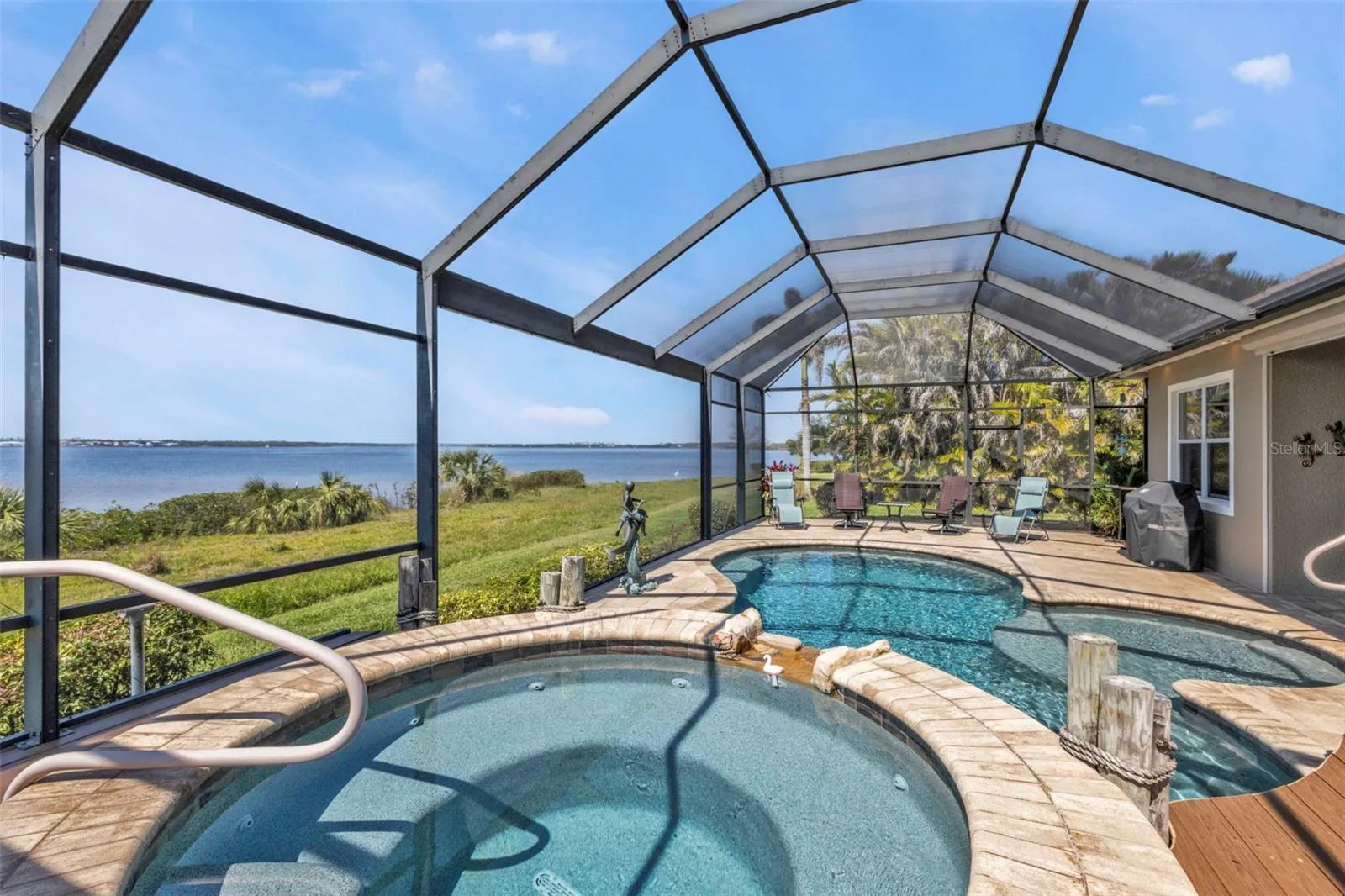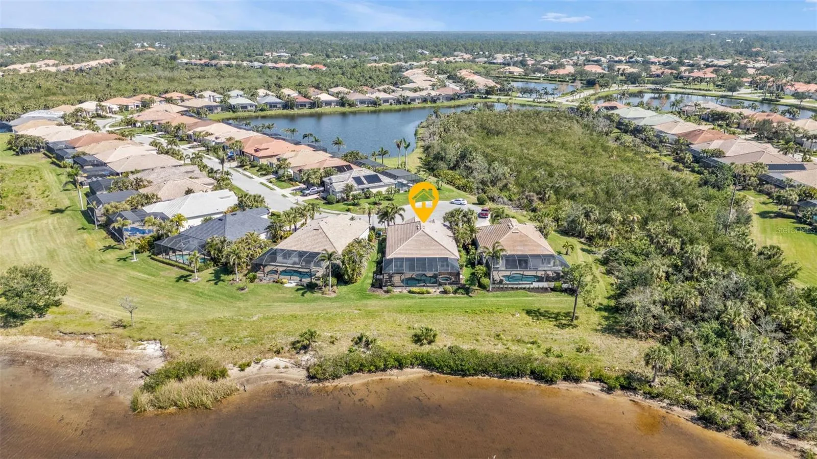 Breathtaking views of the Myakka River set the stage for this beautifully designed 3-bedroom, 2-bathroom home plus office, featuring a new roof and impact windows for added peace of mind. Inside, 10-foot ceilings enhance the spacious feel, while a mix of ceramic tile and carpet flows throughout the open, split floor plan, adding both style and comfort. Pocket sliders from the family room and kitchen lead to the expansive lanai, creating effortless indoor-outdoor living. kitchen is well-appointed with stainless steel appliances, granite countertops, rich solid wood cabinetry, a tile backsplash, breakfast bar, breakfast nook, and pantry—a beautiful and functional space for casual dining and entertaining. The primary suite is a retreat of its own, featuring tray ceilings, private lanai access, double sinks, a large tiled walk-in shower, water closet, and a spacious walk-in closet. Two guest bedrooms share a full bath, providing comfort and convenience for family and visitors. A custom office adds character to the home, showcasing a dramatic entrance with beautifully crafted wood and glass pocket doors, a transom window, built-ins, and a wood chair rail, making it an inspiring space for work or creativity. Step outside to the spacious lanai, where the soothing sounds of the waterfall spa invite you to relax. A brick patio surrounds the heated saltwater pool, while the spa’s stunning stone exterior and Trex decking provide additional space for entertaining. Unwind in the evenings as you take in the spectacular sunsets. An electric roll-down shutter offers added convenience and peace of mind. Additional features include a new hot water heater and an oversized 2-car garage. As part of the vibrant Riverwood community, residents enjoy amenities such as a par 72 championship golf course, a state-of-the-art fitness center, a resort-style pool, pickleball courts, and Har-Tru tennis courts. Beyond your doorstep, relish easy access to world-class fishing, boating, dining, shopping, and the sandy beaches of the Gulf. Conveniently located between Sarasota and Ft. Myers on Florida’s West Coast, this home offers an exceptional lifestyle in a breathtaking setting. Don’t miss your chance to make this stunning home yours—schedule your private showing today!