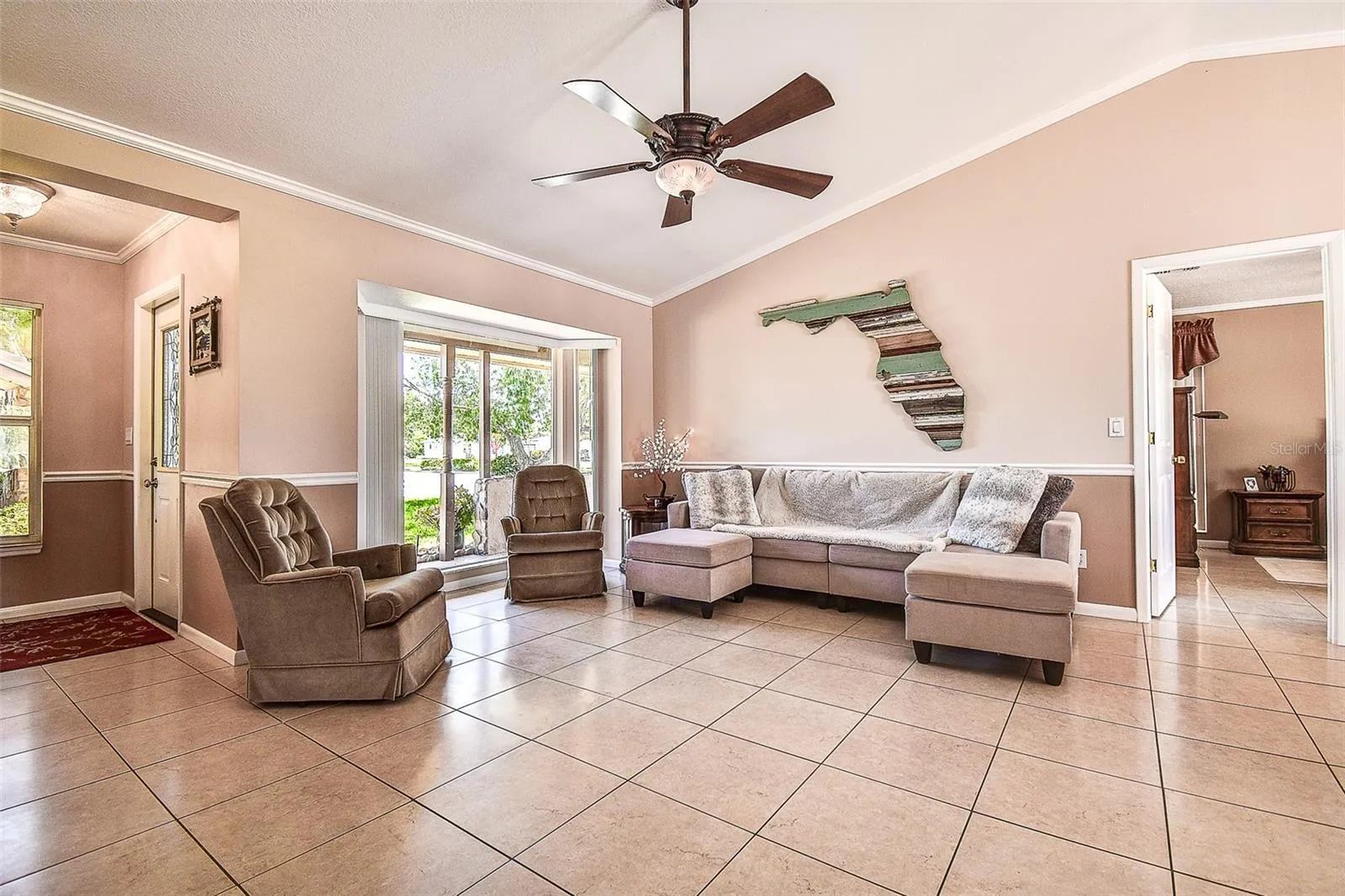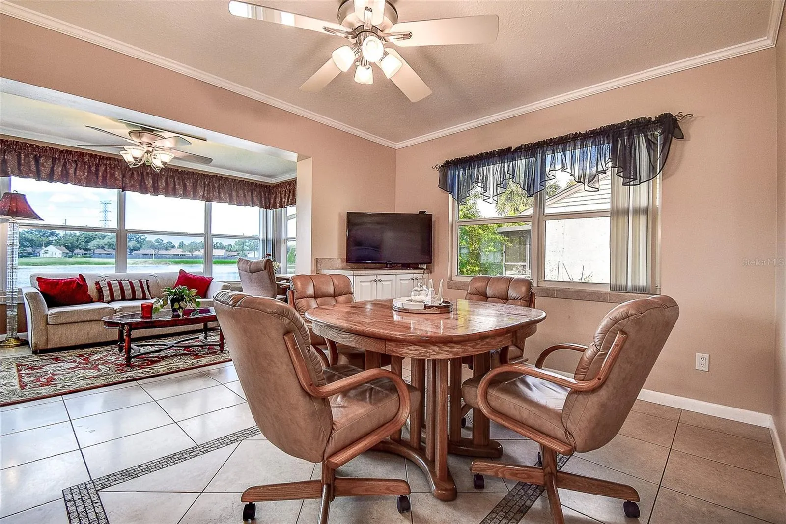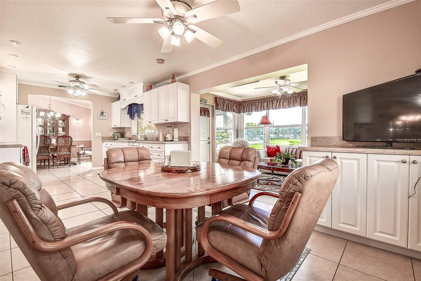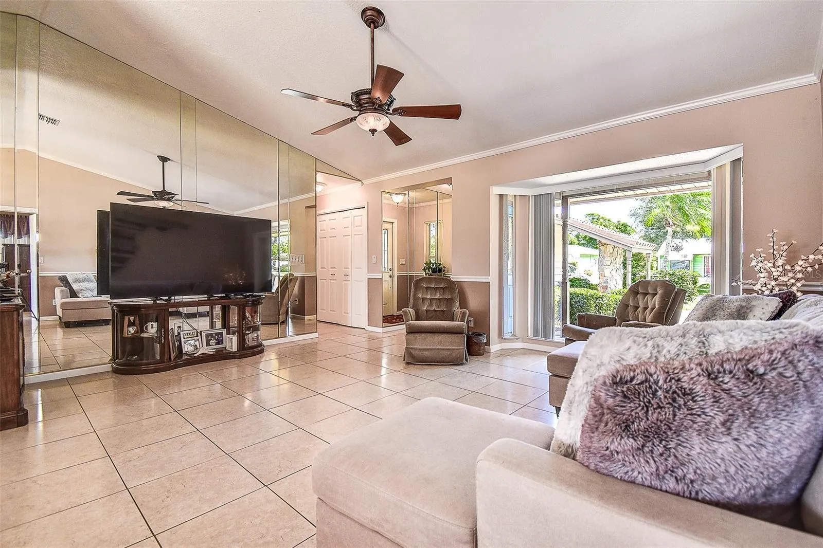 Step inside and you’ll immediately feel the airiness. With over 1,600 square feet of living space and soaring vaulted ceilings, this two-bedroom, two-bath home exudes light, space, and effortless flow. The living and dining area has that open-concept energy, made even better by the crown molding, tile flooring, and natural light filtering in through double-pane windows dressed with sleek window treatments.