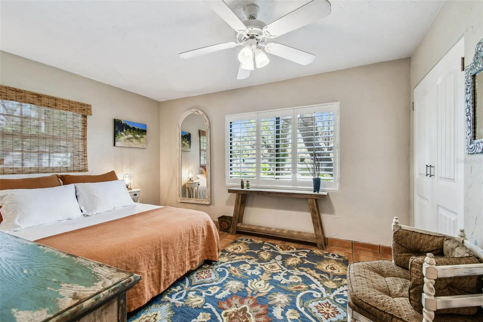 Inside, you’ll immediately notice the wide-open layout with gorgeous Spanish-style ceramic tile flowing throughout the home. The primary bedroom showcases a custom Moroccan tile accent wall and a solid iron claw-foot tub, while the second full bath features a beautifully curved stone shower—each space highlighting the home’s distinctive craftsmanship.
