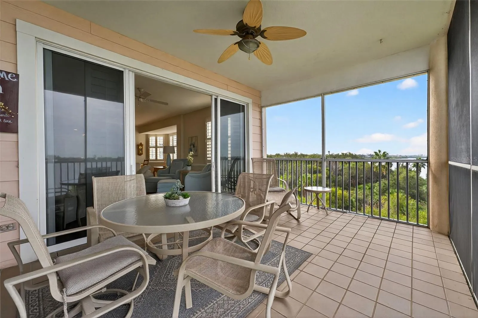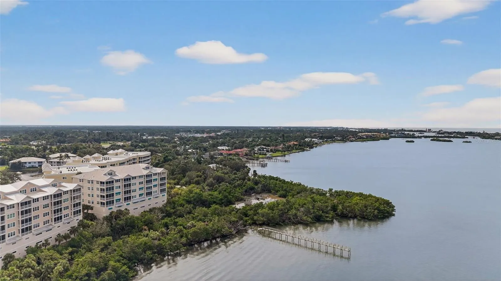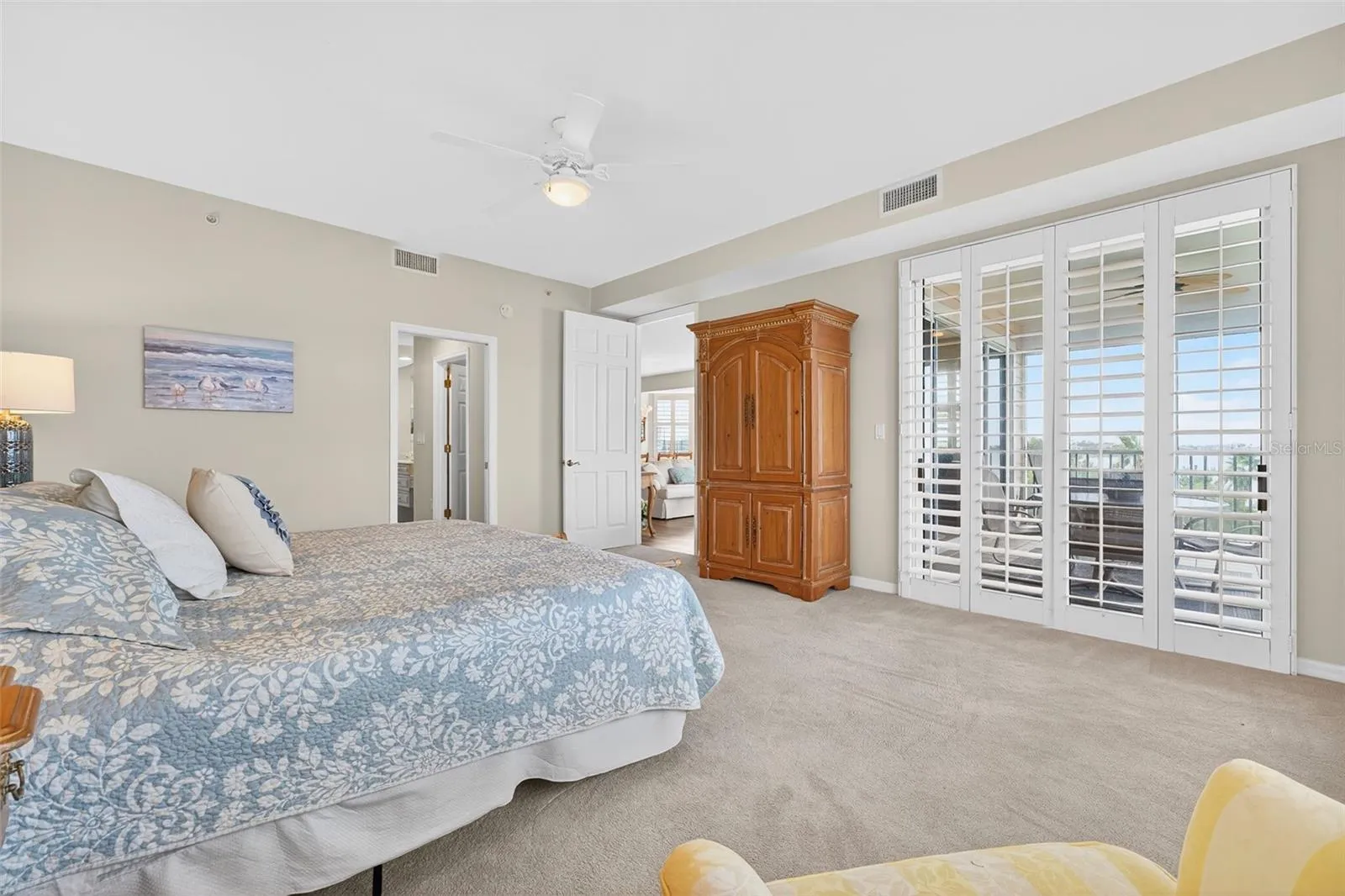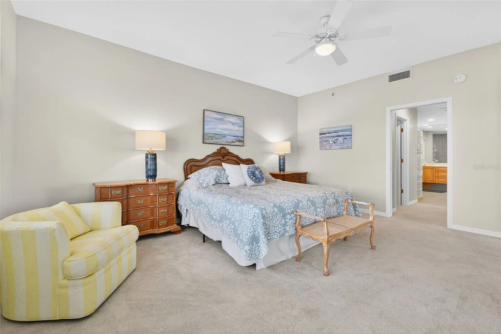 The open floor plan flows into the living and dining areas and onto the enclosed porch, where 180 degree views of Casey Key and the sparkling bay create a breathtaking focal point. Both oversized bedrooms are en suite with generous walk in closets. The primary suite features dual closets, tranquil water views, and a spa inspired bath with jetted tub, double vanity, and makeup counter. The guest suite has its own private entrance, walk in closet, and full bath.