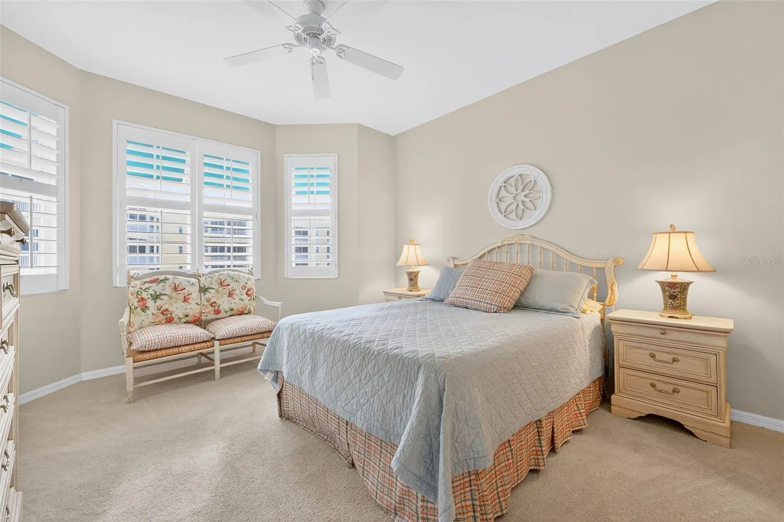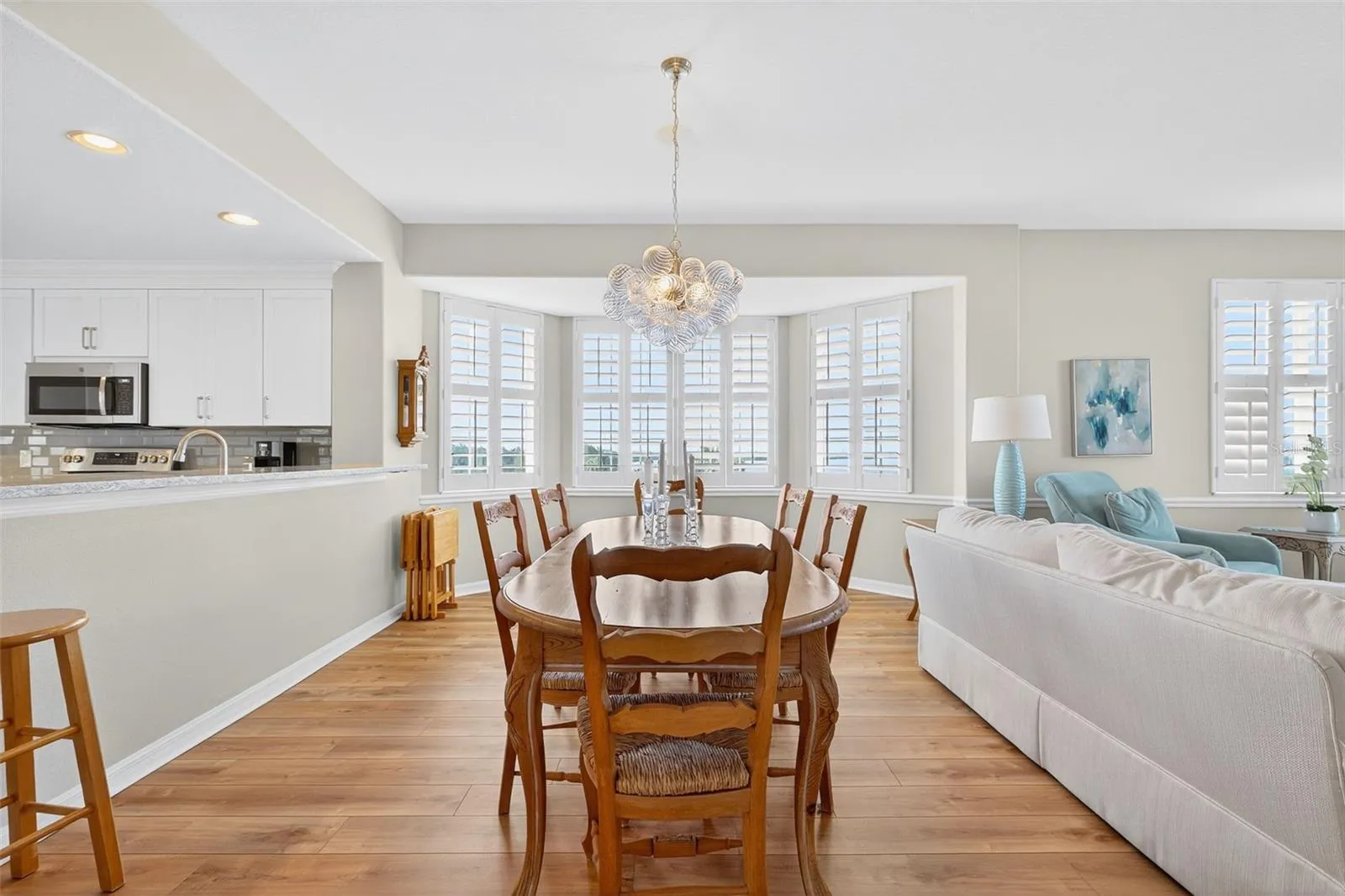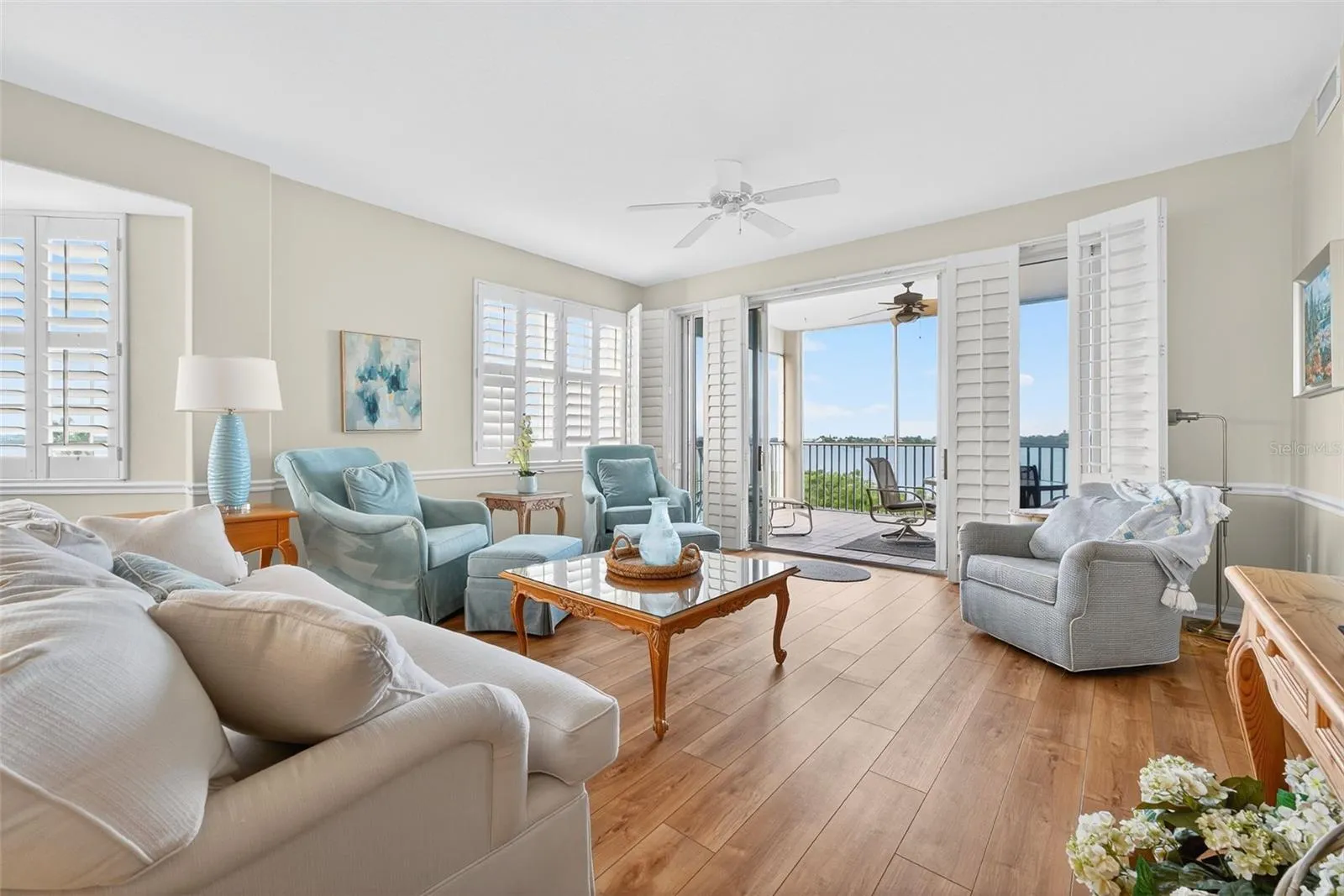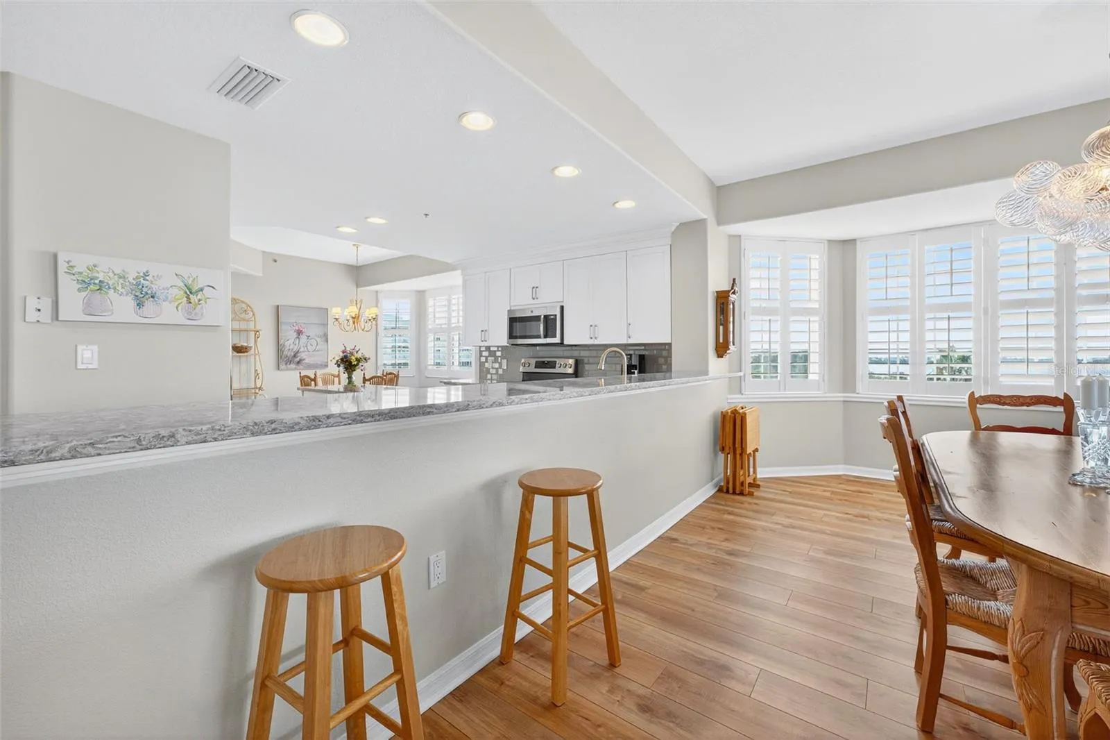 Natural light pours through wide water view windows, while plantation shutters throughout add timeless coastal charm and privacy. The gourmet kitchen offers white cabinetry, granite countertops, stainless steel appliances, and a spacious island perfect for entertaining with the bay as your backdrop.