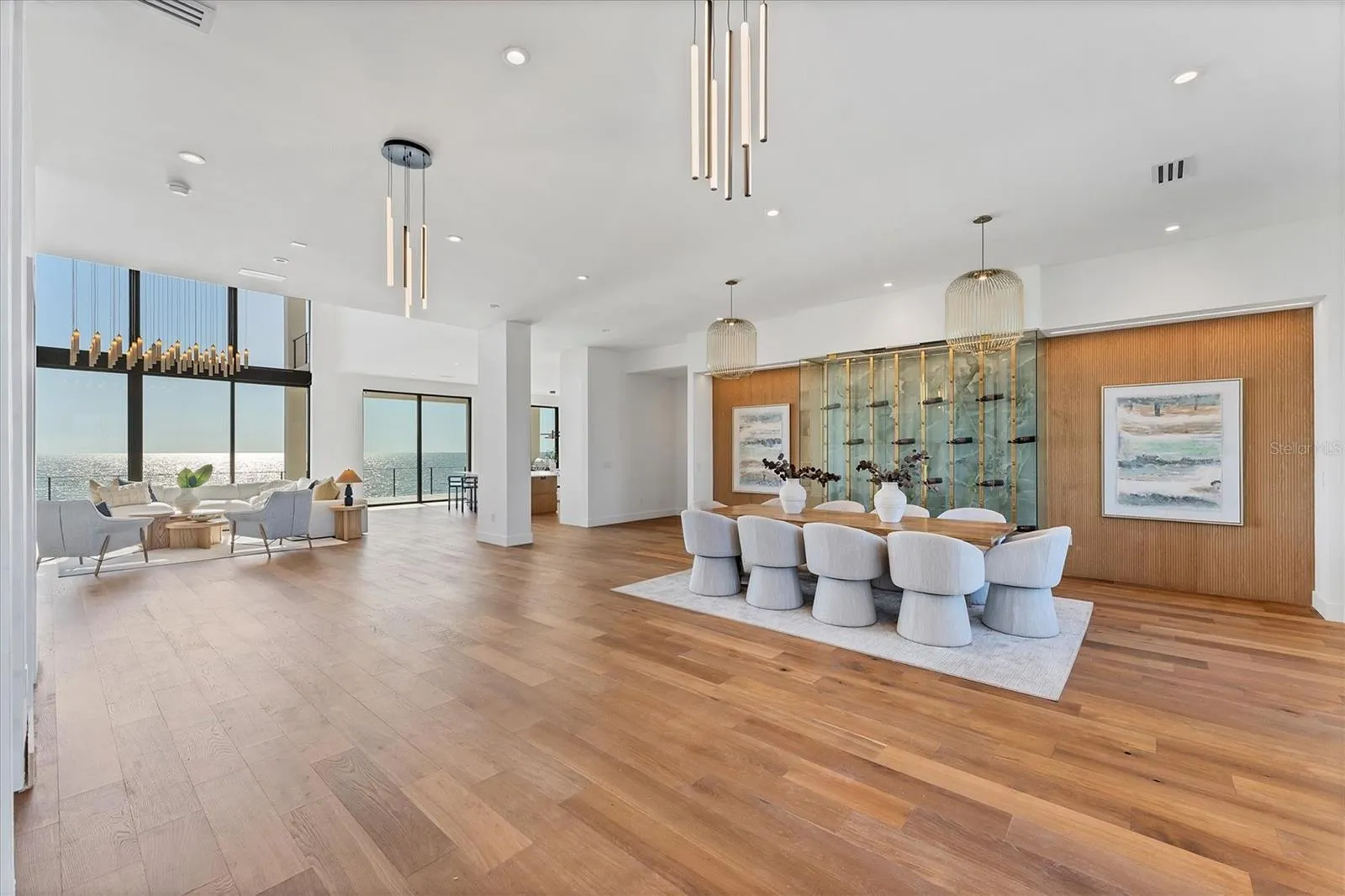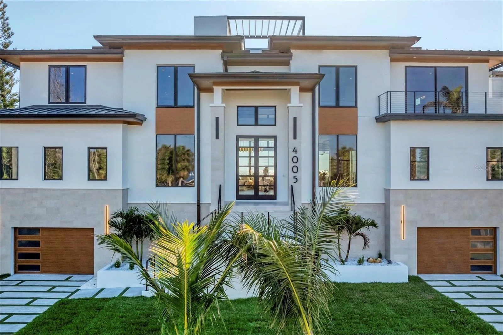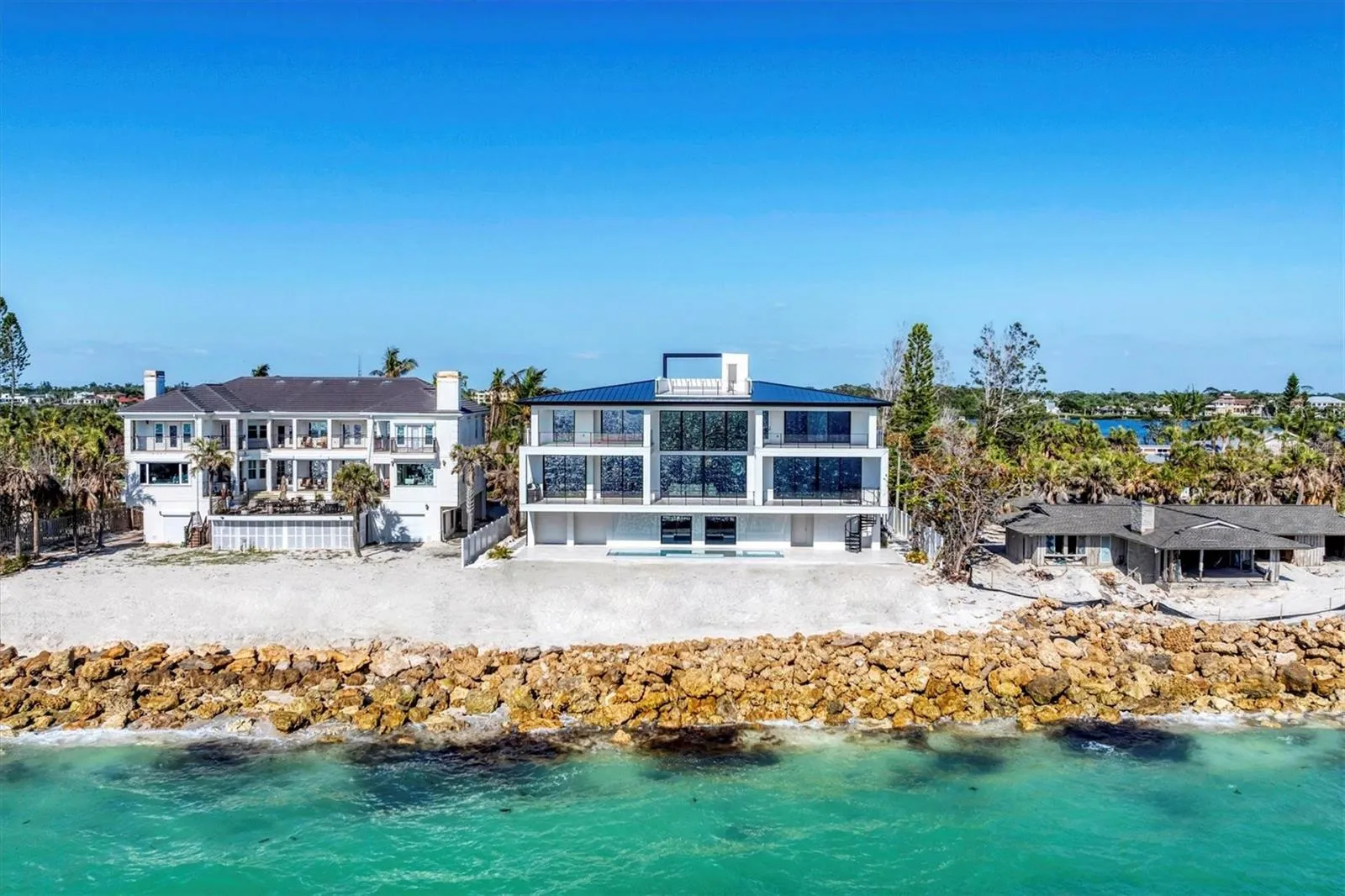 WELCOME TO ONE OF THE FEW BRAND-NEW GULF FRONT HOMES FOR SALE ON THE WEST CENTRAL COAST OF FLORIDA. A rare opportunity, where cutting-edge design meets wide Gulf vistas. Nestled on the prestigious barrier island of Casey Key, this newly constructed Modern Coastal estate by Modesta Homes exemplifies modern beachfront living. Positioned directly on the sand with sweeping Gulf views, this striking residence offers elevated living space, showcasing the pinnacle of craftsmanship and architectural innovation. Built with block construction, pilings, impact-rated windows and doors, and a four-stop elevator, every detail of this home has been thoughtfully curated for style, function, and resilience. Inside, soaring 24-foot ceilings welcome you into the grand foyer and great room, anchored by a dramatic floating staircase and a 24-foot feature fireplace wall. With en-suite bedrooms, state-of-the-art home theater, lounge, bar, and a wine wall, this home offers both grand entertaining and serene retreat. The chef’s kitchen is a design showpiece, featuring European cabinetry, dual waterfall-edge islands clad in book-matched 3cm quartz, and premium Sub-Zero & Wolf appliances. Dual laundry rooms, breakfast nook, and custom built-in vanities provide elevated everyday living. The primary suite is a personal sanctuary, complete with a spa-like bathroom featuring a 71-inch freestanding tub, dual rainfall showers, a makeup vanity, and a large walk-in closet. Every bathroom throughout the home is appointed with bespoke cabinetry, quartz surfaces, and backlit mirrors. Designed to impress from every angle, the home is finished with smooth stucco, level 5 drywall, hardwood floors, imported tile, and integrated LED tray ceilings. A sleek rooftop terrace crowns the home, offering panoramic views of the Gulf and beyond. Step outside to your personal resort: an expansive terrace with an oceanfront pool, floating spa, sun decks, outdoor fireplace, and fully equipped kitchen. Lush, tropical landscaping, Zoysia grass, and a concrete drive with turf inlays complete the impeccable exterior design. Sleek metal railings accentuate balconies and the rooftop for a modern edge. Set on a half-acre of prime waterfront. This is coastal modern luxury at its pinnacle—a rare opportunity to own a brand-new, Gulf-front estate on one of Sarasota’s most desirable stretches of sand.