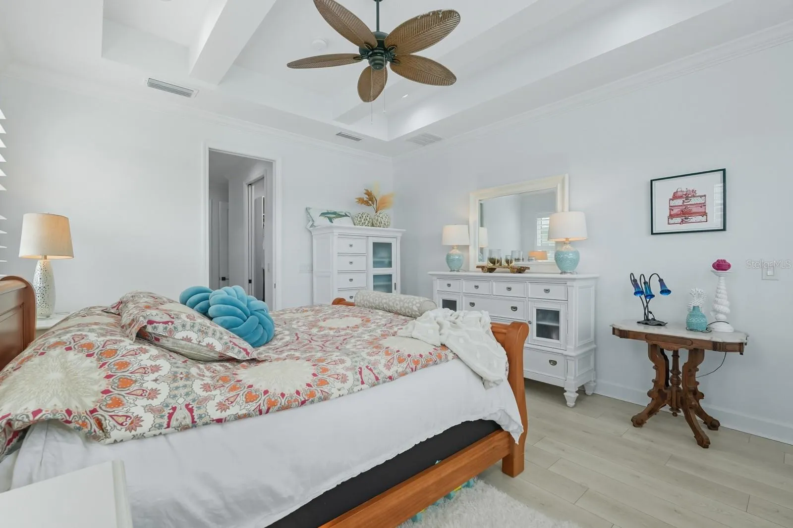 The primary suite is a showstopper with crown molding, accent beams, recessed lighting with reading lights, pocket doors and a gorgeous pond view. The spa like bathroom is outfitted with frameless glass, zero entry rain head shower, pebble flooring, quartz counters, Level 5 soft close cabinetry and upgraded fixtures.