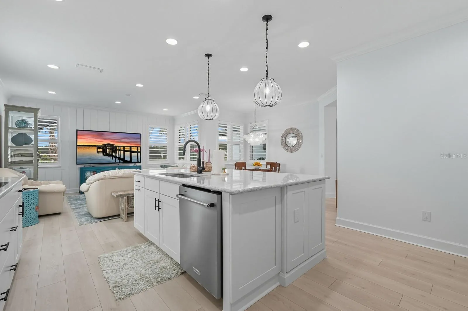 The chef’s kitchen features a massive quartz island to match the white level 5 soft close cabinets. Including crown molding, pull out shelving, under cabinet lighting and kitchen aid appliances. A double trash pullout, custom vented hood and upgrade Moen faucet complete the space.