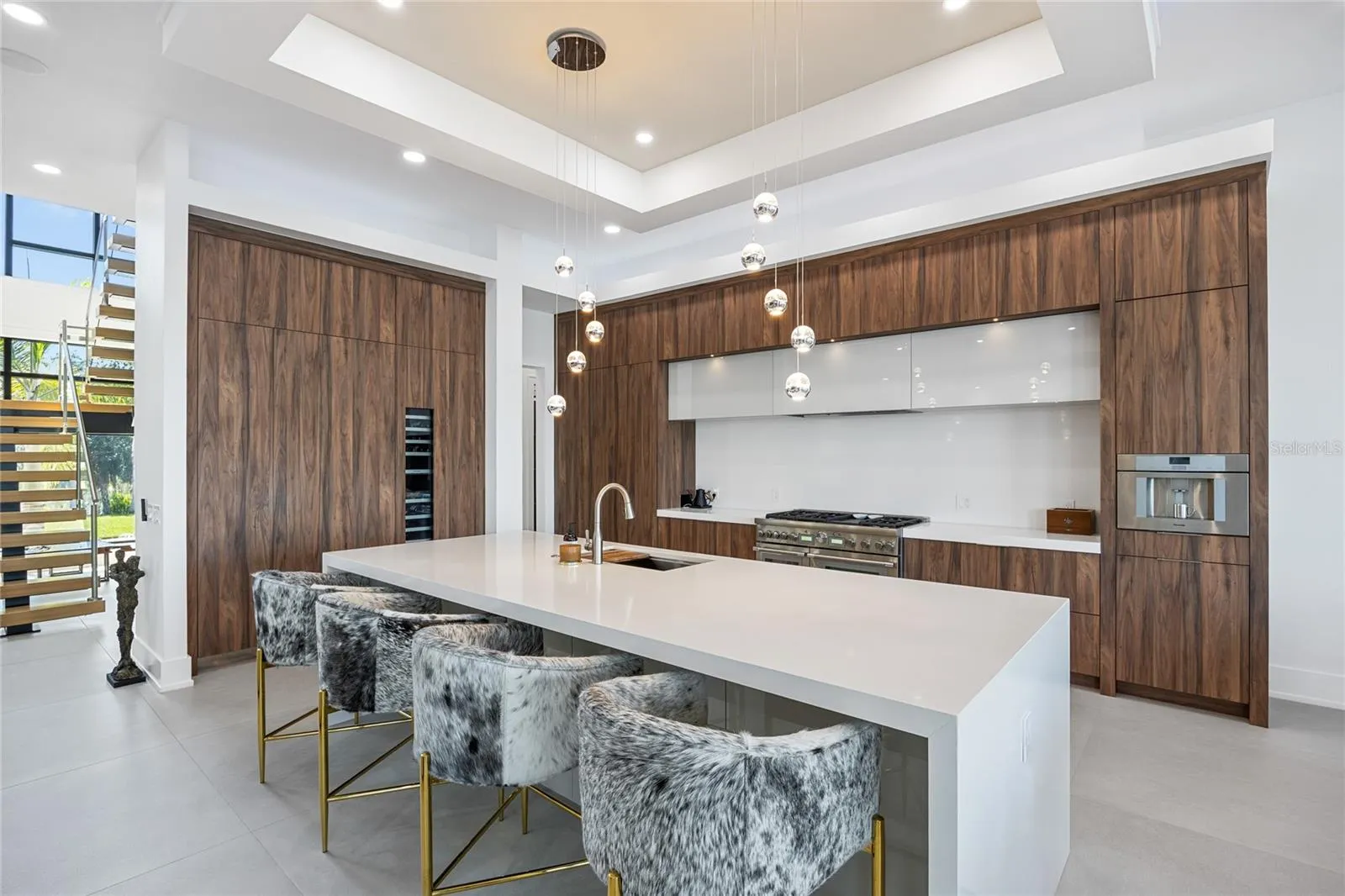 The open-concept floor plan highlights a chef’s dream kitchen with custom cabinetry, pearl-white quartz island, Thermador appliances, gas cooking, full-height wine chiller, and built-in espresso machine, complemented by a discreet butler’s pantry. Expansive living and dining areas open seamlessly to the water, while the executive-style office and designer guest bath add both elegance and function.
