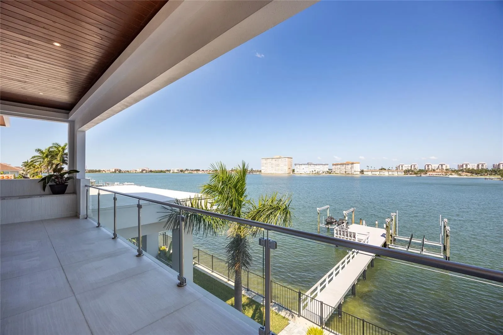 The owner’s suite is a private sanctuary with breathtaking views, balcony access, dual walk-in closets, and a spa-inspired bath featuring custom vanities, a Jacuzzi soaking tub, and a glass-enclosed multi-head rain shower. Upstairs, two additional en suite bedrooms and a large media room extend to a 330-square-foot covered terrace with commanding views of the bay.