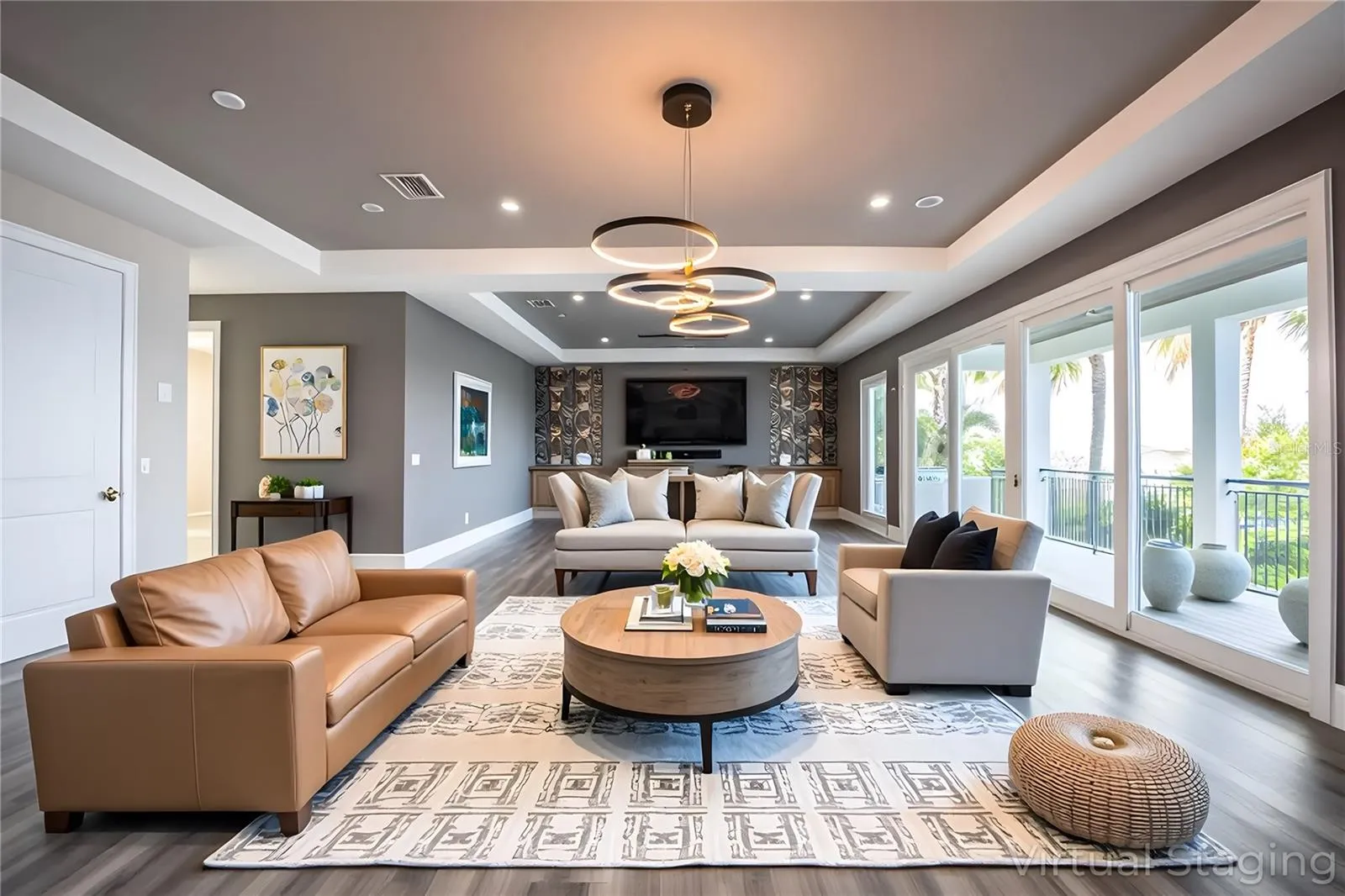 Time to enter through the front door……designer custom steel doors leading to the foyer, additional storage and elevator service. On the 2nd level, the view begins! There’s 4-sliders with two 8′ high glass panels on both sides, affording a panoramic open-water view of Boca Ciega Bay! To the left you will find a custom wall with a 98″ electric fireplace coupled with a 98″ TV and a Sonos sound system; this great room is outrageous. In the center of the room, there’s ample space for a dining table that seats 8, with a custom contemporary chandelier. Further to the right, is a large kitchen boasting two 10′ islands!