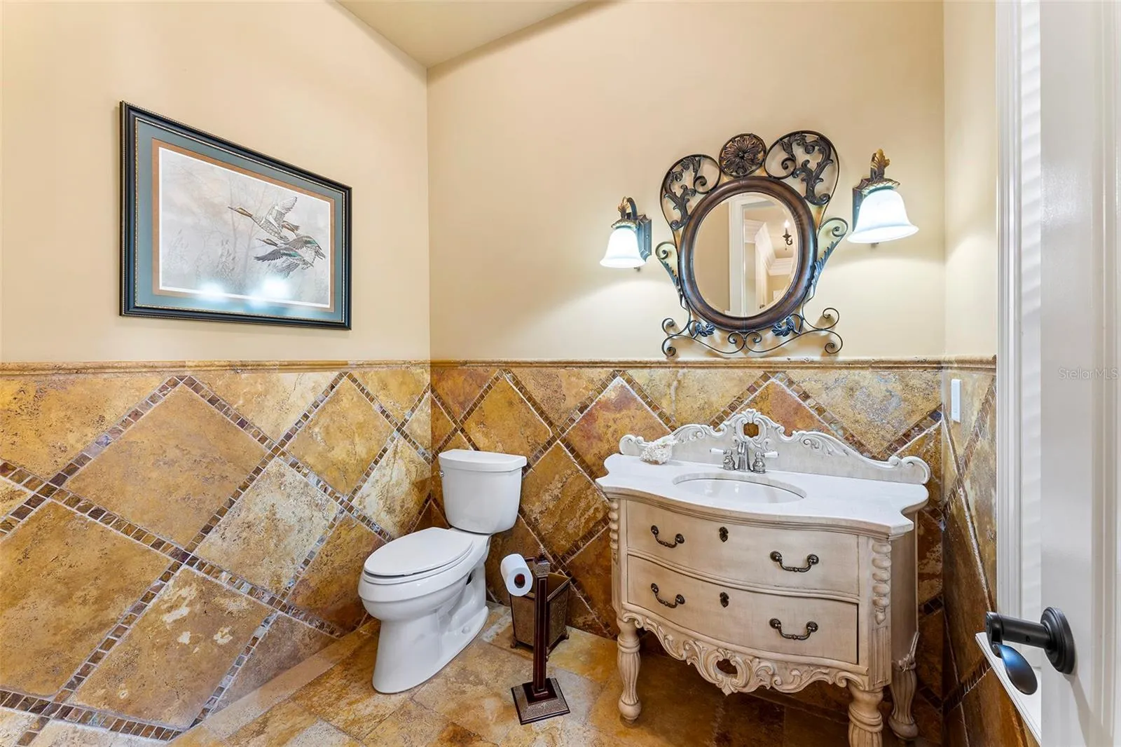 Enter through the 6×8 solid French wood door into a stunning 6,268 Sqft Mediterranean home. You are greeted by the great room that features a gas & wood fireplace with custom bookcases and stunning 22ft 2 steps knock down custom coffered wood ceilings. The exquisite gourmet chef’s kitchen features stainless steel appliances, a Samsung double door refrigerator, a large breakfast bar with custom cabinets and a large walk-in pantry. The open dining room features great views, with a built-in butler’s pantry/bar with cabinet lighting. Open the French doors which lead you to a 57′ Veranda overlooking the pool and riverfront. The private owners retreat boasts 10′ ceilings with hand painted murals, a large gas fireplace, California Berber carpeting, custom silk window treatments and beautiful French doors leading out to lanai. The owners bath greats you with imported Italian Stones, Italian granite, and custom workmanship. Relax in the steam dual rain shower. Take the wrought iron spiral staircase which leads you to the atrium with wood floors & 10′ dome. As you enter the carpeted theatre room you are welcomed with 7 surround sound speakers with dark ceilings and black out drapes, perfect for a movie night. The billiard room showcases hardwood floors, with a gas fireplace, custom bookcases, and a wet bar that features granite countertops with built in cabinets.