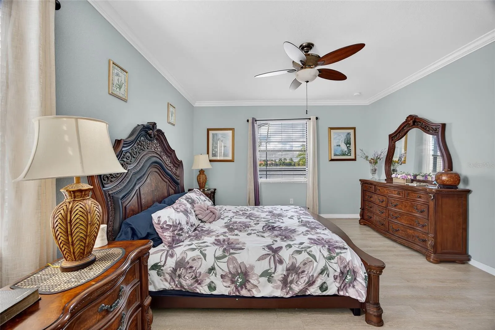 PROMENADE WEST! MOVE-IN-READY! SOUTHWEST FACING VIEWS TO ENJOY GORGEOUS SUNSETS OVER THE LAKE! Impeccably maintained 4 bedroom, 3 bath, 2-car garage lakefront pool home in the gated community of The Forum! Private screened front entry leads into contemporary open floor plan featuring high ceilings, crown molding, neutral décor, custom coastal murals, tile and laminate flooring and large pocket slider to lanai and pool. Beautiful kitchen offers light cabinetry, granite counters, stylish backsplash, stainless appliances and center island with breakfast bar for casual dining. Generous primary suite offers water views, his and her walk-in closets and ensuite bath with dual sinks, garden bath and walk-in shower. Second bedroom features full private bath plus two additional guest bedrooms with separate full bath. Fourth bedroom is perfect for a great den or office space. Fabulous outdoor entertaining area features covered lanai, screened heated pool and spa, paver decking and serene lake views. Exterior is surrounded by lush landscaping enhancing the great curb appeal of this home. Additional special features include inside laundry room, in-wall pest system, irrigation system, hurricane shutters and tile roof. Great location minutes from I-75 to commute north or south, restaurants, shopping, schools, golf and all amenities the area has to offer. Don’t miss this opportunity to make this charming lakefront home your new Florida retreat or permanent residence. Schedule your private showing today!