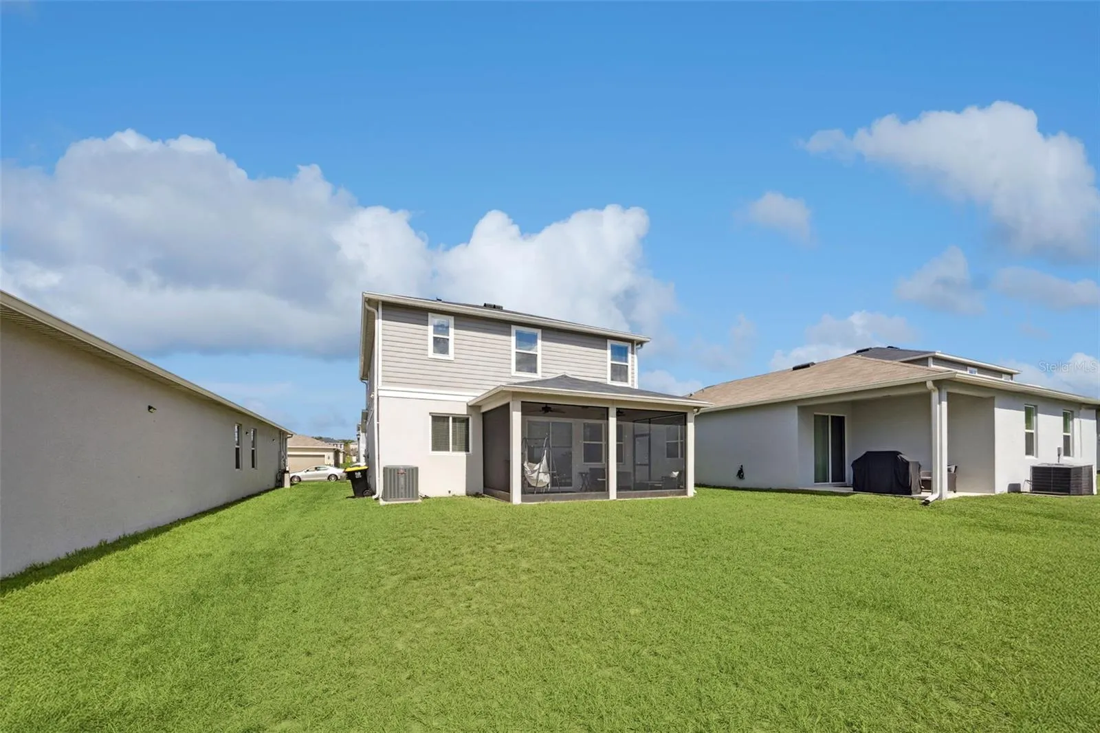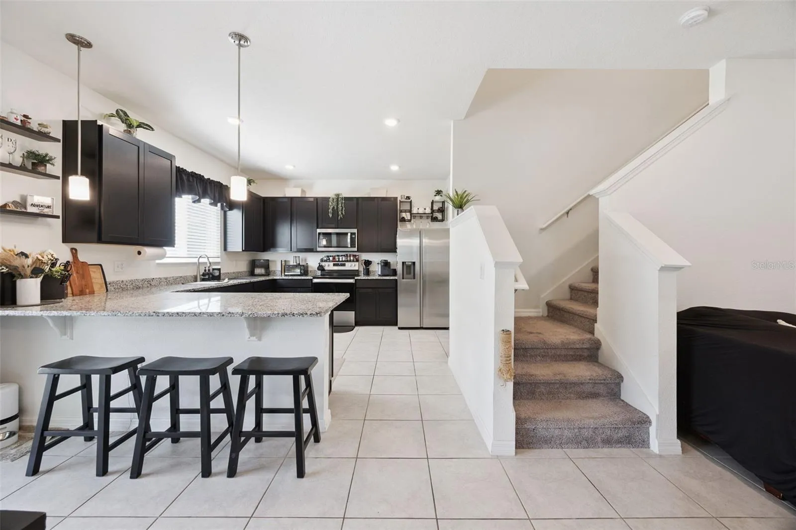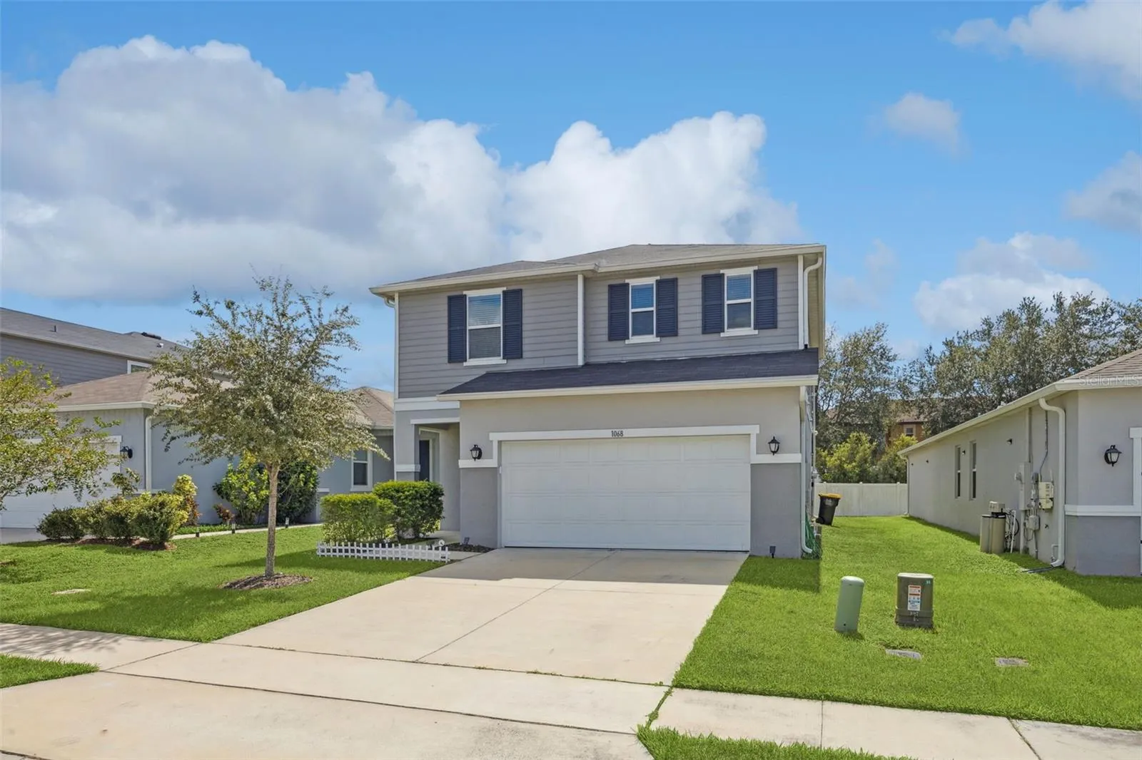 UPDATED AND MODERN HOME WITH HUGE BACKYARD! LIKE-NEW WITH NO CDD! Built in 2022, this Mirabella home features a highly functional, open floorplan layout and is loaded with sophisticated finishings. As you enter, you are greeted with a spacious open concept living and dining space that is ideal for entertaining. The dining area has a sliding glass door with views out to the patio and backyard, and also leads you over into the kitchen. The large kitchen features sleek espresso cabinetry, granite countertops, stainless steel appliances, and huge peninsula with counter seating that is perfect for prep, hosting, or easy dining. There is also a half bathroom downstairs for you and your guest’s convenience. Upstairs, you are met with a large loft space that can be used for an office, game room, movie room and more – make this space your own! There is also an installed privacy shade that can be used to separate the space. The huge primary suite features a walk-in closet, double-sink vanity with granite countertop, large walk-in glass and tile shower, and extra space for a makeup vanity or storage. The two guest bedrooms are located across from the loft, allowing for added privacy, and share their own guest bathroom with long granite vanity and shower/tub with built-in storage. Other features of the home include a large laundry room with sink and under-stair storage space. Stepping out back, you have a large, covered and screened patio with views of your huge backyard! With no immediate rear neighbors, this space can be transformed into your own Florida oasis. The Mirabella community has a low HOA and no CDD, and features a community pool, playground, and green space. The location is prime, with direct access to US-27 providing a short drive to Walt Disney World, I-4, ChampionsGate, Sunset Walk at Margaritaville and several more new restaurants, shops, and entertainment destinations. Come see this home before it is gone!