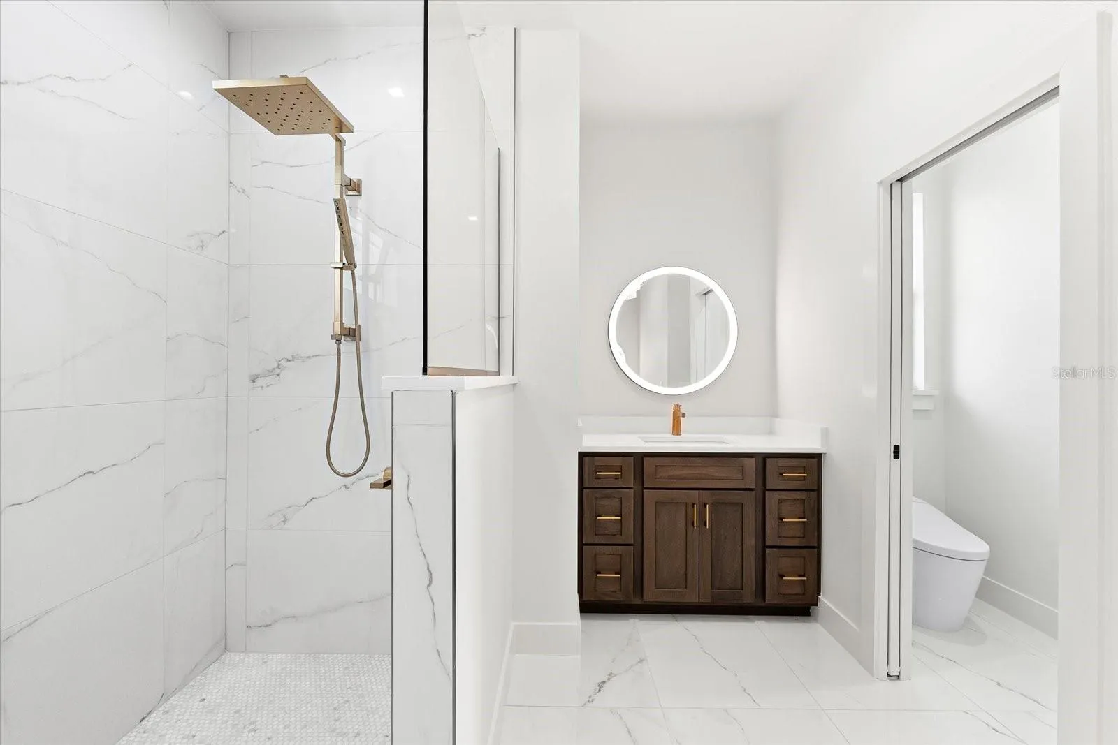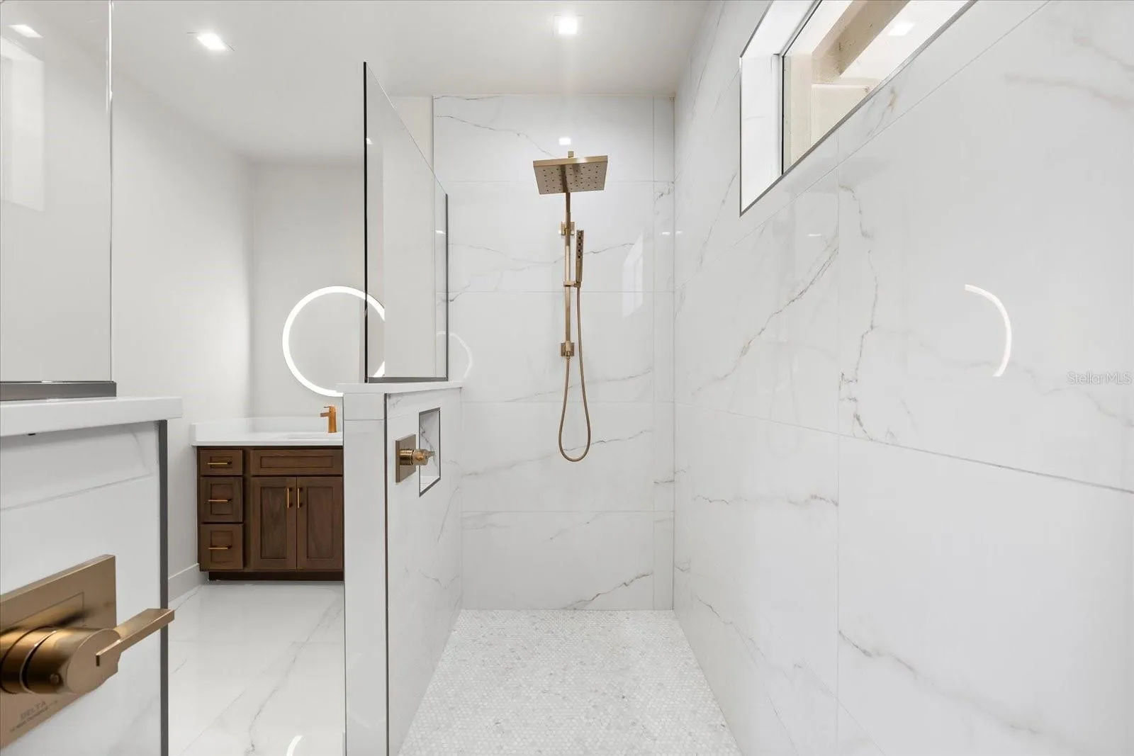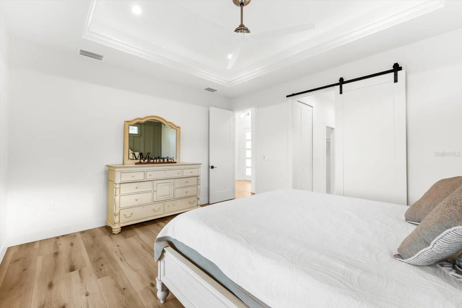The owner’s suite is a true private retreat with dual walk-in closets, direct access to the lanai, and a spa-inspired en-suite bath featuring dual vanities and an oversized walk-in shower. A split-bedroom layout ensures privacy for guests, with two additional bedrooms and a shared bath that opens directly to the pool. One guest suite features its own sliding door to the lanai, ideal for visitors seeking a serene escape.