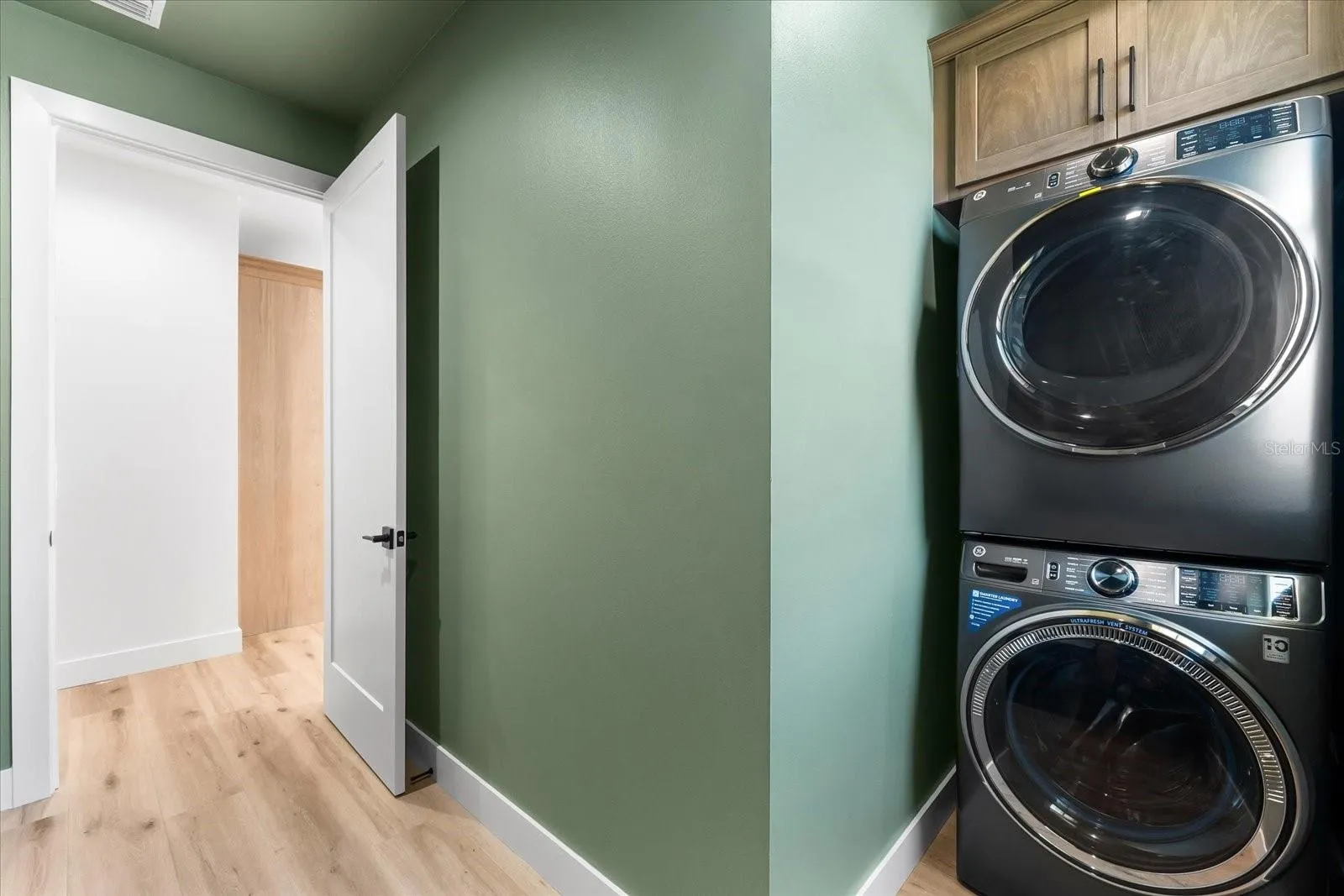 Designed with thoughtful extras, the home includes a dedicated den or office, a fully outfitted laundry room with quartz countertops and custom cabinetry, and energy-efficient Low-E PGT impact-rated windows and sliders. A sleek standing seam metal roof offers both durability and architectural appeal. The beautifully landscaped yard features irrigated St. Augustine grass, providing a lush, green backdrop year-round, while high-speed internet and smart-home readiness add modern convenience.
