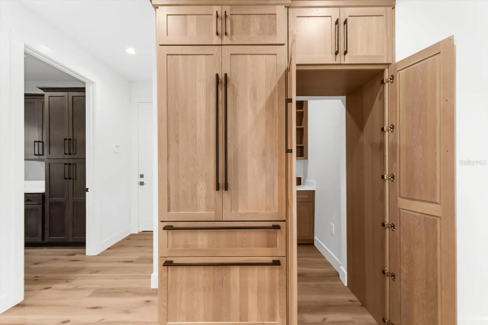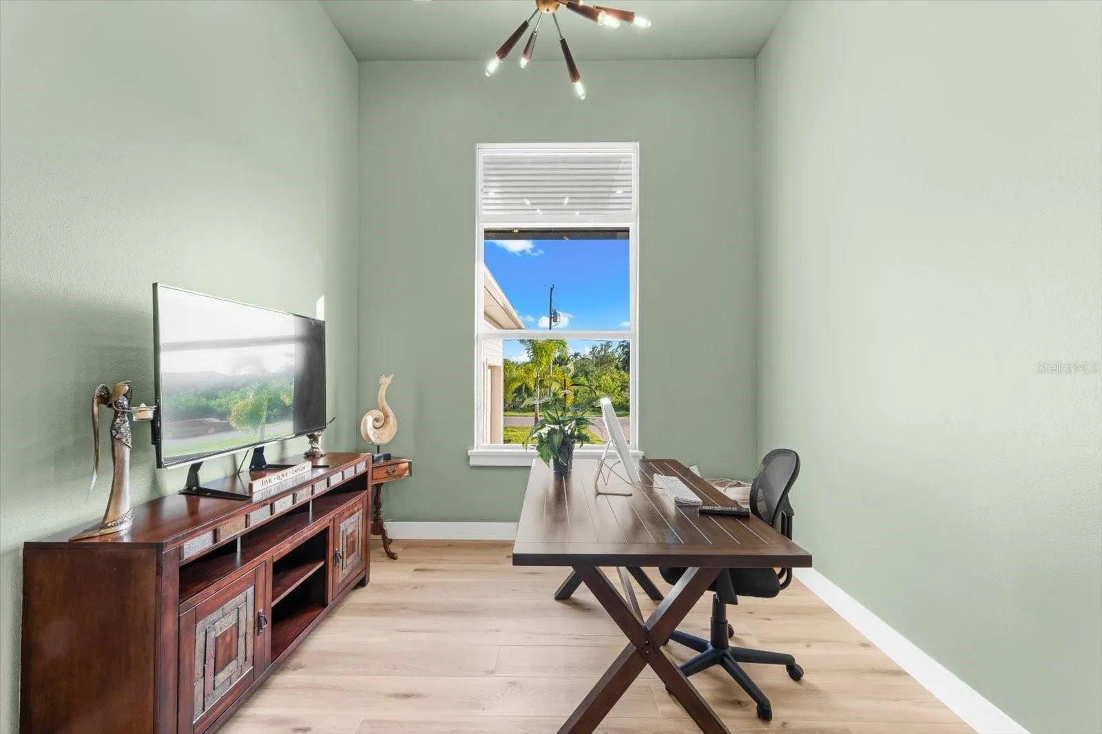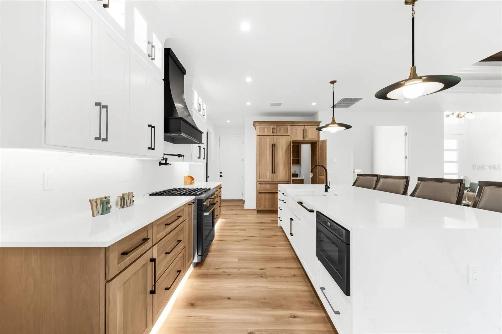 Step through impressive custom double entry doors into a light-filled interior where craftsmanship shines. Intricate wood inlays accent the entryway, great room, and lanai, while soaring ceilings, designer lighting, and seamless luxury vinyl flooring throughout create a warm yet sophisticated ambiance. This home offers a perfect blend of elegance, durability, and coastal style—inside and out.