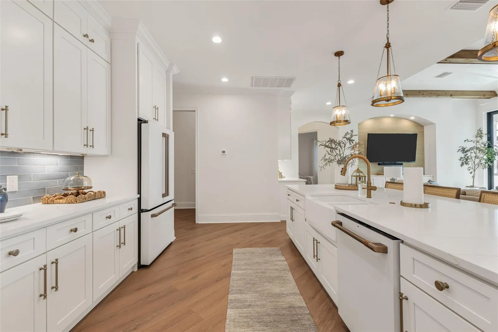 Step inside to discover a professionally designed and decorated flowing open-concept floor plan where the living, dining, and kitchen areas are seamlessly connected, offering the perfect setting for both relaxing and entertaining. The gourmet kitchen is a true showpiece, featuring Café appliances, quartz countertops, a 10-foot island, elegant pendant lighting, and a large butler’s pantry designed for style and functionality.