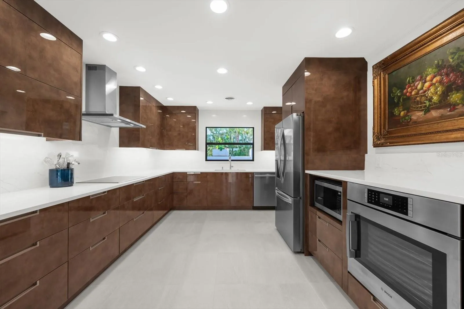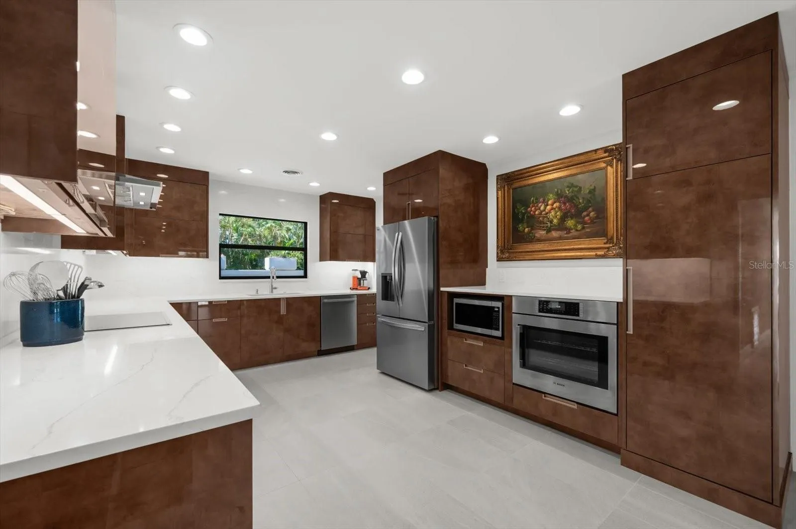 Hurricane-impact doors and windows throughout, Standing seam metal roof (2022), All-new plumbing, electrical, drywall, painting,fixtures, flooring, bathrooms, and kitchen, Gutters and exterior updates. Chef’s kitchen featuring custom LUXE cabinetry, quartz countertops, and ample workspace with a total of 4,285 sq. ft., this home blends elegant design and everyday livability—indoors and out. Whether you’re entertaining guests, setting off on a sunset cruise, or simply relaxing and soaking up the serene water views, this one-of-a-kind property delivers the ultimate coastal lifestyle.