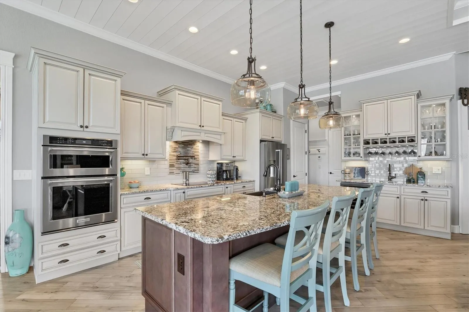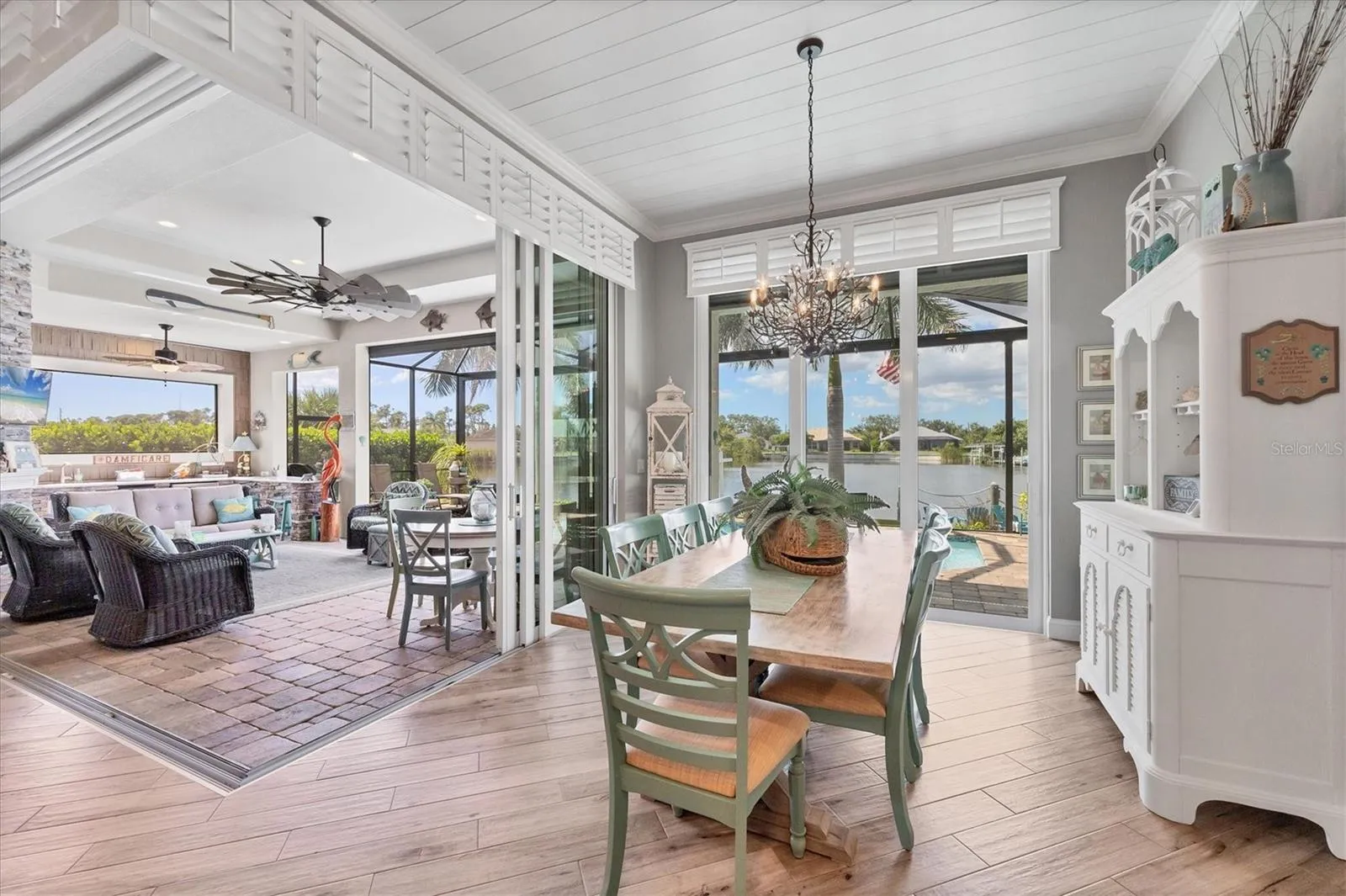 Exceptional 2017 coastal style waterfront home in the highly desirable boating community of South Gulf Cove with access to the Gulf. This stunning residence offers 2,128 sq. ft. under air with 3 bedrooms, 3 full baths, an office/den, and a 3-car garage, perfectly blending elegance, comfort, and craftsmanship. The open floor plan features diagonally laid ceramic plank tile, crown molding, plantation shutters, 8’ doors with custom trim, and wood-accented coffered ceilings. The chef’s kitchen is a showpiece, showcasing a 10’ granite island, stainless-steel appliances, induction cooktop, pot filler, glass tile backsplash, and custom cabinetry with pullouts. The wet bar includes granite counters, sink, wine refrigerator, and glass-front cabinetry, ideal for entertaining in style. Expansive 10′, zero-corner sliders open to an oversized lanai featuring a floor-to-ceiling stone fireplace, granite outdoor bar with refrigerator and ice maker, and a heated saltwater pool complete with sun shelf, therapy jets, and LED lighting. The panoramic picture window, no-seeum screen enclosure perfectly frames breathtaking views across the 400-foot-wide Santa Cruz Waterway, offering unforgettable sunsets. Outdoor highlights include a sunken LP gas fire pit, 36′ x 8′ TREX composite dock with water and electric, 10,000 lb. covered boat lift, and a full seawall. Lush, pro-vista grass and tropical landscaping is maintained by an irrigation system that draws from the canal, no city water bill! Additional features include transferable flood insurance, a new standing-seam metal roof with transferrable warranty, impact windows, generator hookup, security system, tongue-and-groove wood ceilings, and enclosed garage storage with golf cart door. Conveniently located halfway between Sarasota and Fort Myers, this home is minutes from world-class fishing, championship golf courses, two Major League Baseball spring training facilities, pristine Southwest Florida beaches, and an array of shopping and dining options. A perfect blend of luxury and livability, experience true coastal Florida living at its finest! Paradise awaits you!!!
