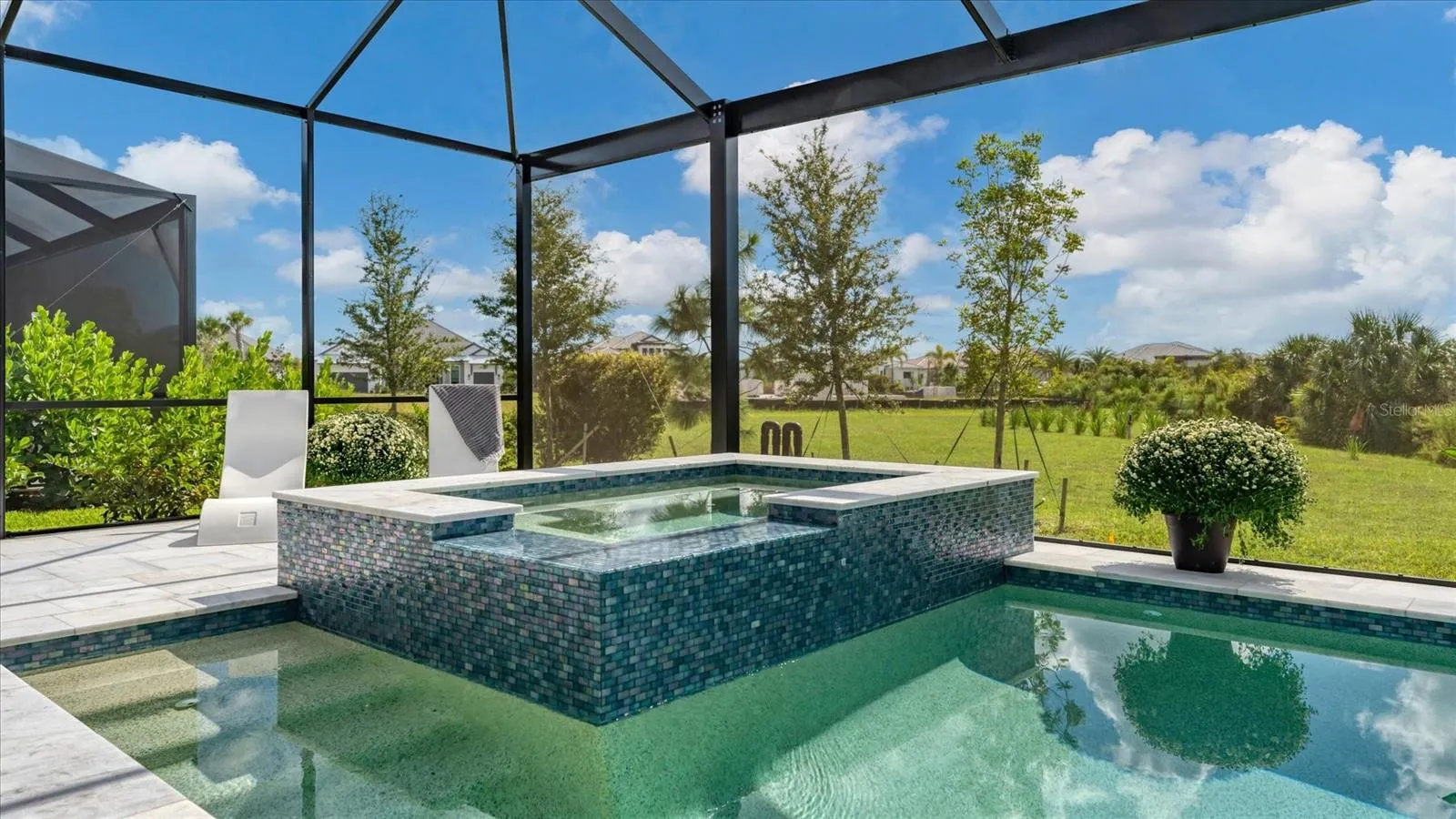 Step outside to your custom-designed saltwater pool and spa, complete with a sun shelf and concrete sub-base deck—engineered to prevent settling and shifting of the main pool deck while providing easier long-term maintenance. The travertine tile lanai, generous covered spaces, and natural preserve backdrop create a peaceful and private oasis ideal for entertaining or relaxation.