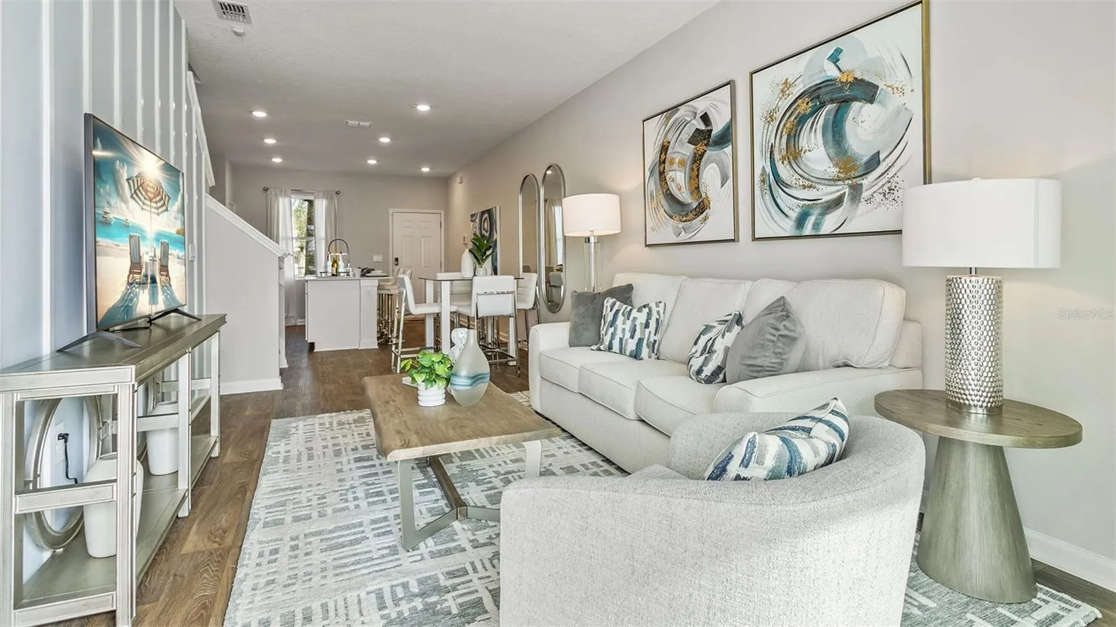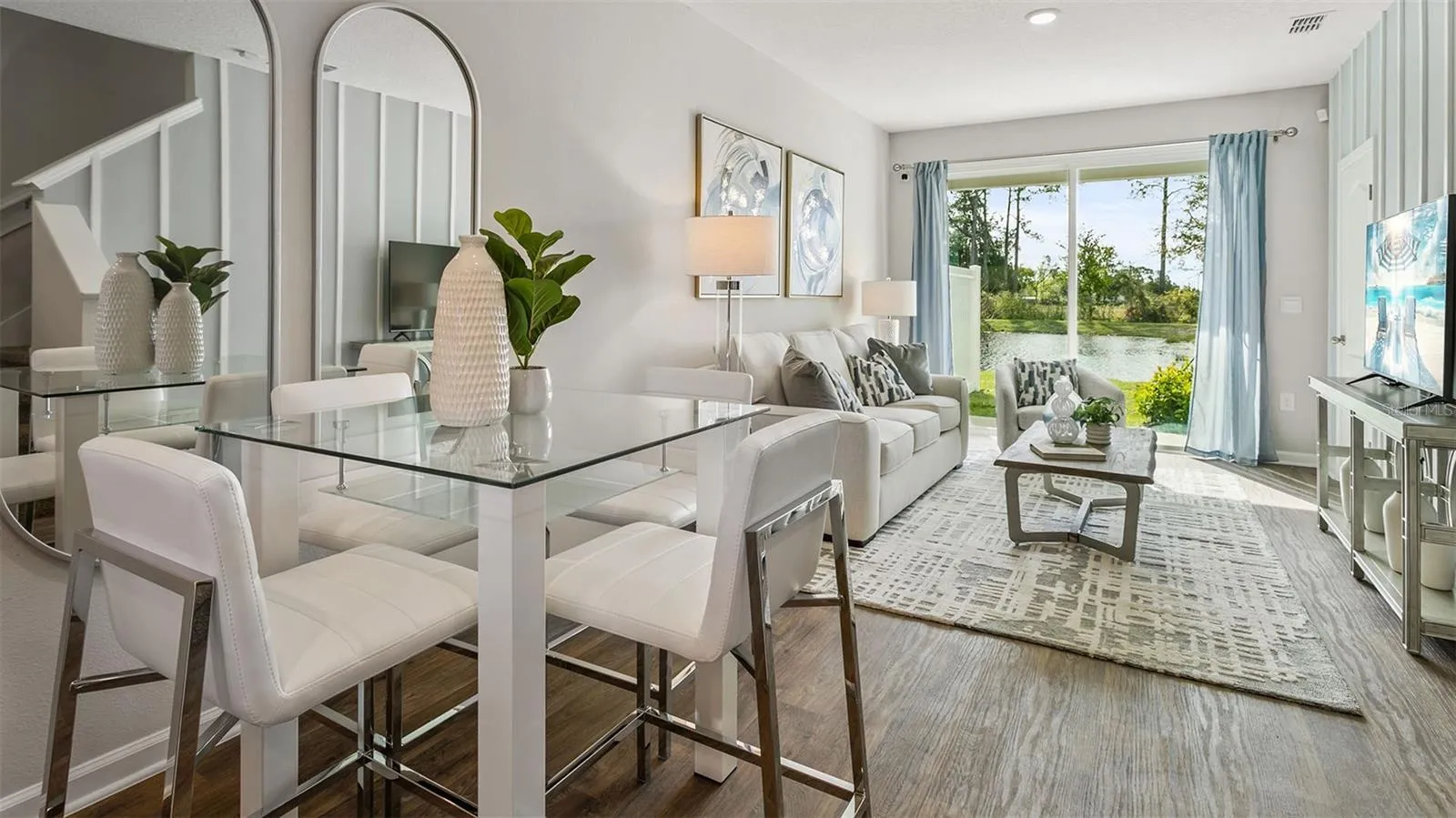 AVAILABLE NOW! This bright and open kitchen features a sleek white cabinetry, stainless steel appliances, and a large island with quartz countertops-perfect for entertaining or family meals. The spacious layout flows seamlessly int the living area, complimented by recessed lighting and wood-style flooring for a warm, contemporary feel. Enjoy the convenience of a pantry and a stylish gooseneck faucet, all in the fresh, move in ready space! The large window brings in natural light, creating a cheerful atmosphere for morning breakfasts and family gatherings. Just off the kitchen, you’ll find easy access to the main living area and outdoor space, making this the ideal setting for entertaining or quiet evenings at home.