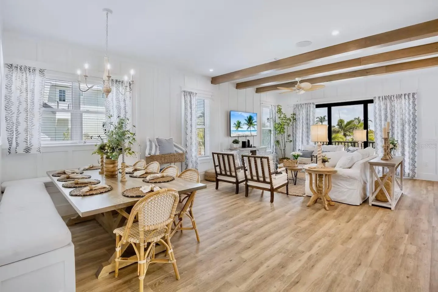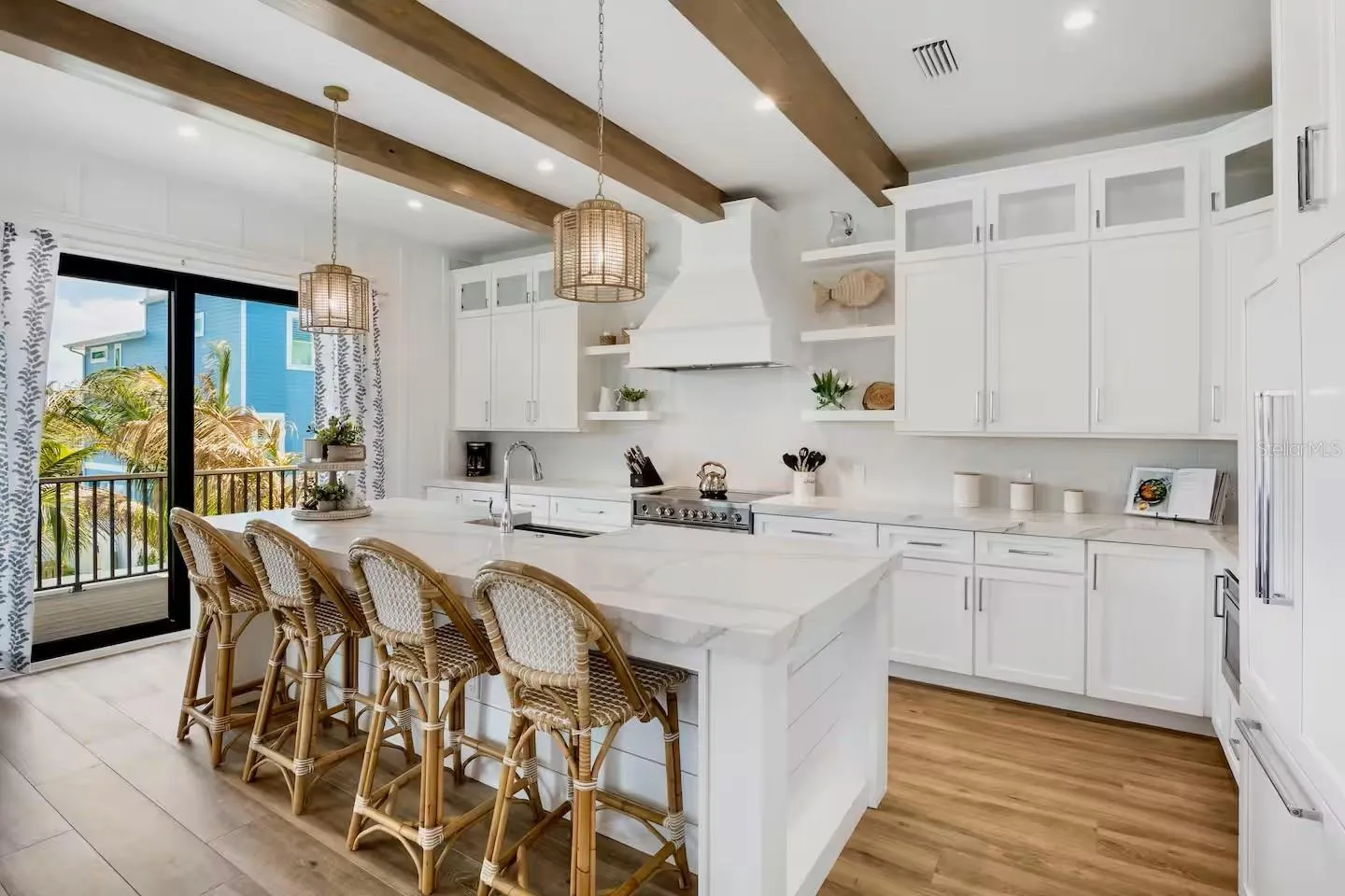 The chef’s kitchen is beautifully appointed with quartz countertops, premium appliances, an oversized island with bar seating, and open shelving for a truly coastal-luxe look. The spacious dining and living areas transition seamlessly for entertaining large groups or extended family.