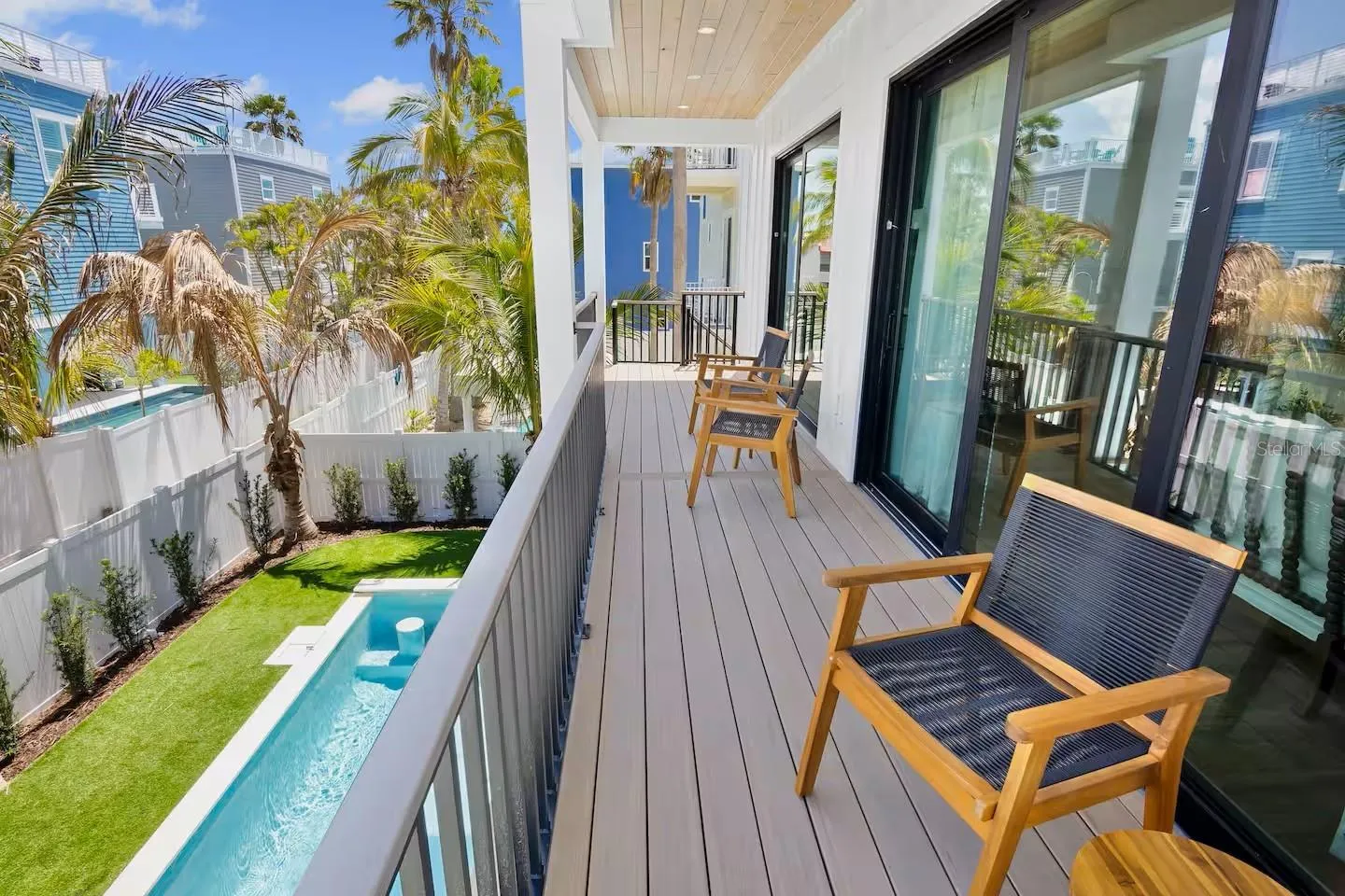 From the moment you arrive, the clean architectural lines, palm-framed entry, and three-car garage set the tone for the sophistication inside. The open-concept main living level features soaring wood-beam ceilings, custom millwork, designer lighting, and an abundance of natural light flowing through oversized sliders that open to multiple balconies with sweeping Gulf views.