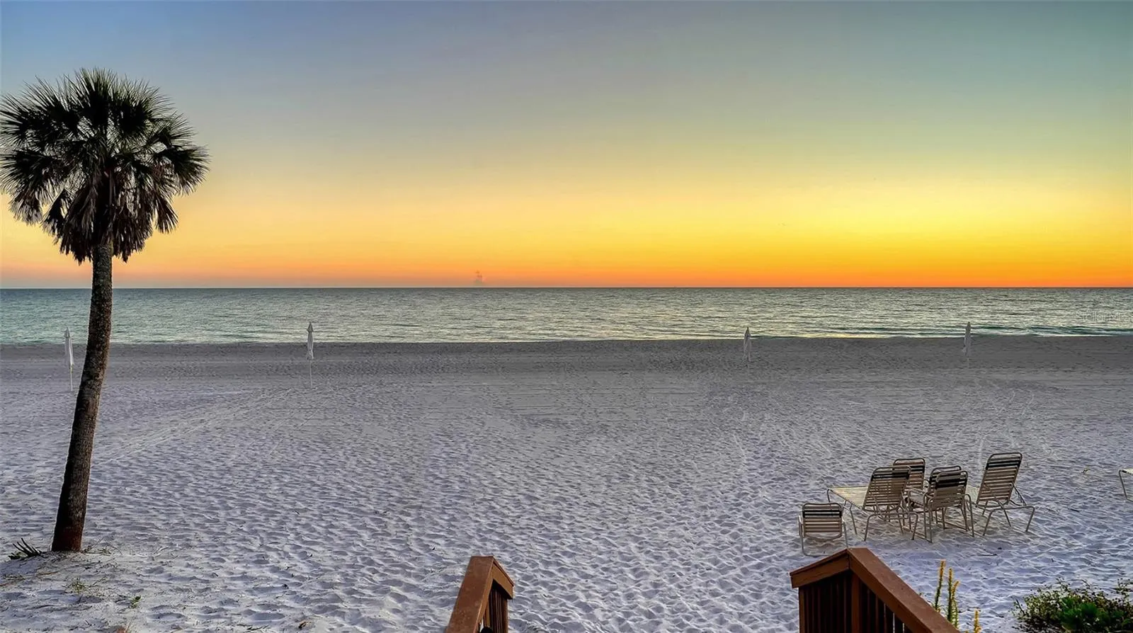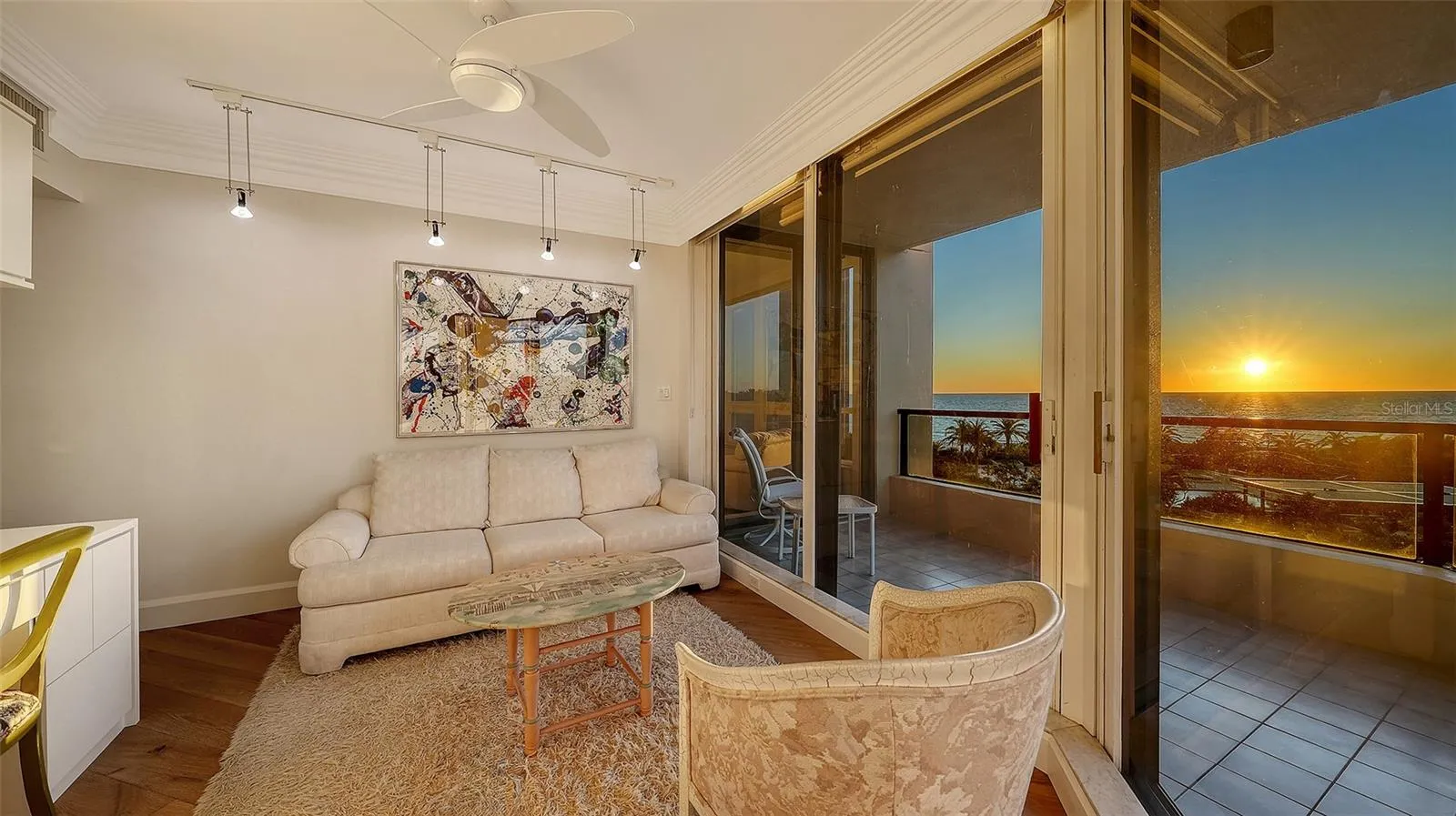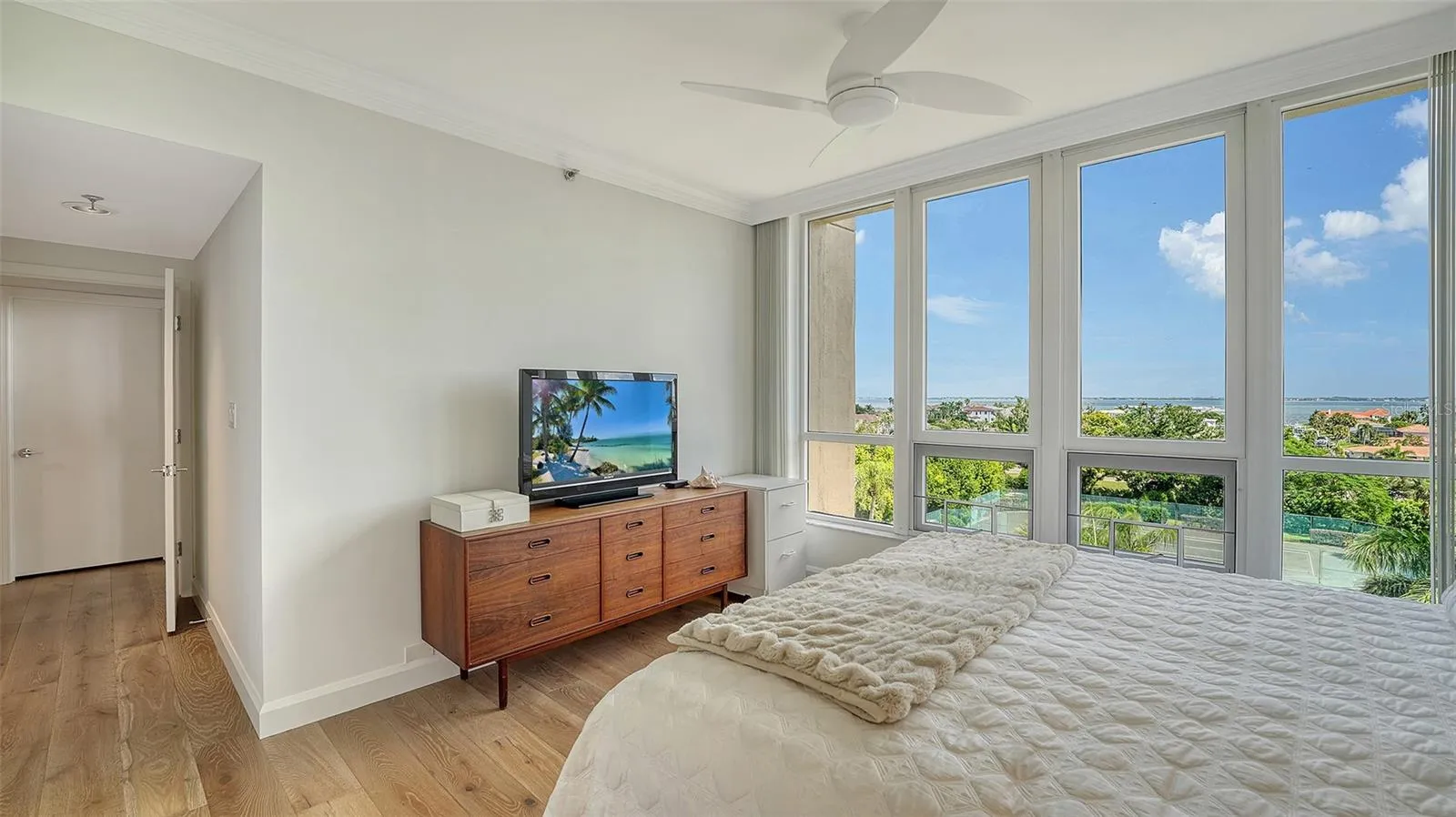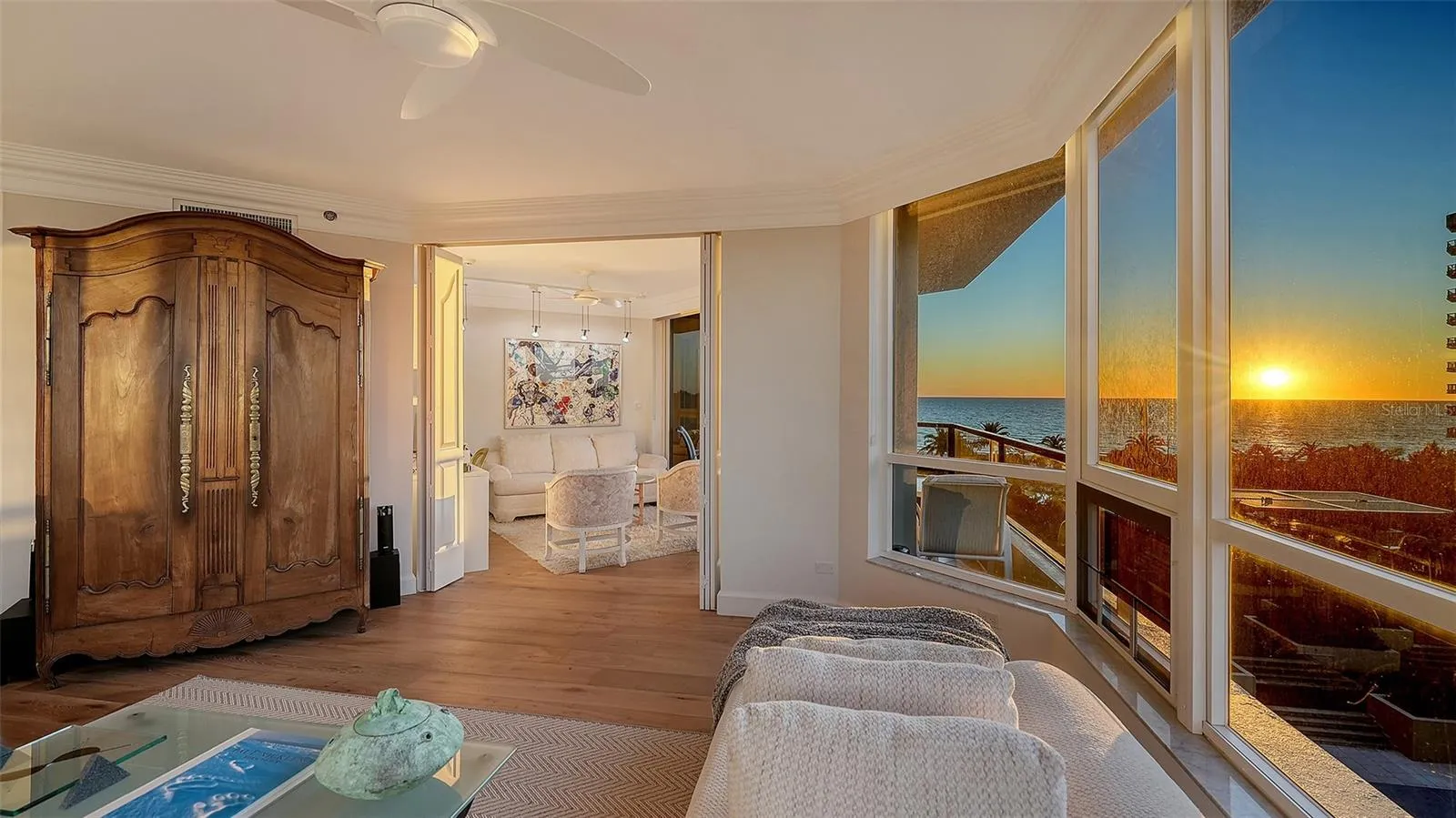 Rarely available north-side corner residence at The Promenade showcases panoramic views of the Gulf of Mexico, Sarasota Bay, white sandy beaches, and the sparkling city skyline. This beautifully designed 2,100 sq. ft. “E” floor plan features three bedrooms and three baths, with a spacious split layout that captures natural light and breathtaking vistas from every room. The expansive living and dining areas flow seamlessly to two private terraces—set your morning coffee down as you watch the sunrise over the bay, and end the day with a glass of wine while taking in the sunset over the Gulf. A stylish wet bar adds the perfect touch for entertaining. The kitchen is a showpiece, featuring 2022 installed Sub Zero refrigerator/freezer, GE Monogram stainless-steel induction cooktop and oven, ASCO dishwasher and GE Monogram microwave / convection oven combo, a white subway tile backsplash, quartz countertops, sleek contemporary white cabinetry, and an eat-in area overlooking the bay. Engineered white oak hardwood floors extend throughout, adding warmth and sophistication. The primary suite offers stunning Gulf views, built-in cabinetry, and two walk-in closets, while the guest suite enjoys downtown views and a private bath. The third bedroom/den opens to a terrace overlooking the Gulf. Includes one deeded parking space and access to resort-style amenities—concierge, 24-hour security, fitness center, an Olympic-size heated pool, four Har-Tru tennis courts, and more.