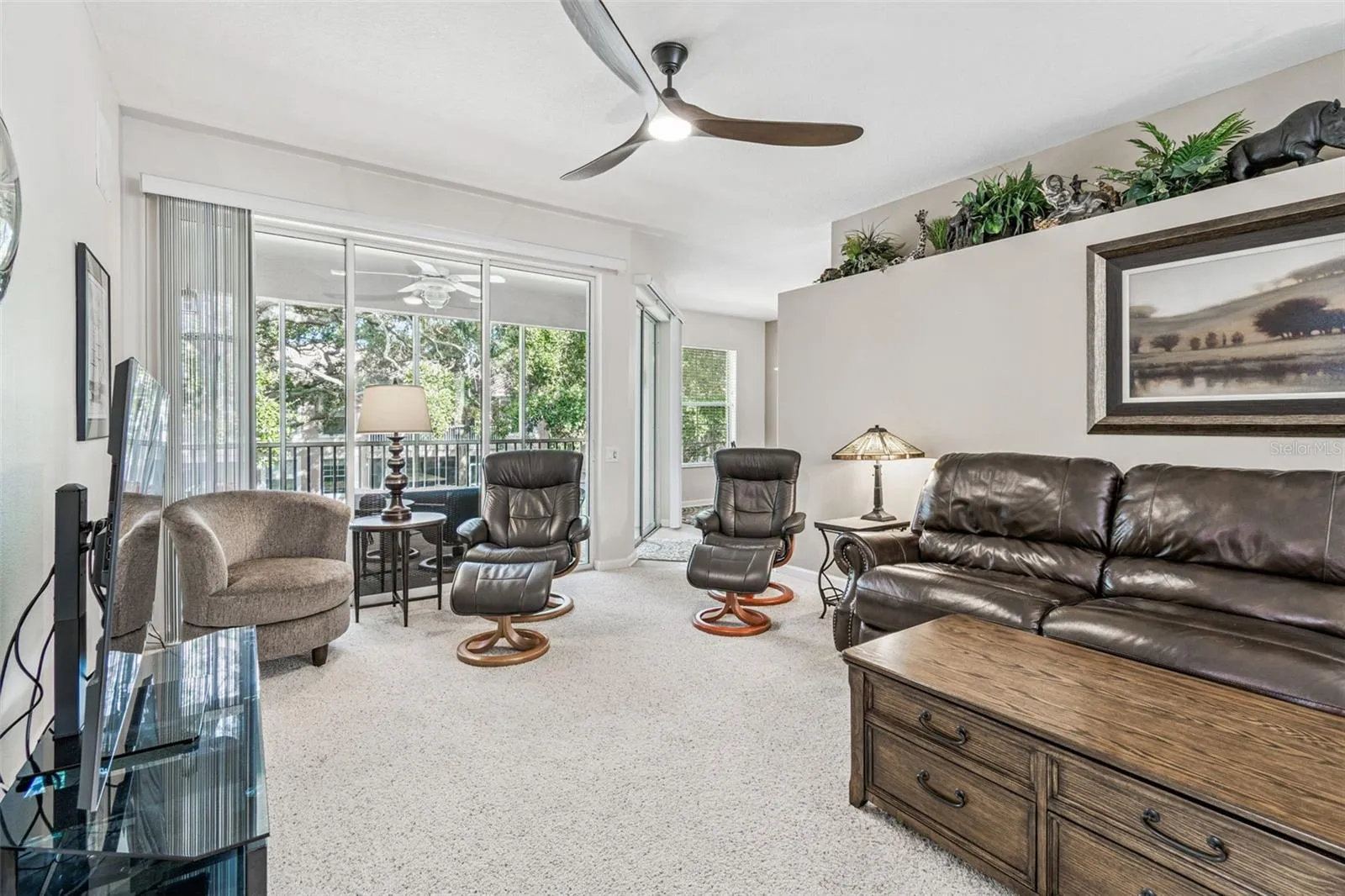 Immaculate turn-key ready furnished Coachman Reserve second floor, one level living condo. 70’ Elevation, above sea level. No Flood/No Evacuation Zones. Fast Close available. Second owner, second time used as a second home, minimal use both ownerships, no smoking, no pets. First floor Entrance/Foyer is tiled with a two-story open-air staircase with elegant sweeping carpeted curved steps leading up to second floor. The staircase is well lit with natural light. LED lighting throughout condo. Condo has 10‘ceilings with ceiling fans. Oversized sliding glass doors overlooking the Lanai make the Living Room, Breakfast Nook and Primary Bedroom bright with natural light. Dining Room is bright with natural southern light, flanked by the kitchen and staircase. Kitchen has considerable upper and lower cabinet storage, upgraded soft-close hardware and a wire shelf pantry closet, double sink with solid surface counter tops, 3-door refrigerator, with lower freezer. Solid surface Breakfast Bar between the sink and Breakfast Nook. Screened Lanai overlooks several mature Oaks and silly squirrels. Primary Bedroom is a spacious en-suite with a set of over-sized sliding glass doors overlooking the lanai, two walk-in closets and a small linen/toiletries closet. The Primary Bath is brightly lit, a double sink vanity with storage, a walk-in shower with tiled seat, separate Water Closet with new toilet/bidet fixture, and garden tub. The second bedroom is spacious with window seat. The third Bedroom is arranged as a Home Office with Hi-Speed Internet, bright with double-door entry. Bedrooms 2 & 3 are connected by a “Jack & Jill” bathroom. The second Bathroom is a single-single sink vanity with storage, tub/shower, toilet and wire shelf linen/storage closet. The Laundry room is located close to the bedrooms with 12’ of wire shelving storage above new LG washer/dryer set (2024). The Garage has both a vehicle door, interior condo door and a side entry door. Whole-house water softener, new water heater (2024) located in the garage. Wire shelving on two long walls of the garage. Includes original custom Hurricane shutters, Hurricane rated Garage Door with Opener, fire sprinkler system. New Daikin A/C (2024). Alarm system is operable; service is a third-party vendor. Coachman Reserve has a conservation area with refreshed mature landscaping creating a park-like community. Two-entrance gated private loop road with 144 condos. The Fitness Center houses mailboxes, a well-equipped fitness center, and heated open-air community pool. Pet-friendly. Waste-water lift-station generator (2019) in case of power outages. Minutes to Whole Foods, Sprouts, multiple grocery stores, shopping malls, dining, entertainment. Easy access to famous sugar sand Clearwater Beach & Honeymoon Island. Easy access to Tampa International Airport, Clearwater-St Pete Airport, and St Pete Tampa.