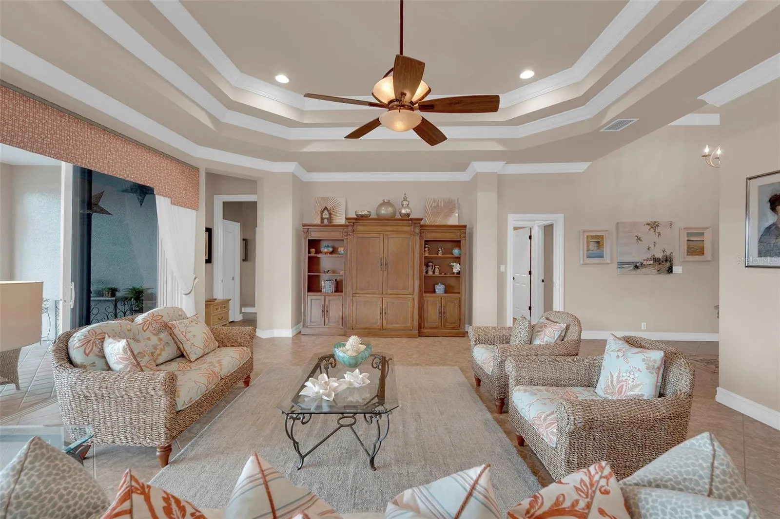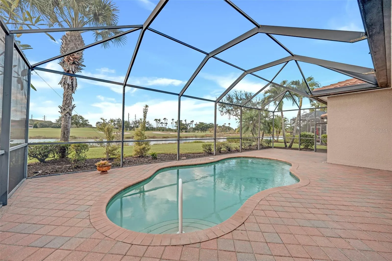 Welcome to 3221 Orangetree Bend, a beautifully maintained single-family home located in the gated community of Verandah in Fort Myers. Offering breathtaking golf course, lake, and landscaped views, this 2-bedroom and a den, 2-bath residence with over 1,835 square feet of living space seamlessly blends comfort, elegance, and Florida lifestyle living. Step inside to discover an inviting open-concept floor plan highlighted by vaulted and tray ceilings, rich tile and wood flooring, and an abundance of natural light streaming through. The chef’s kitchen features a spacious double island, walk-in pantry, and modern stainless steel appliances- perfect for entertaining or everyday living. The primary suite is a peaceful retreat complete with dual sinks, a walk-in closet, and a beautifully tiled shower, while the split-bedroom layout ensures privacy for guests. Step outside to your private hurricane screened lanai and pool, overlooking the shimmering lake and golf course, a serene backdrop for morning coffee or sunset gatherings. This home includes a two-car attached garage, paver driveway, and lush tropical landscaping. Located in the sought-after Verandah community, residents enjoy access to an optional golf membership which offers 36 holes, scenic walking and biking trails, and resort-style amenities that celebrate the best of Southwest Florida living.