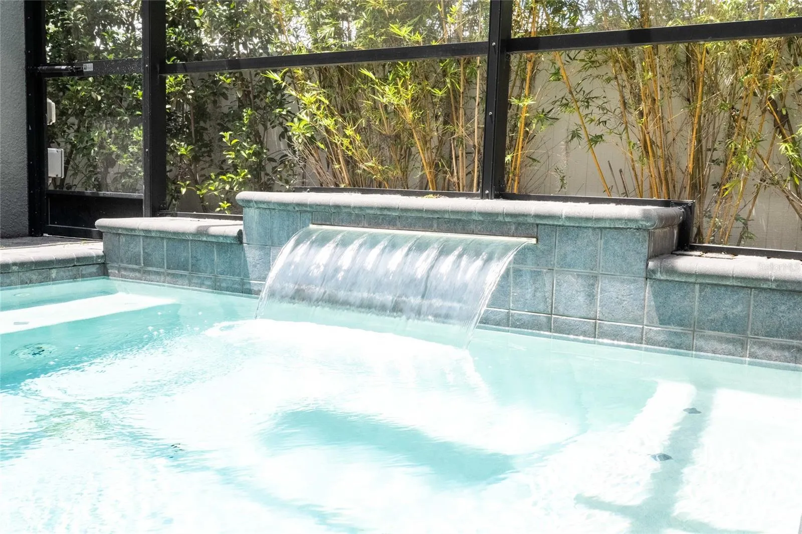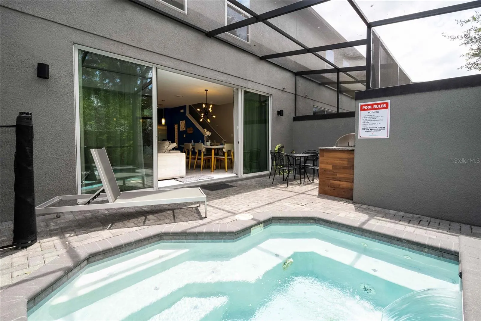 A true oasis awaits outside: a private, screened-in heated pool and summer kitchen, perfect for unwinding after a long day at the parks.