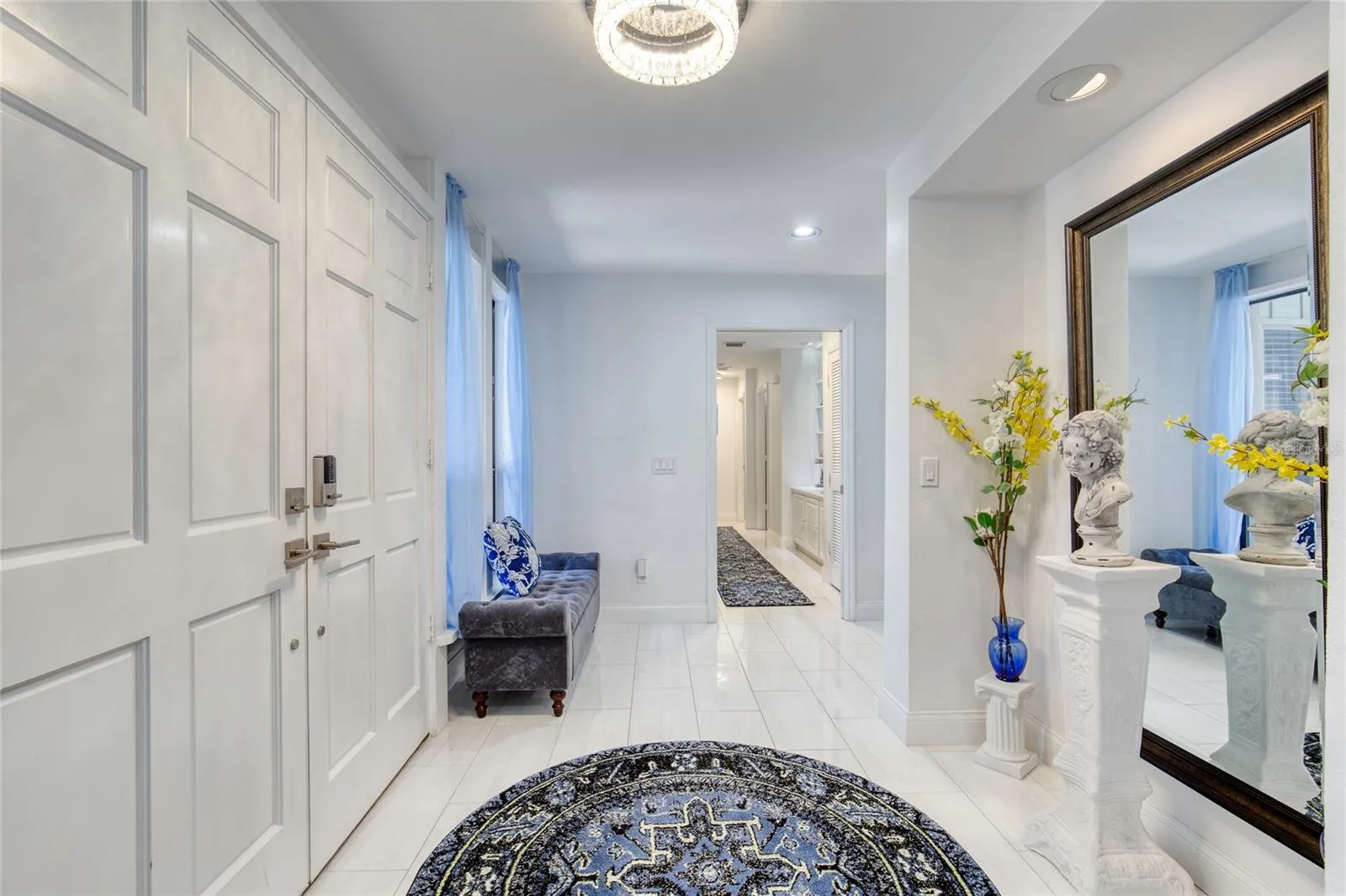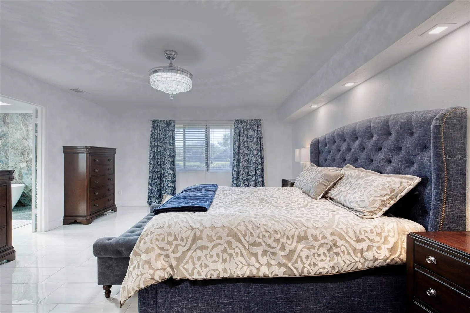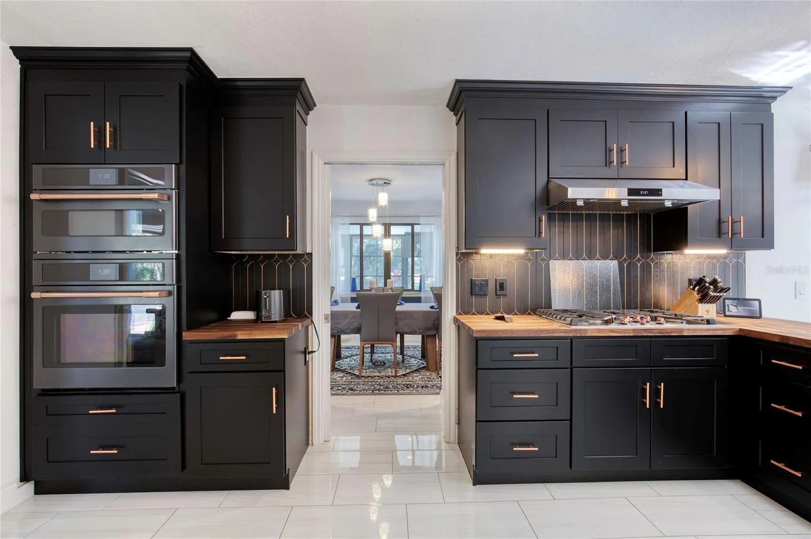 This extraordinary, designer-renovated 4-bedroom, 3-bath residence offers over 2,600 square feet of luxurious living space, modern efficiency, and breathtaking golf course views in beautiful New Smyrna Beach. From the moment you arrive, the inviting curb appeal, upgraded landscaping, and spacious circular driveway showcase the quality and care invested in this home. Inside, soaring architectural ceilings reach up to 15 feet, filling the space with natural light that highlights the polished white porcelain tile flowing seamlessly throughout and the upgraded lighting that illuminates every detail. The home’s gourmet kitchen is a true showpiece—completely renovated in 2024 with high-end Café brand appliances featuring a black and rose-gold finish, a gas stove with stainless-steel vent hood, butcher block countertops, double ovens with one doubling as a microwave, a wine cooler, and abundant cabinetry offering exceptional storage. The living room features a stunning blue porcelain-tiled fireplace, creating a cozy and stylish focal point for gatherings. The main wing of the home includes spacious bedrooms with excellent storage, while the primary suite offers a lavish, spa-inspired bathroom showcasing premium 4′ x 4′ porcelain tile, a large walk-in shower, and gorgeous finishes throughout. An instant hot water system ensures you will never run out of hot water, and dual-zoned A/C allows you to close off areas of the home when not in use, promoting energy efficiency without sacrificing comfort.